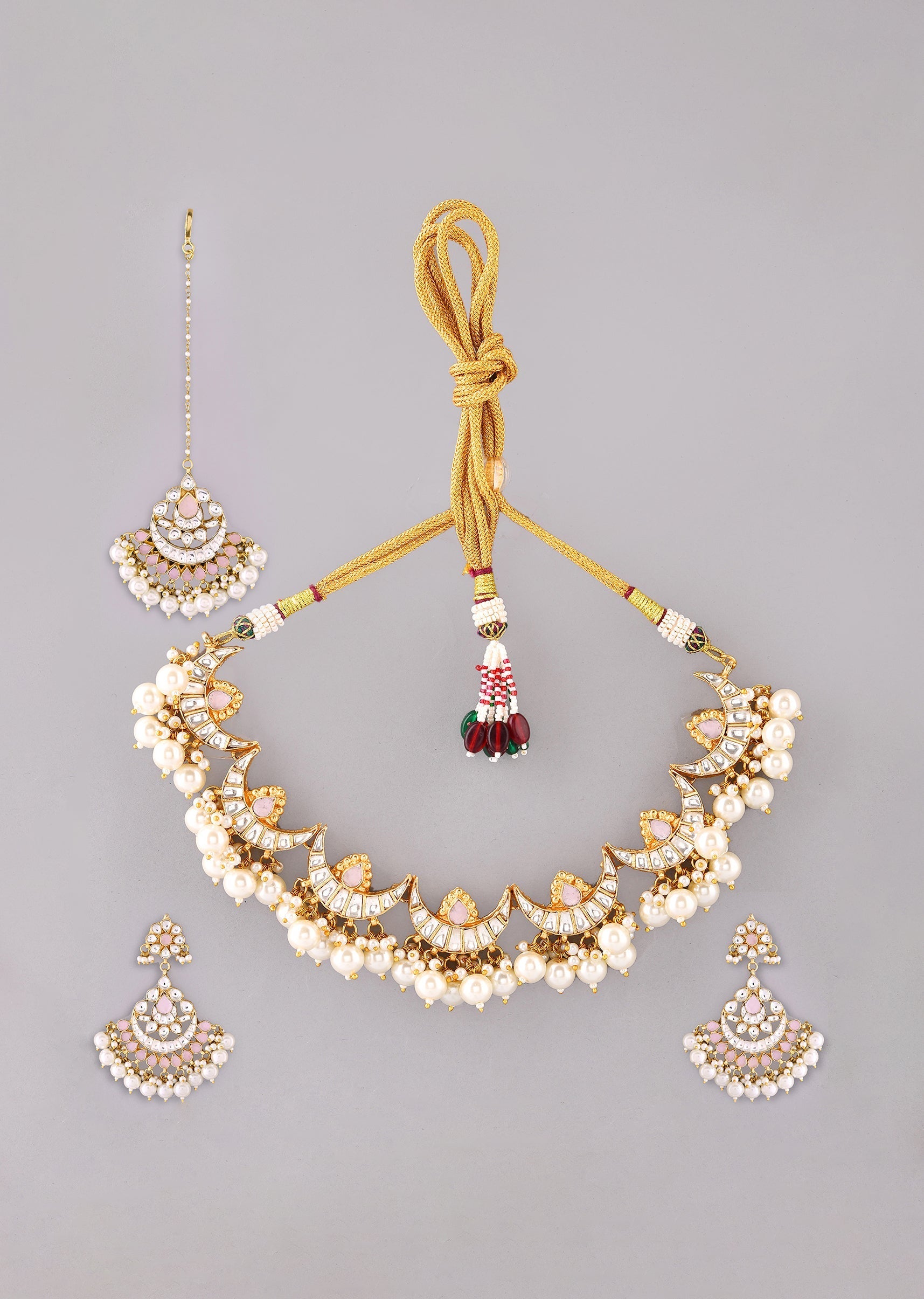 White Kundan Crescent Motif Necklace Set with Maangtikka