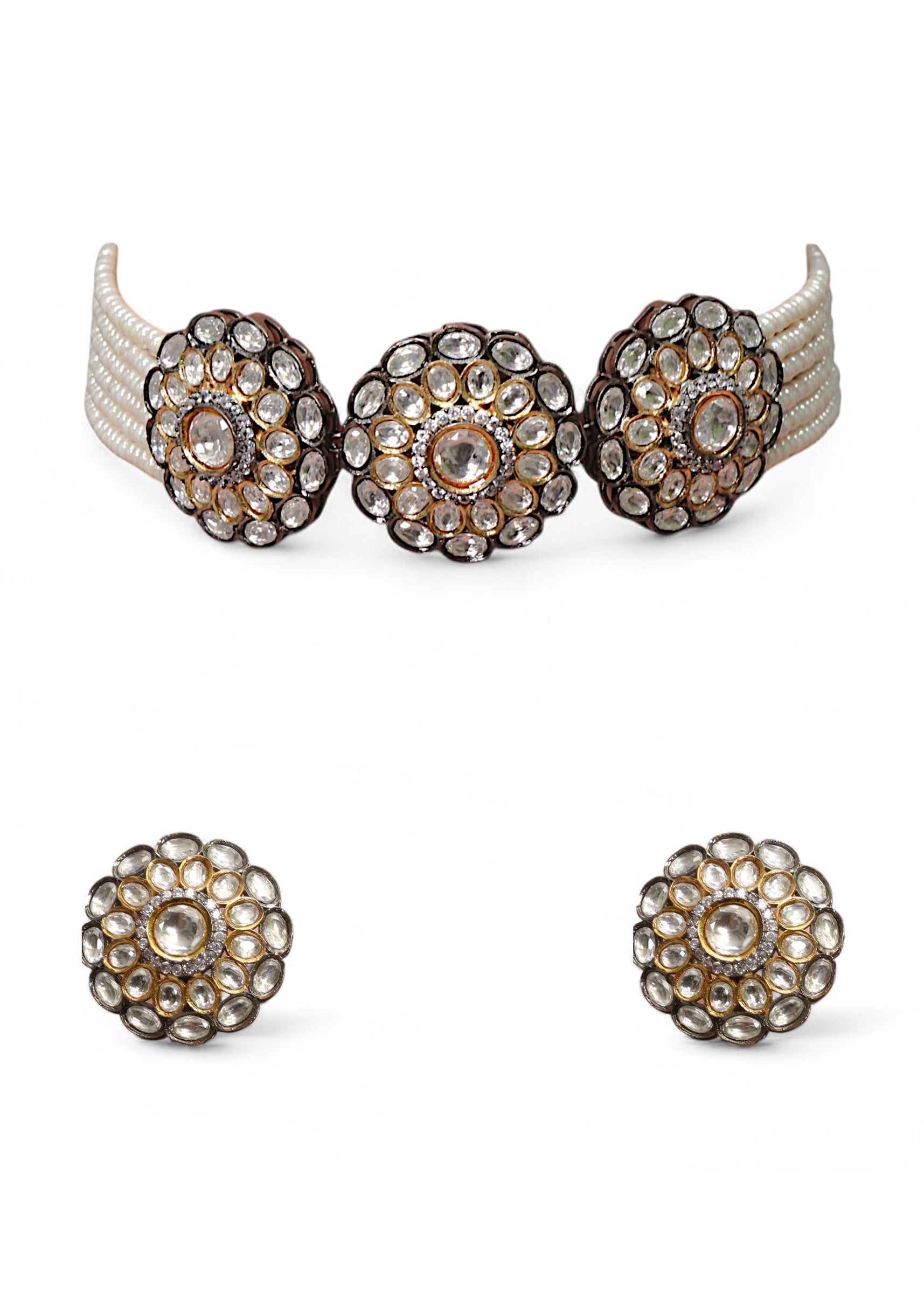 A white kundan floral pendant necklace set featuring delicate floral motifs and shimmering kundan stones, exuding timeless elegance and traditional charm. Perfect for adding a graceful and regal touch to... More Product Details