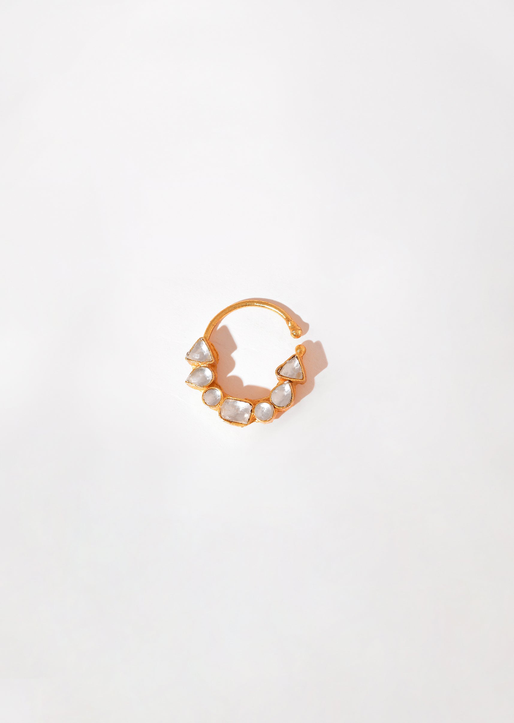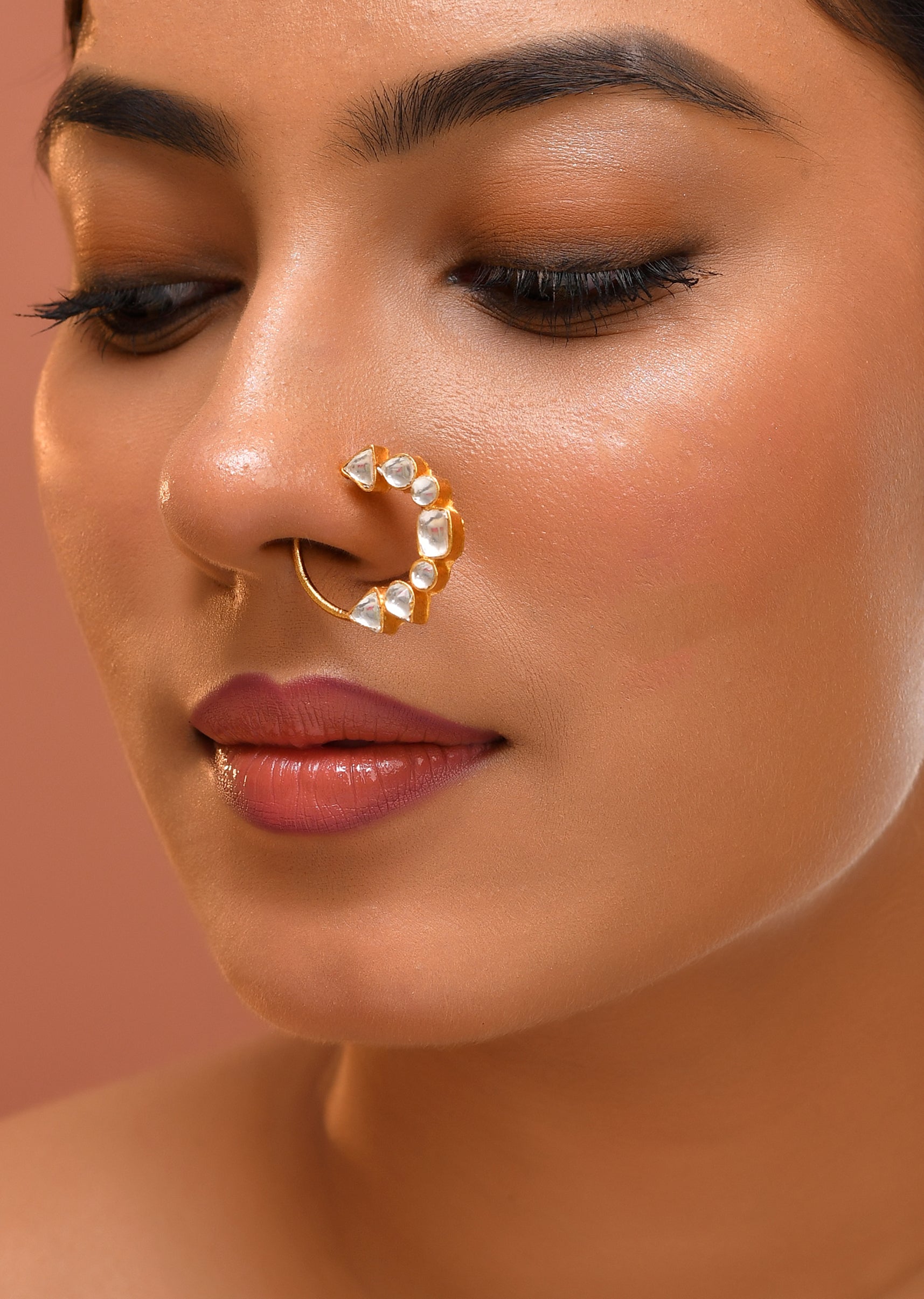 Add a touch of contemporary elegance to your traditional look with this white kundan geometric nath, designed with clean lines and intricate stone detailing. Perfect for weddings or festive occasions,... More Product Details
