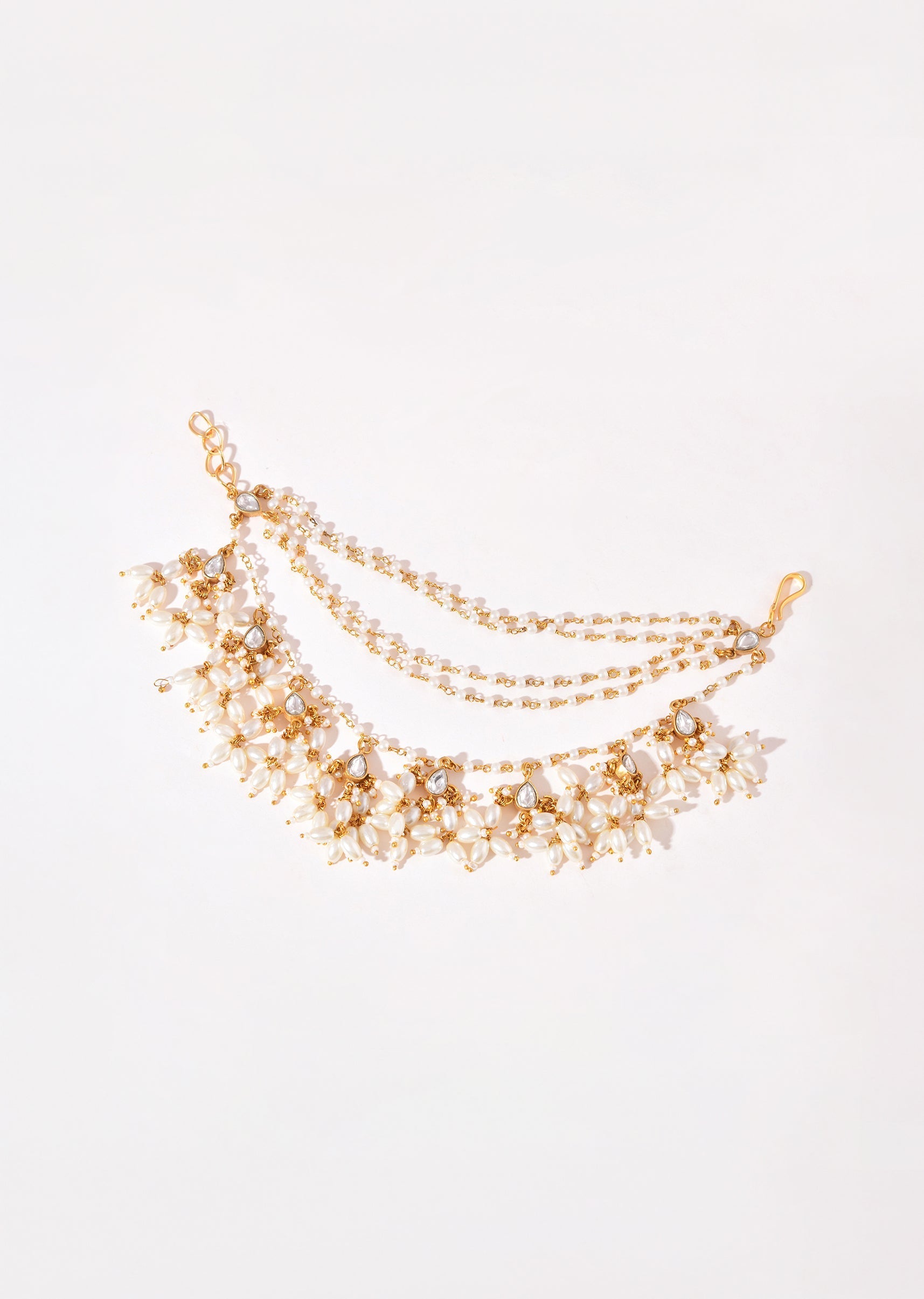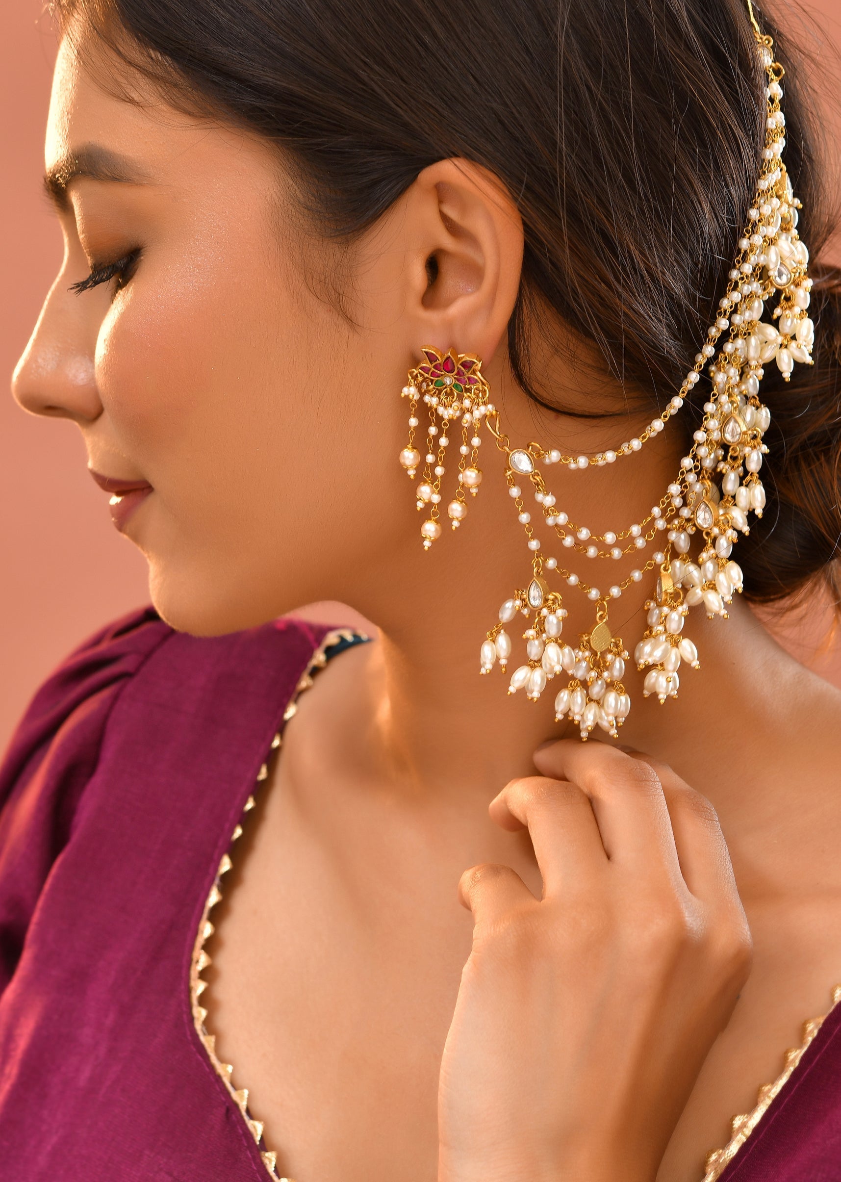 Add a touch of ethereal elegance with this white kundan layered cluster bead drop earchain set, featuring cascading bead clusters that create a soft, graceful shimmer. Perfect for weddings or... More Product Details