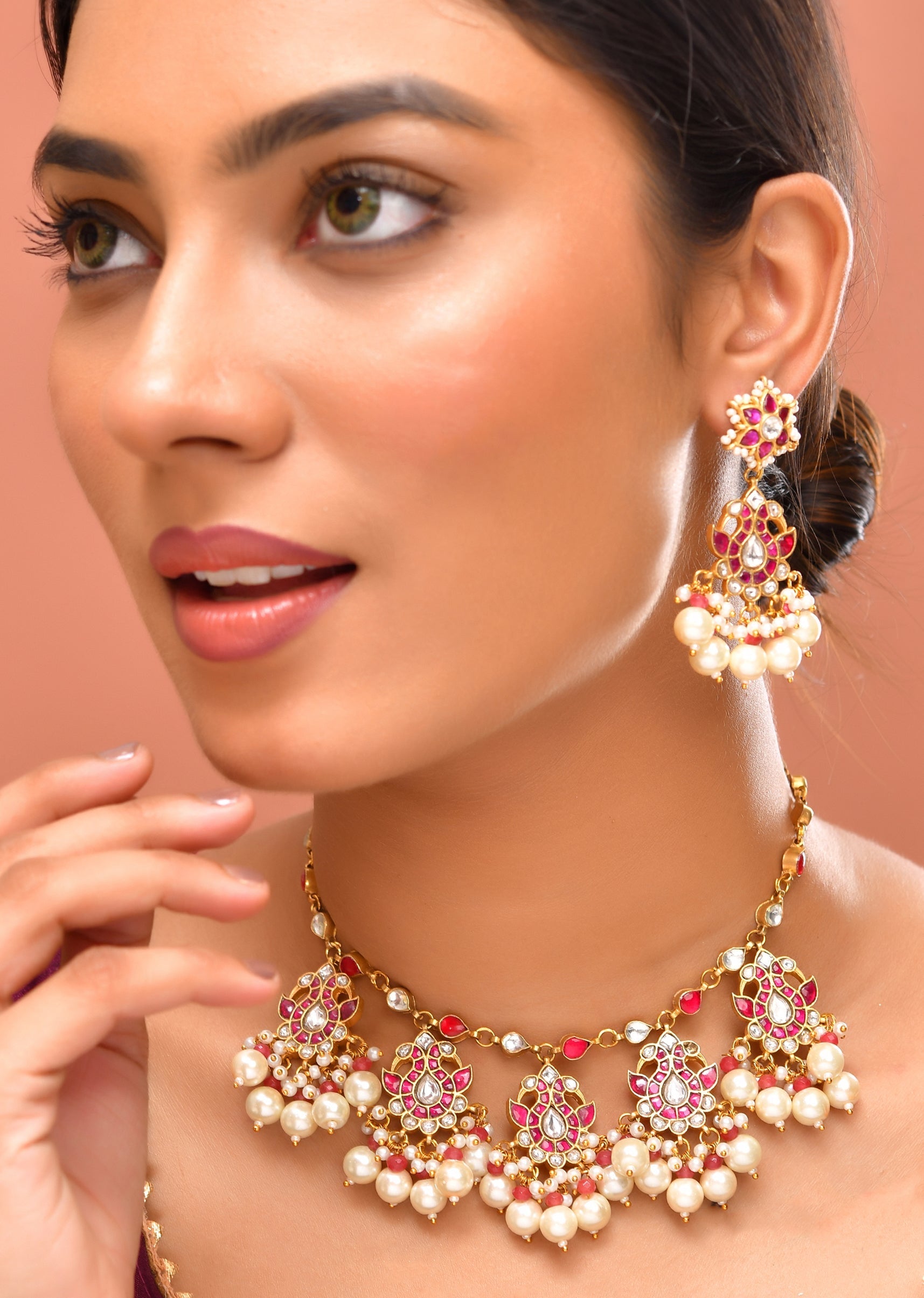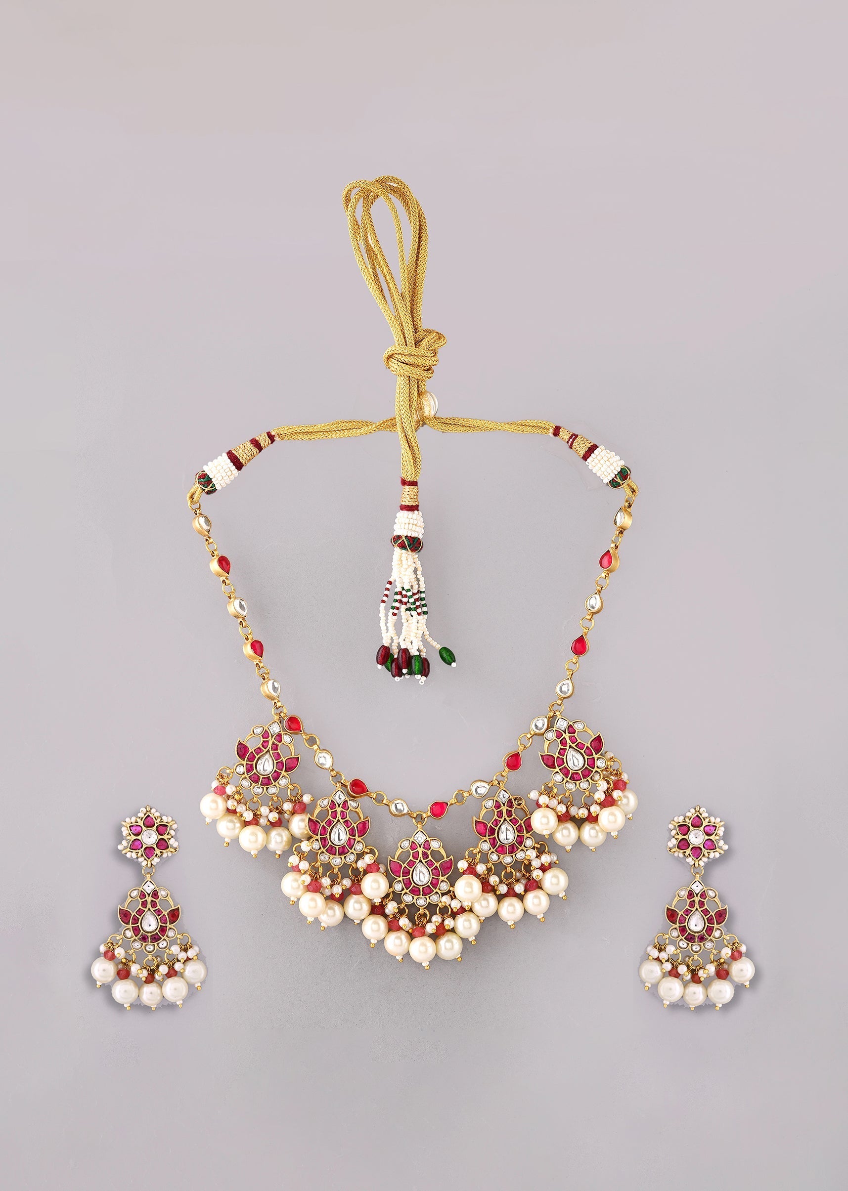 Add refined elegance to your look with this white kundan pendant drop necklace paired with matching floral dangler earrings. Perfect for festive and formal occasions, the set brings a delicate,... More Product Details