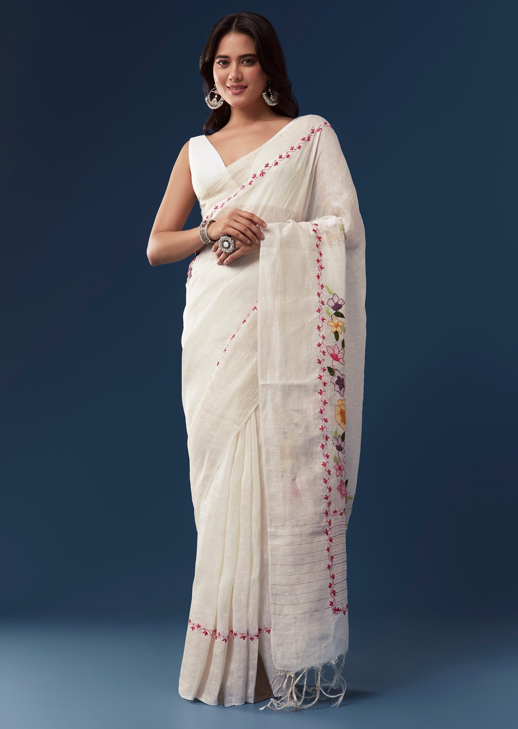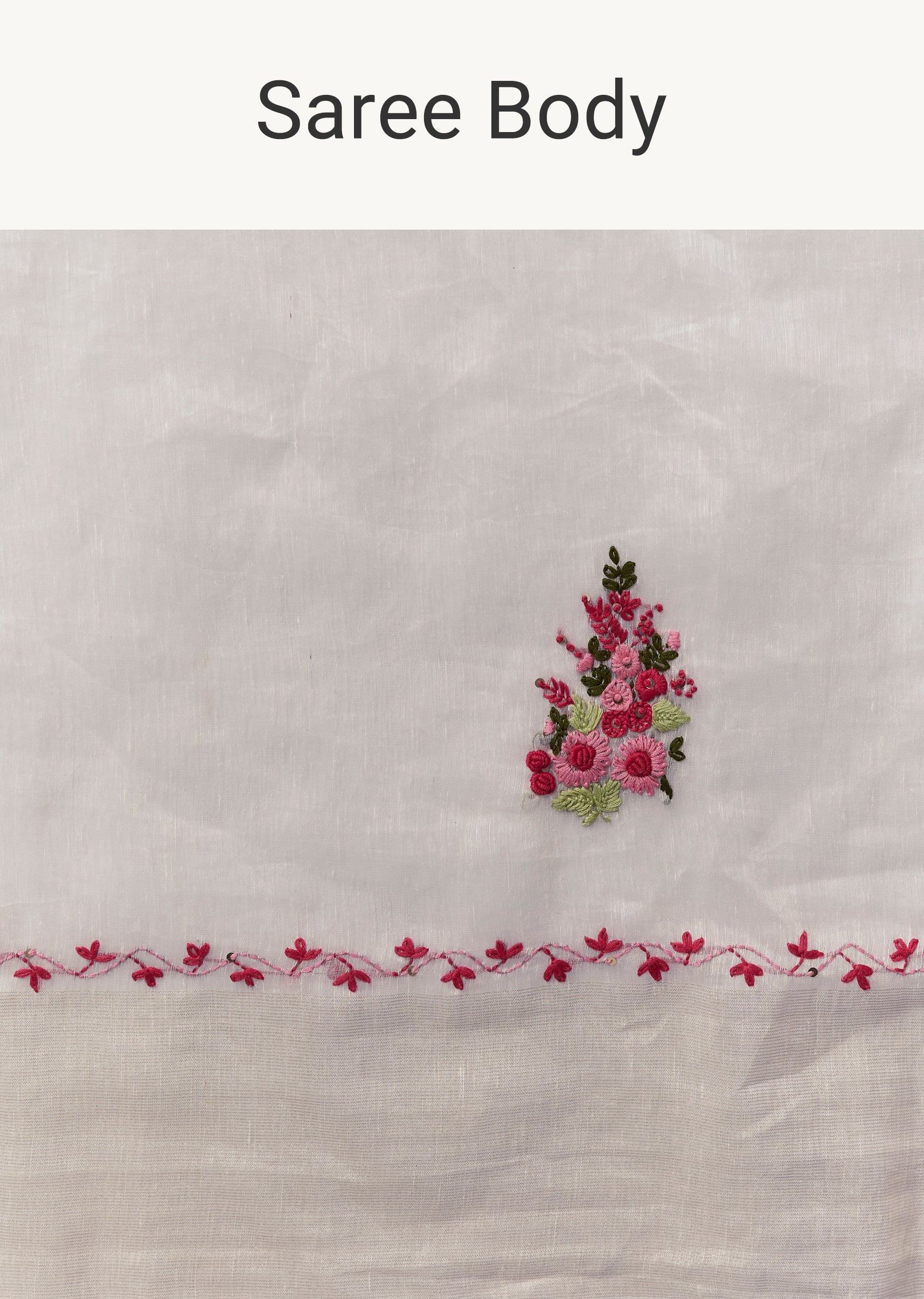 White Linen Saree With All Over Floral Resham Embroidery