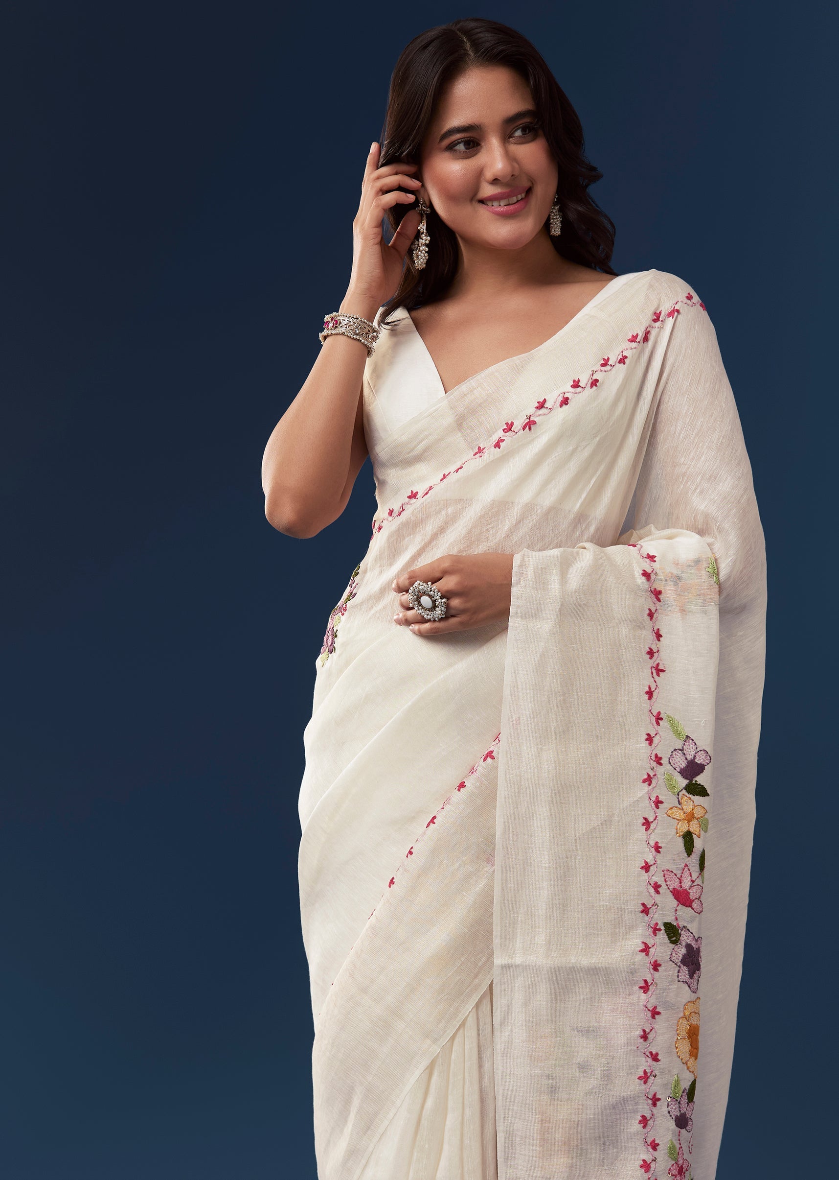 This white linen saree exudes casual elegance with its crisp texture and soft drape. The saree is adorned all over with delicate floral hand embroidery in resham thread, creating a... More Product Details