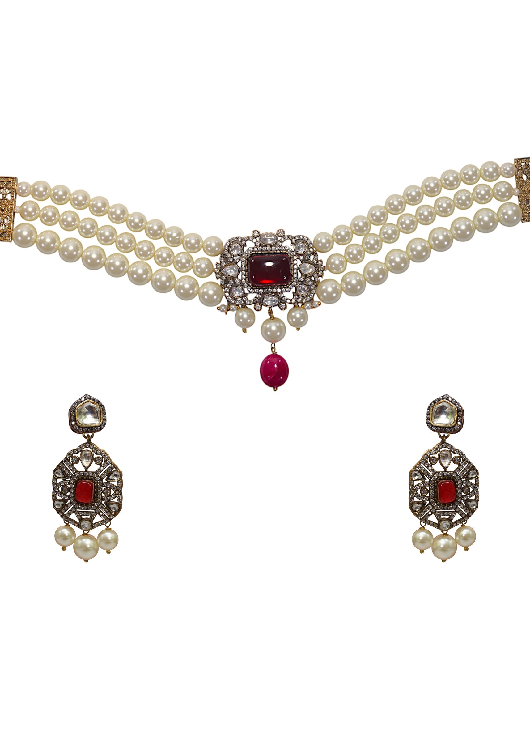 A white modern polki geometric pendant necklace set featuring shimmering polki stones arranged in sleek geometric patterns, blending modern sophistication with traditional allure. Perfect for adding a refined and elegant... More Product Details