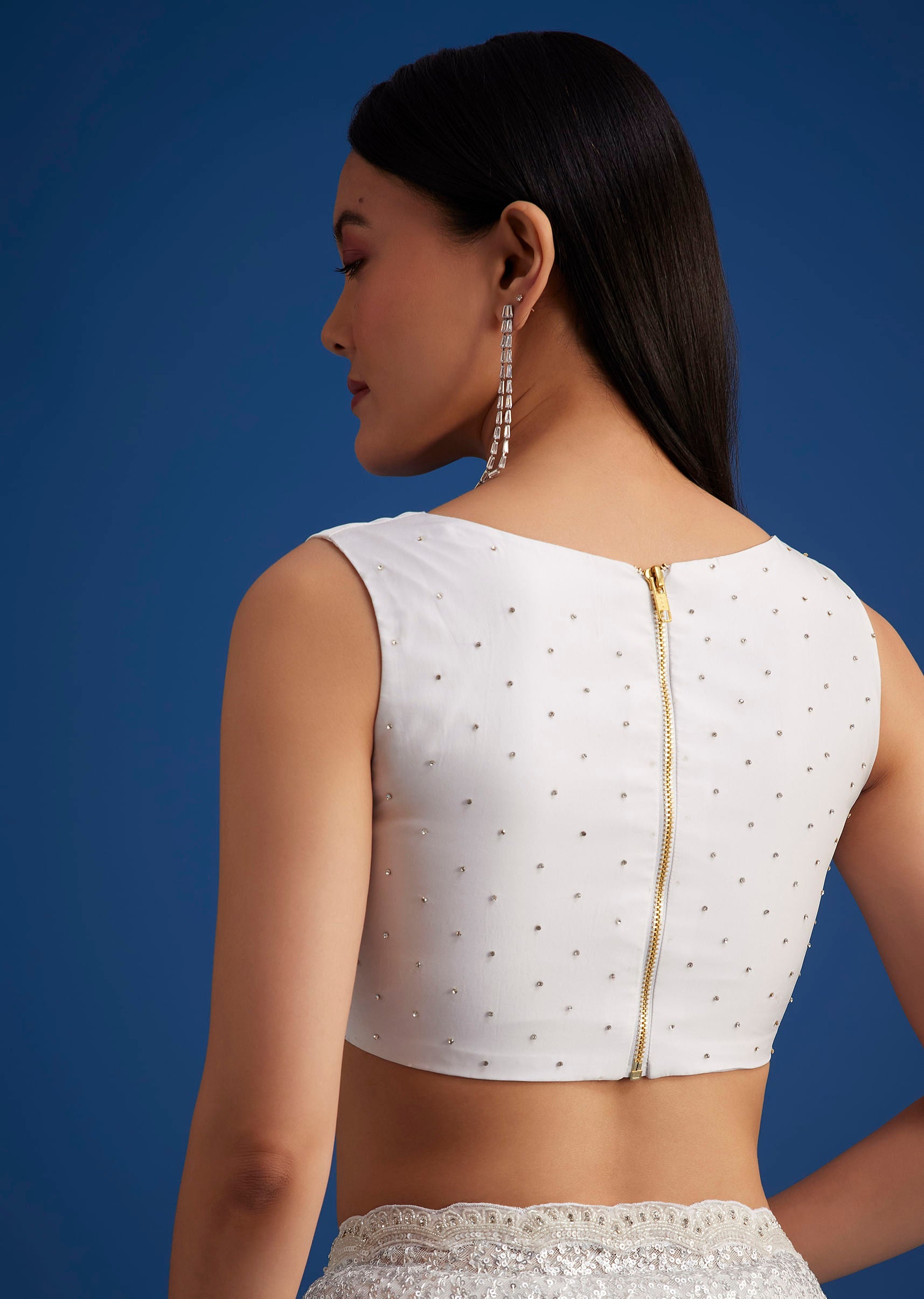 - This exquisite white saree is crafted from soft net fabric, adorned with shimmering sequins that sparkle with every movement.