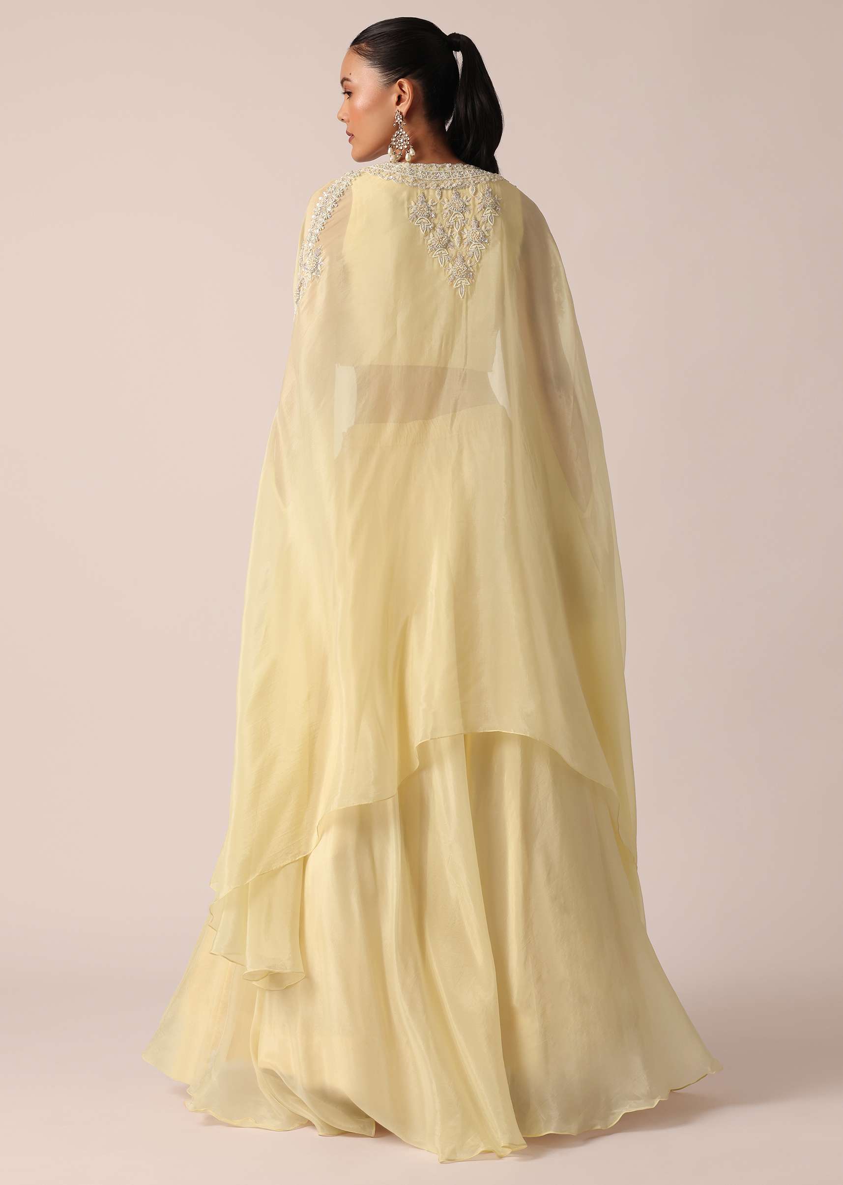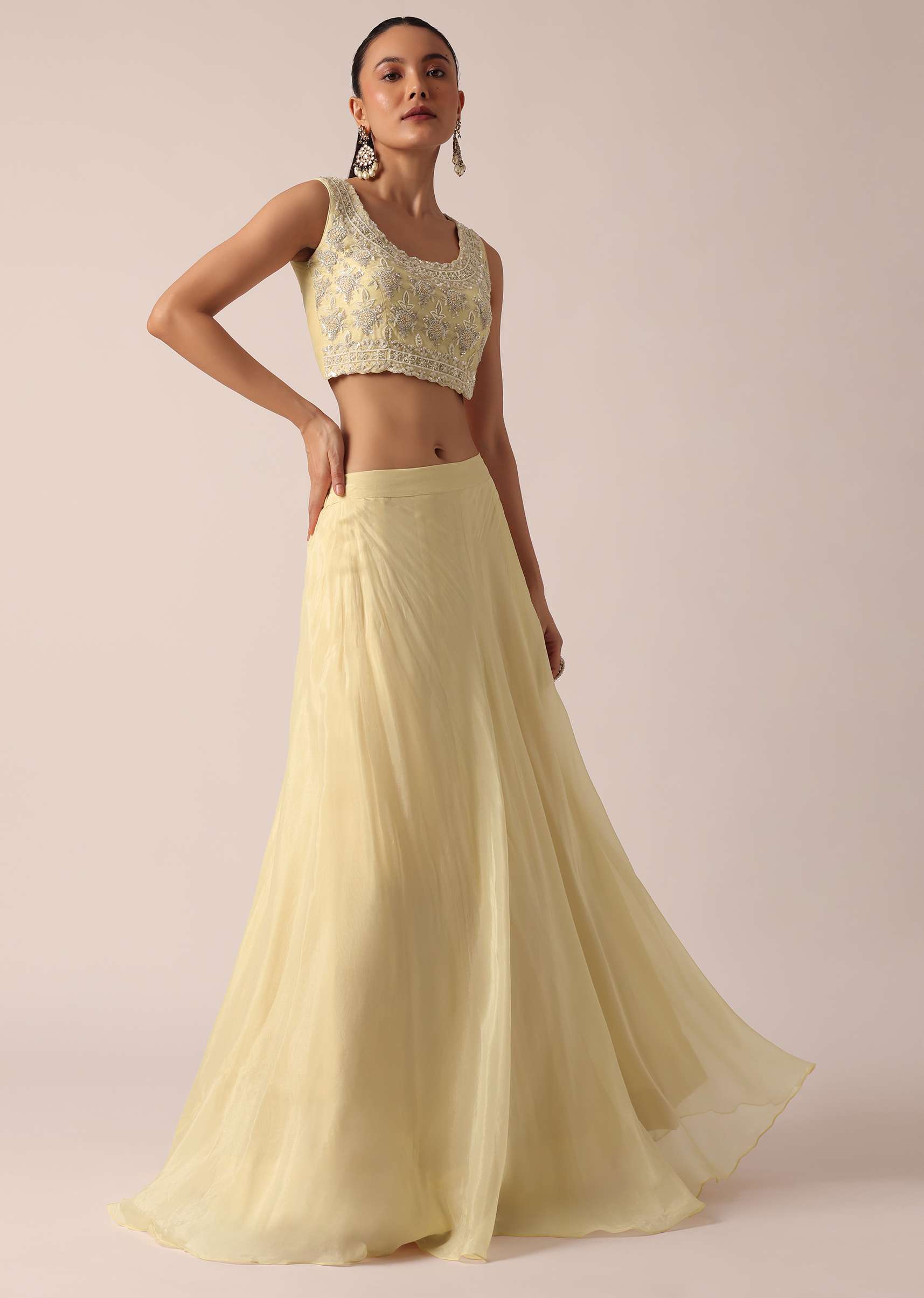 Don this indo-fusion set at the next festive celebration to be the fashionable star of the event. The flowy and alluring set features a flowy lehenga paired with a long jacket. Enhanced with sali, cutdana, beads, sequin accents, the blouse showcases a round neckline. Promising to be your go-to outfit, this set will keep the compliments rolling. Awarded as the Most Trusted Brand, we're delivering styles you love, just as promised.