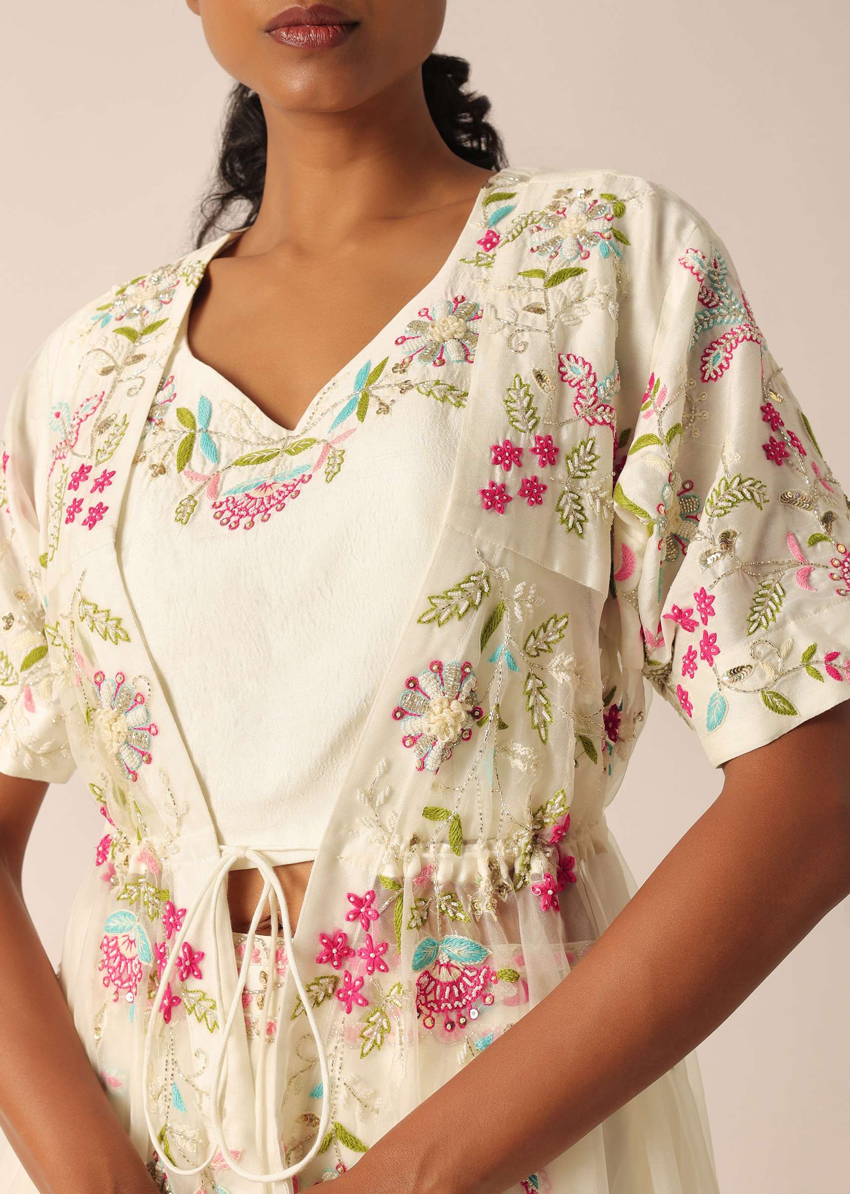 White Organza Jacket And Silk Lehenga Set With Embroidered Detail