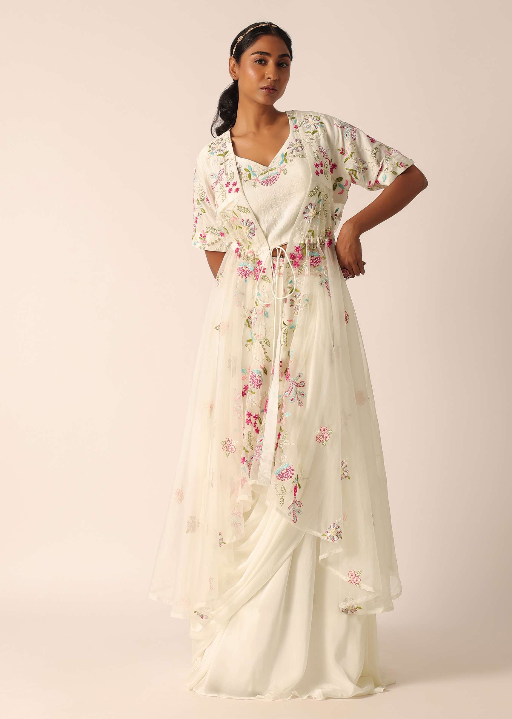 Showcase an ethereal look at the next festive family gathering by stepping out in this indo-fusion ensemble. Featuring a sheer organza long jacket, elevated with embroidered motifs. Paired with a... More Product Details