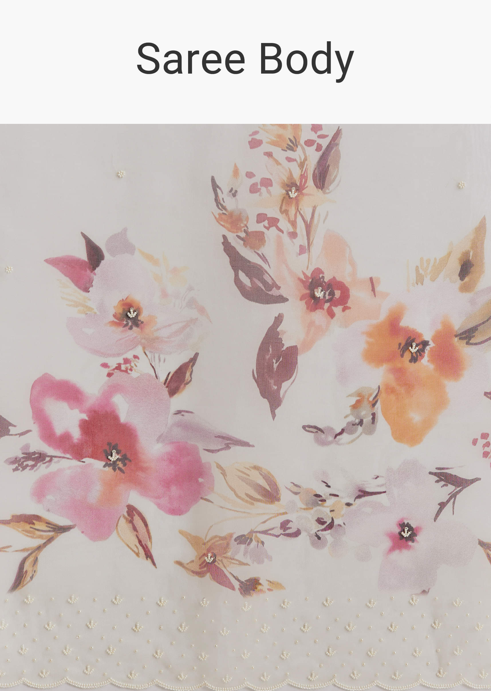 Sunlit moments feel fresh in this white organza printed saree that moves beautifully in pictures. Multicolour floral prints meet a scallop border and bead embroidery on the saree and blouse,... More Product Details