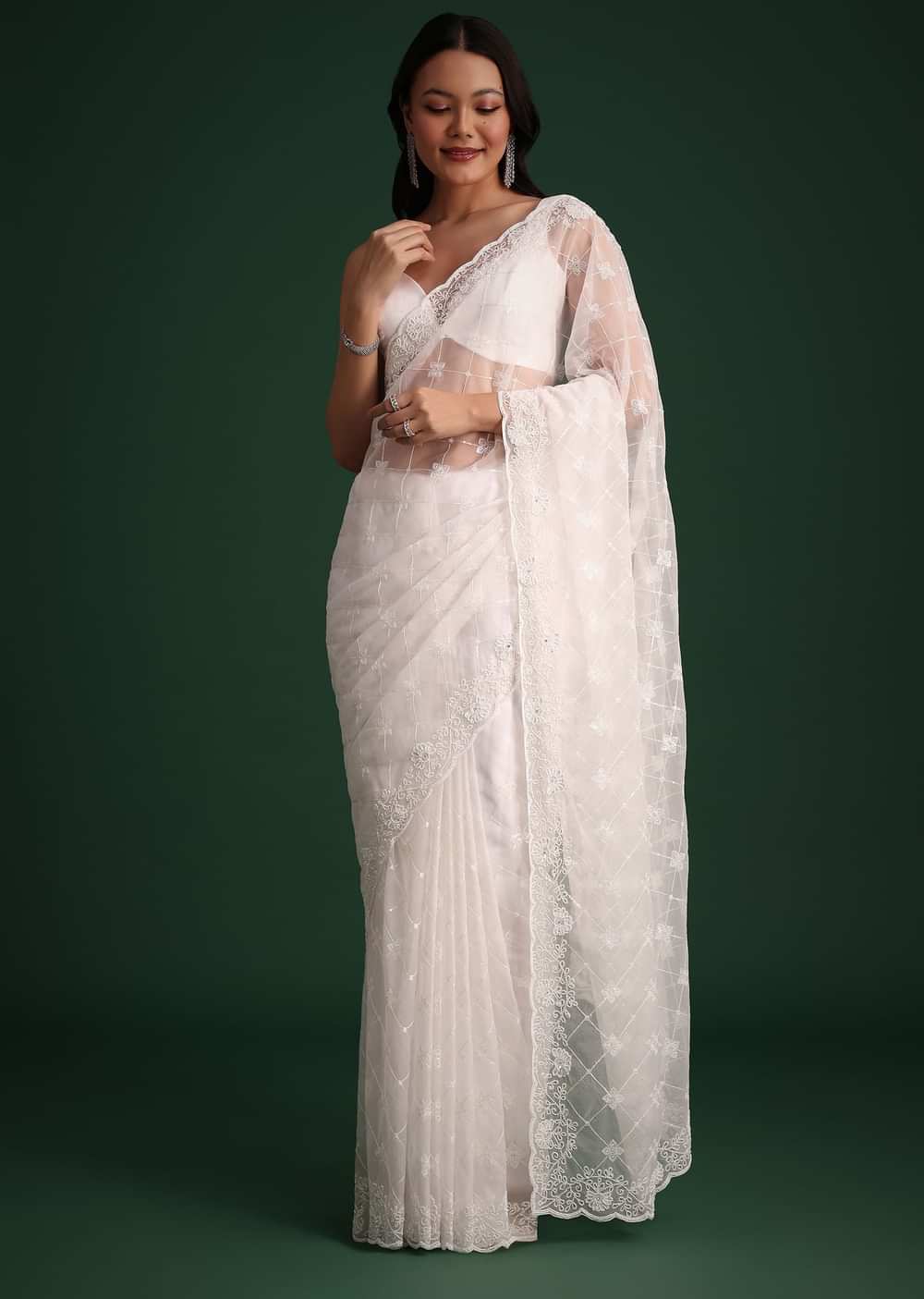 Delicate and dreamy this white organza saree is adorned with cutdana and sequin embroidery that adds a touch of sparkle to its ethereal fabric. Perfect for receptions or daytime festivities... More Product Details