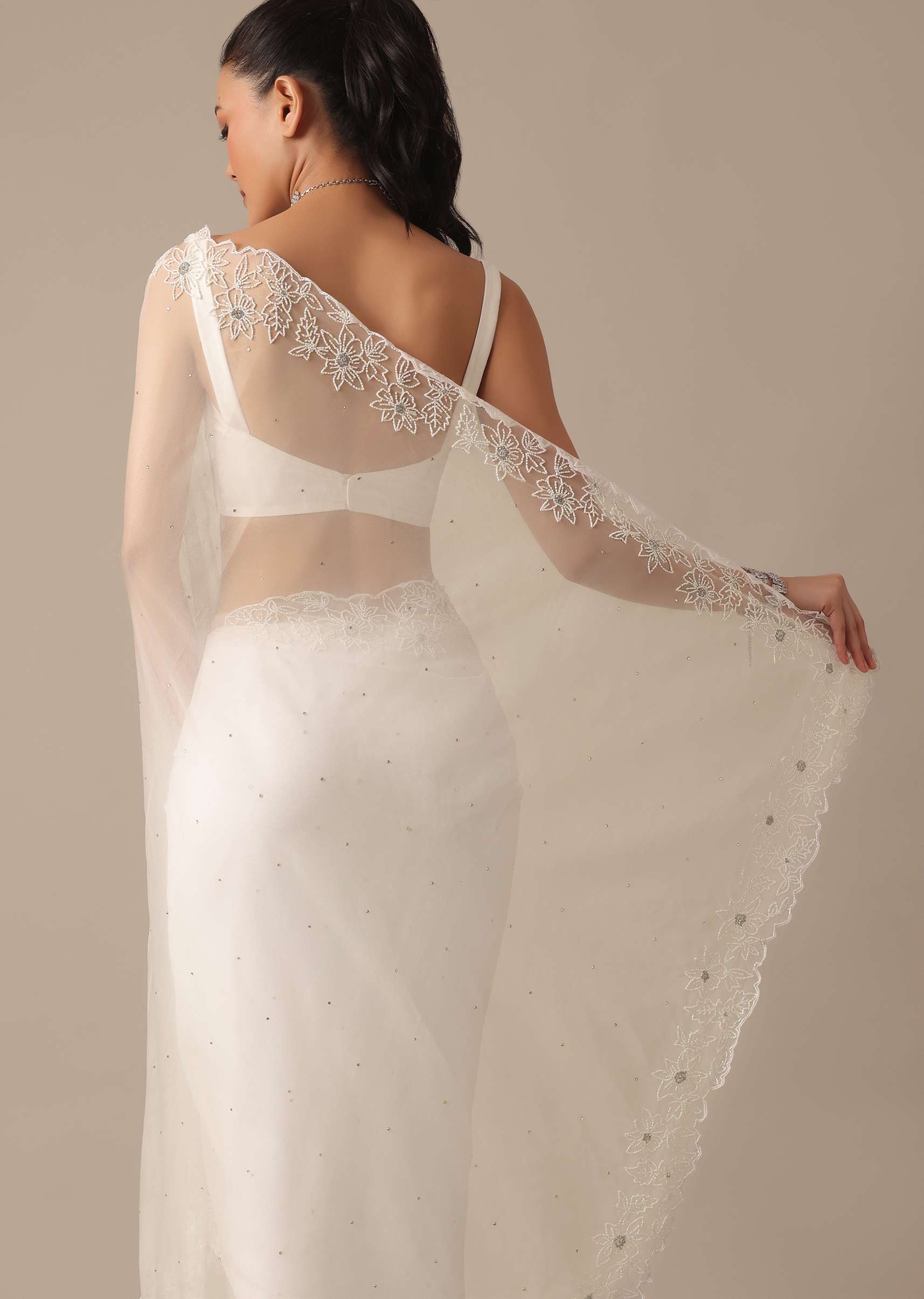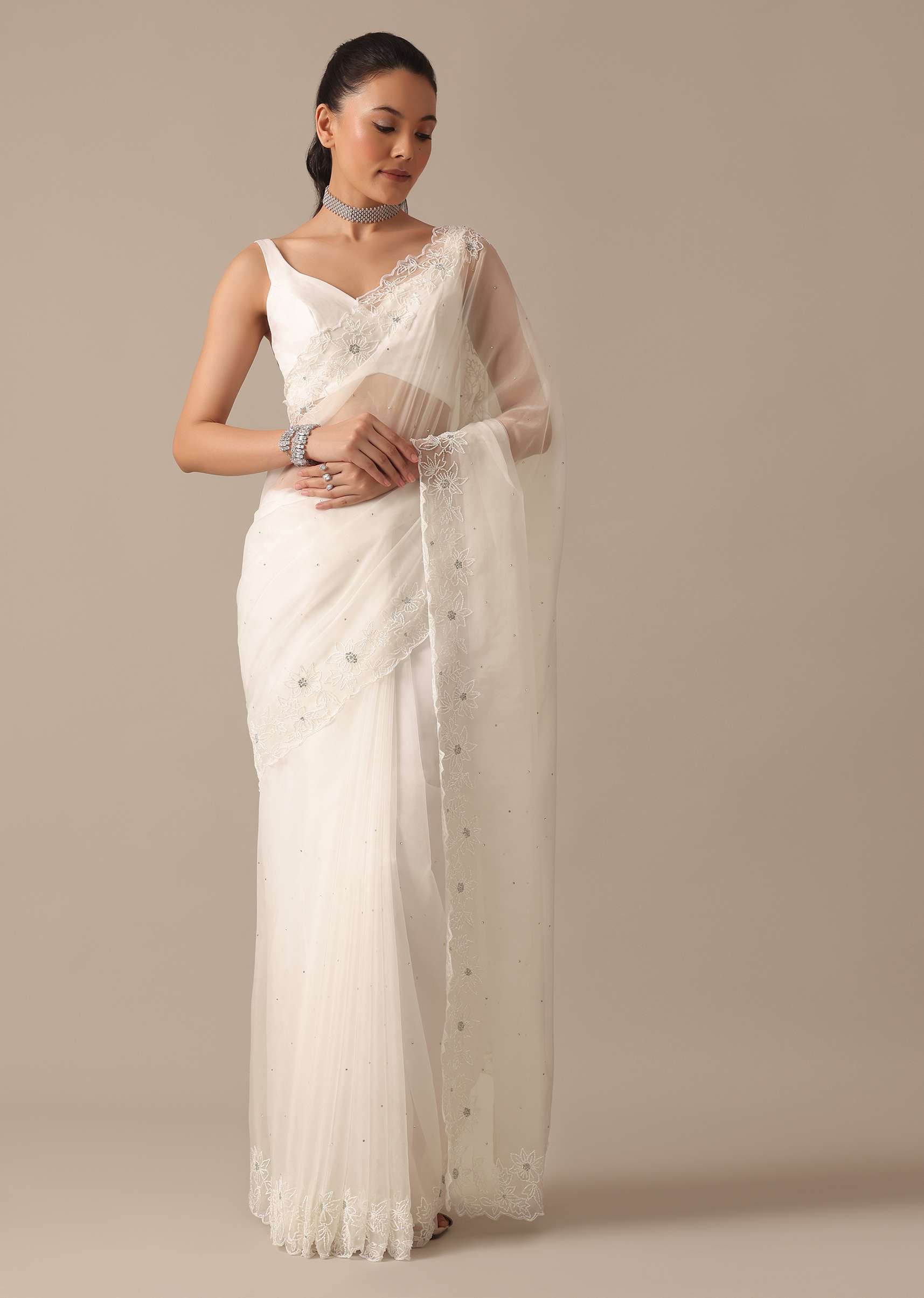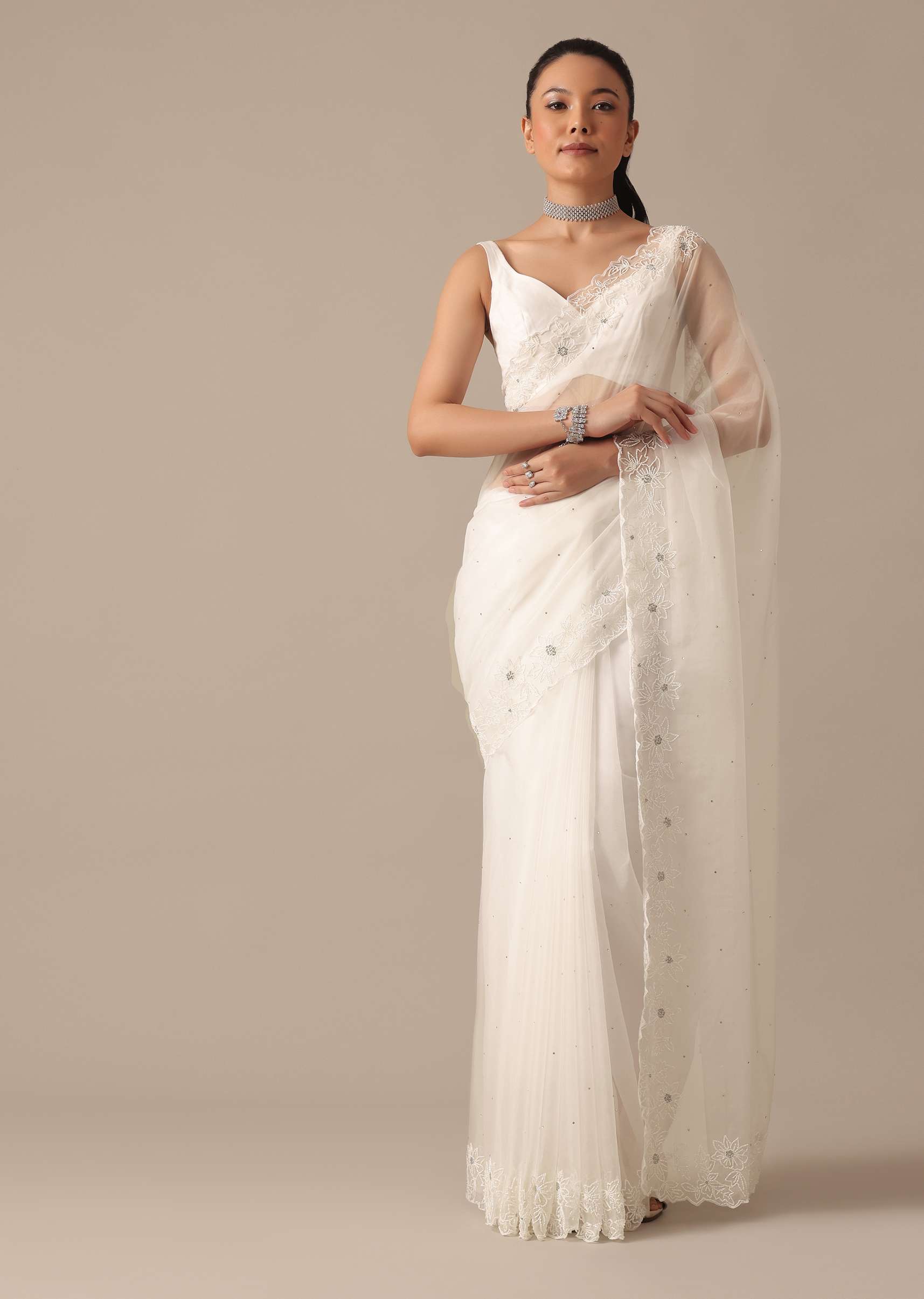 White Organza Saree With Cutdana Work And Unstitched Blouse Piece