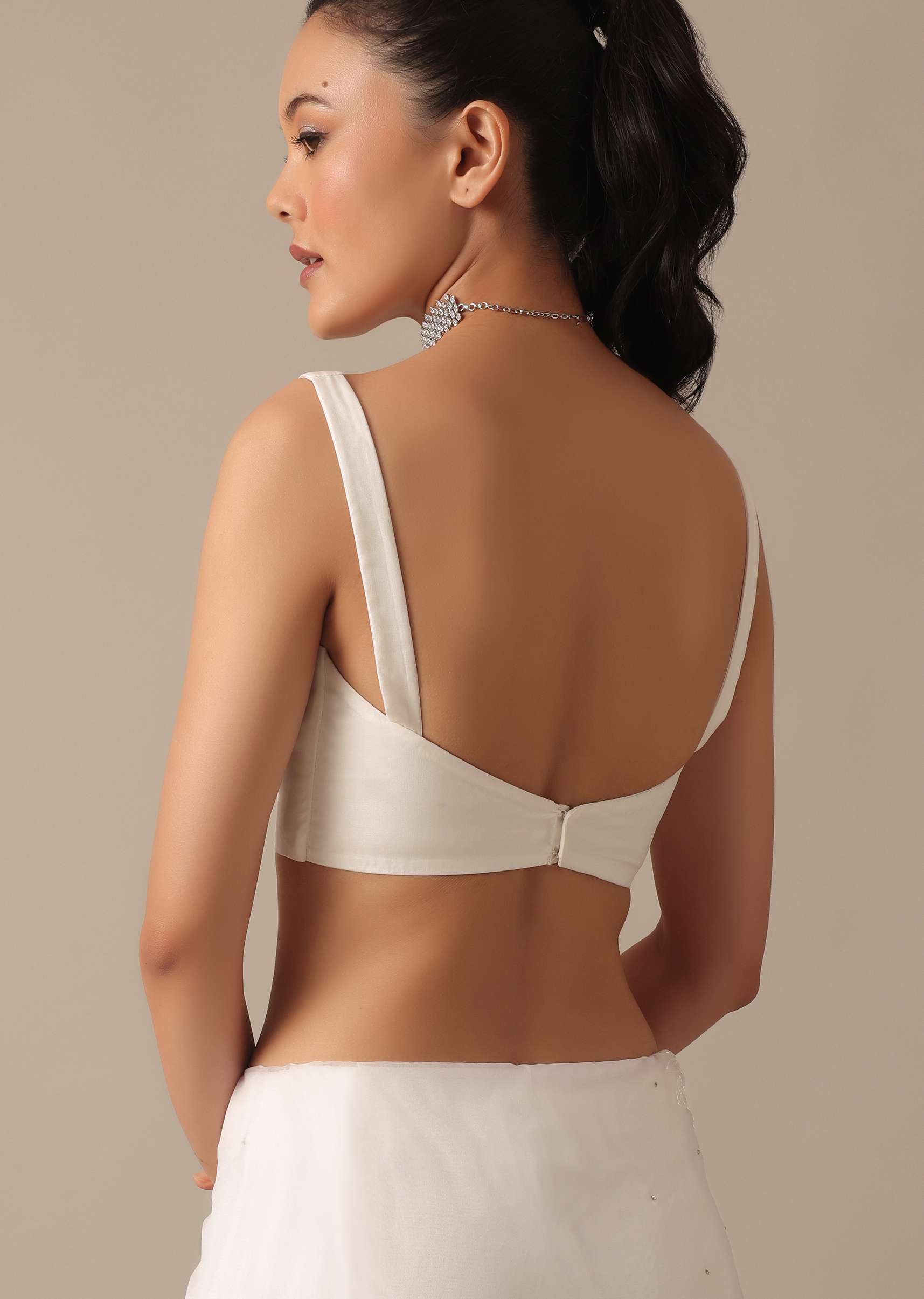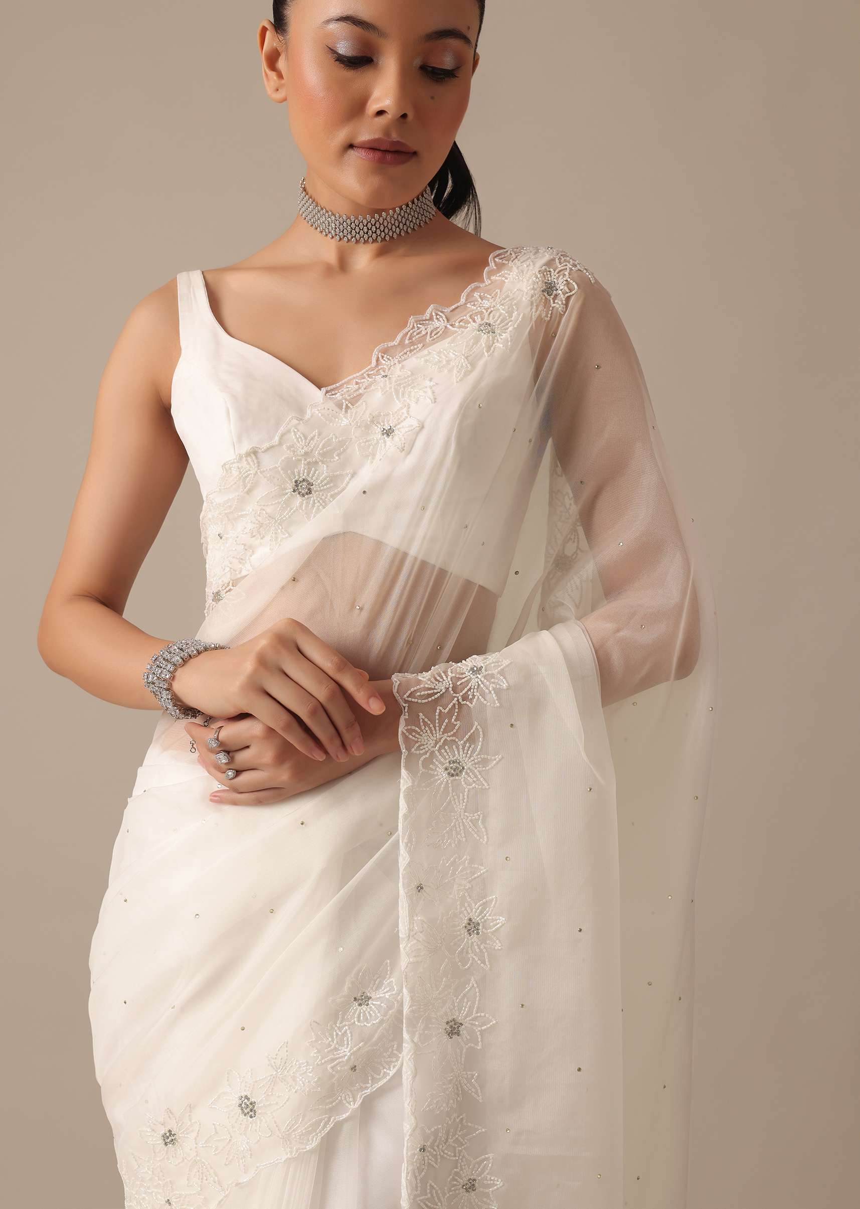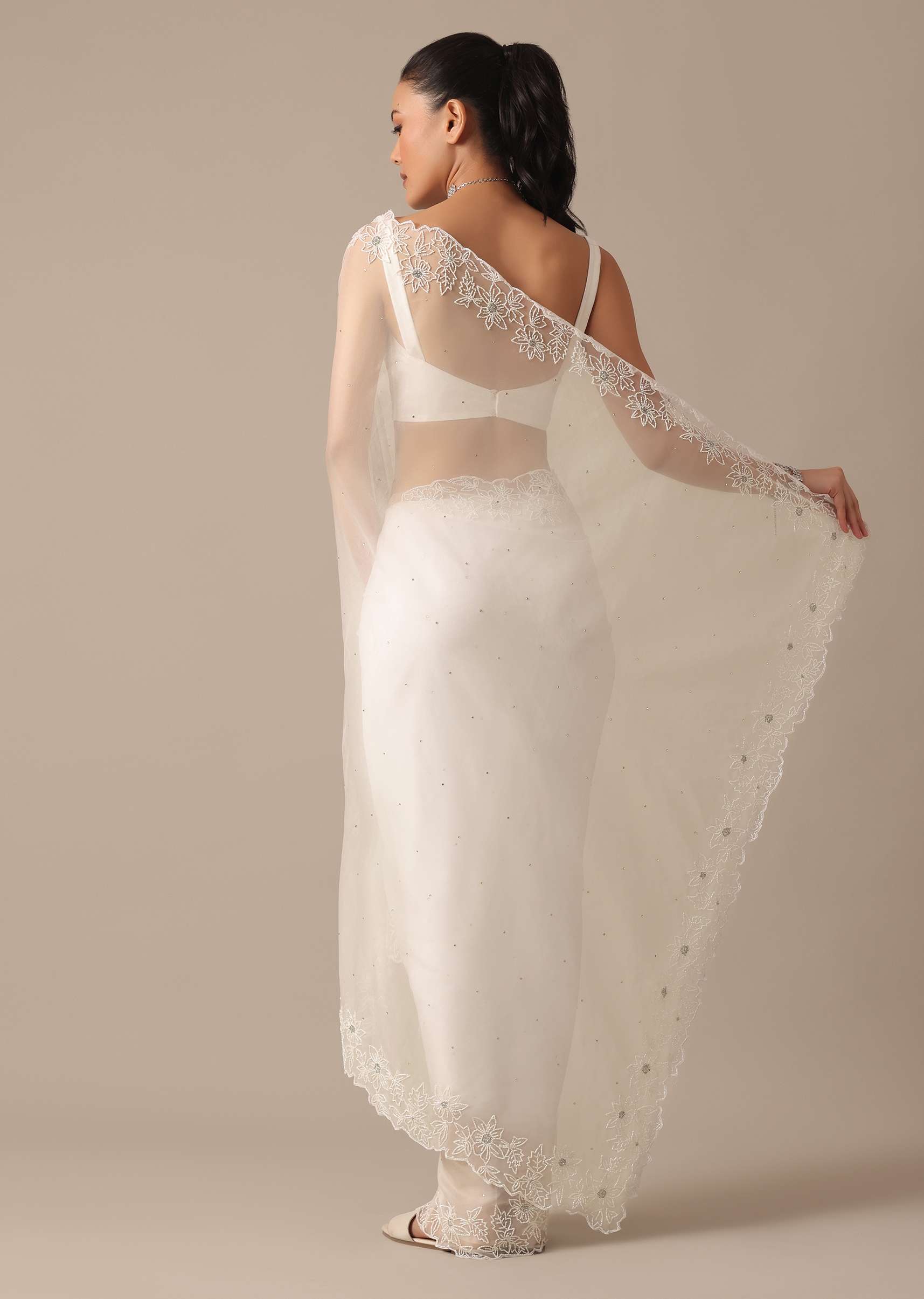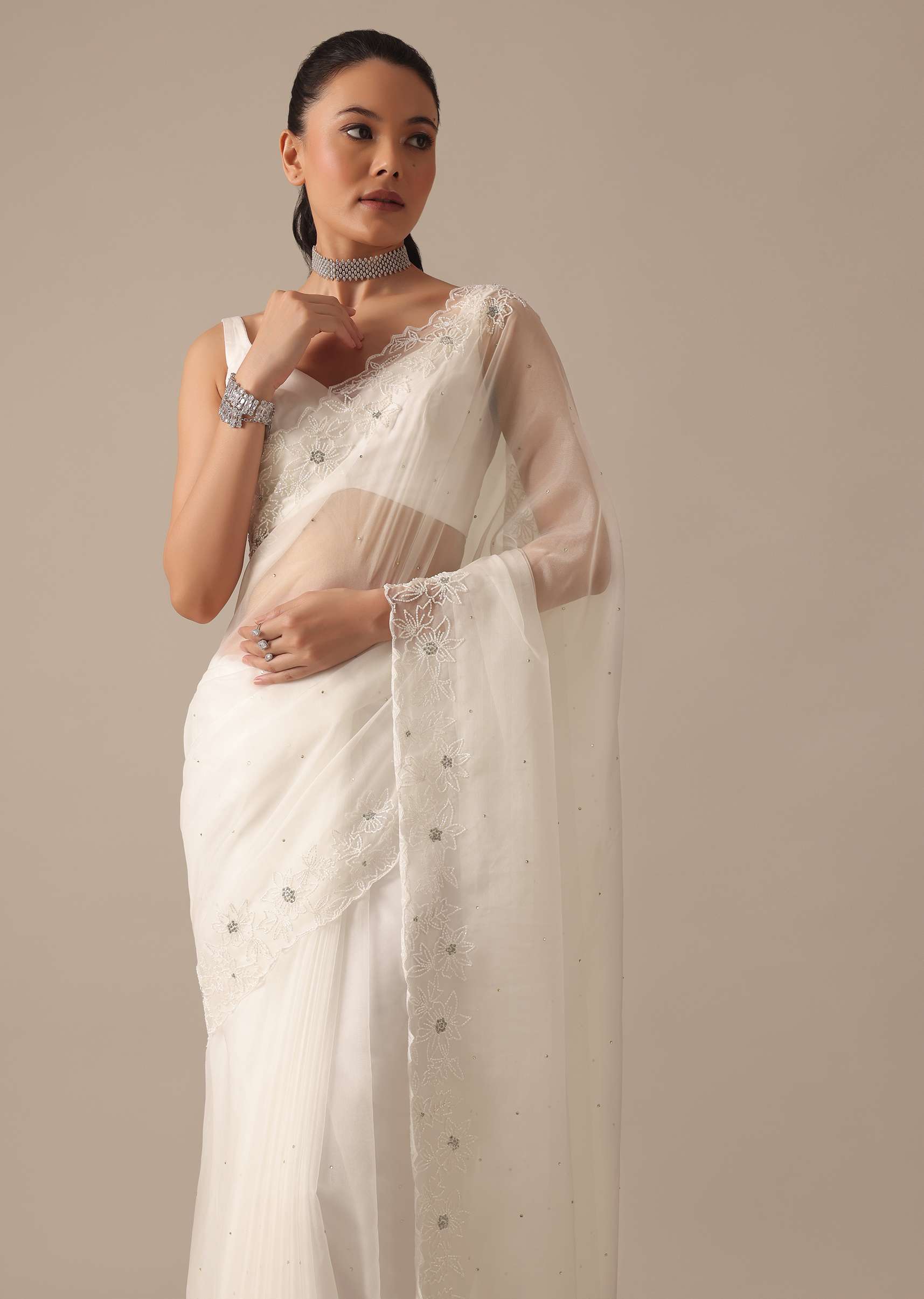 White Organza Saree With Cutdana Work And Unstitched Blouse Piece
