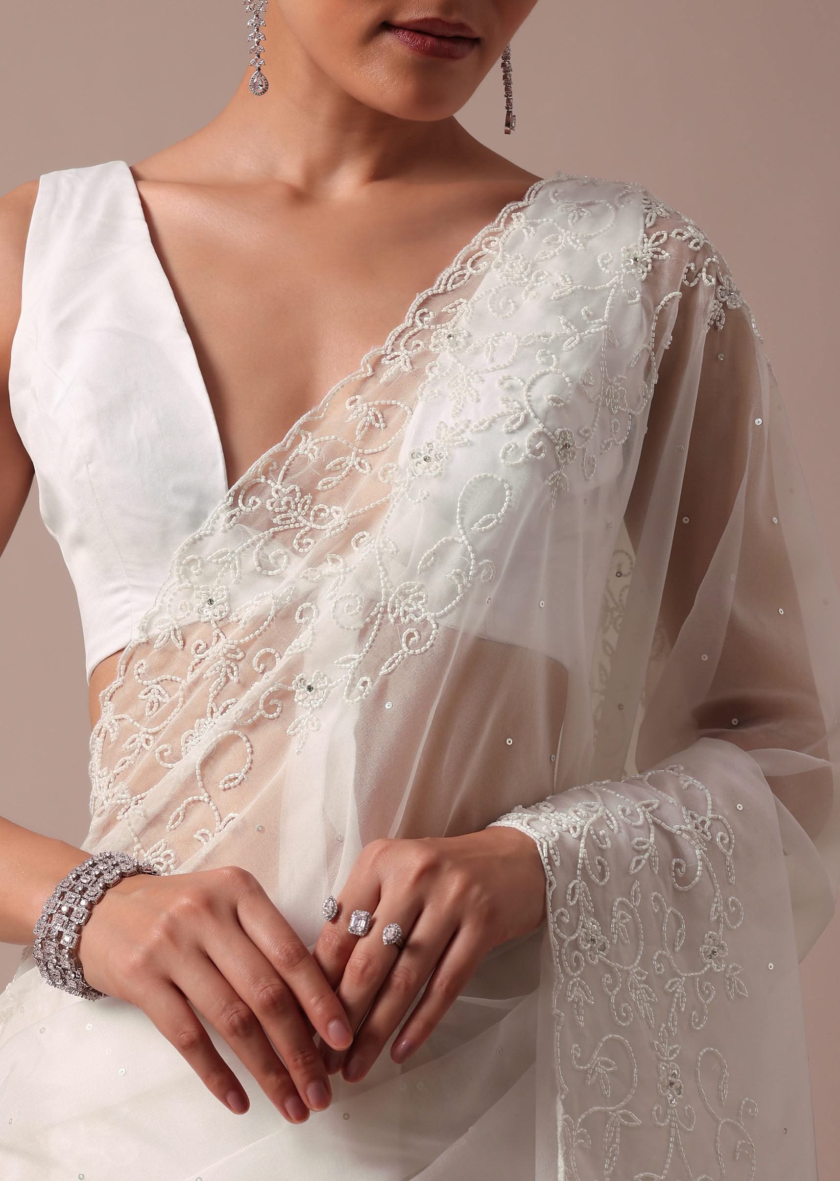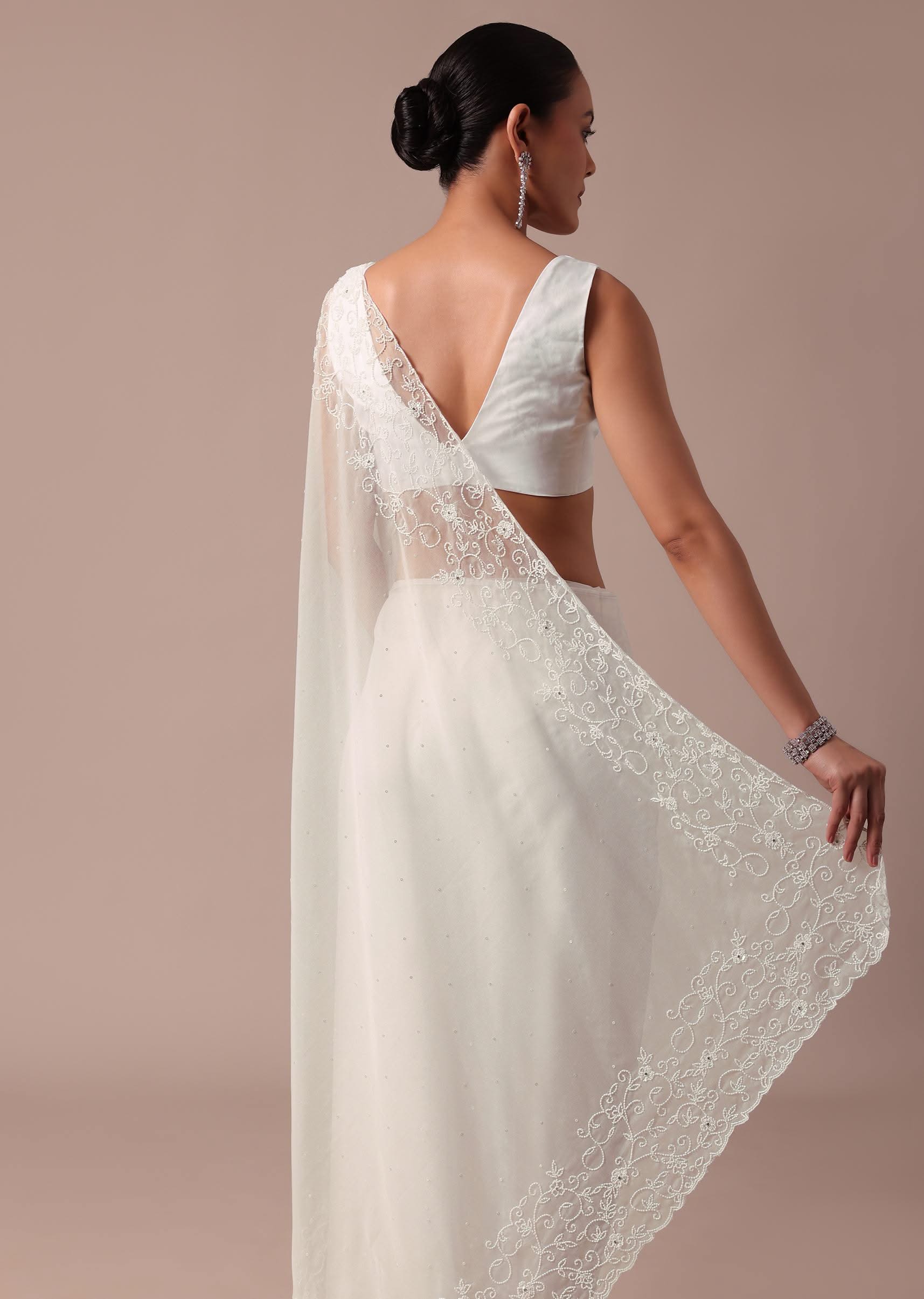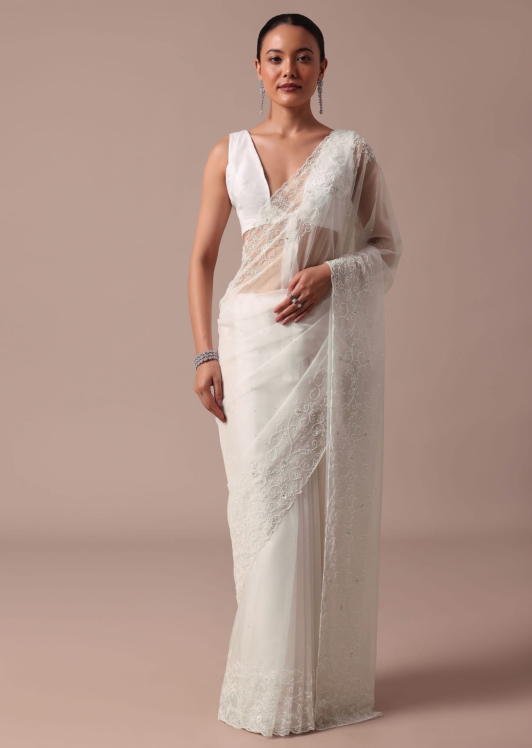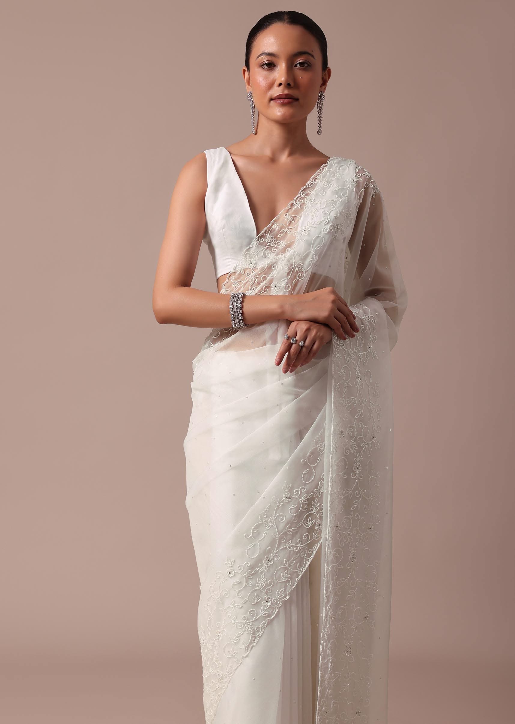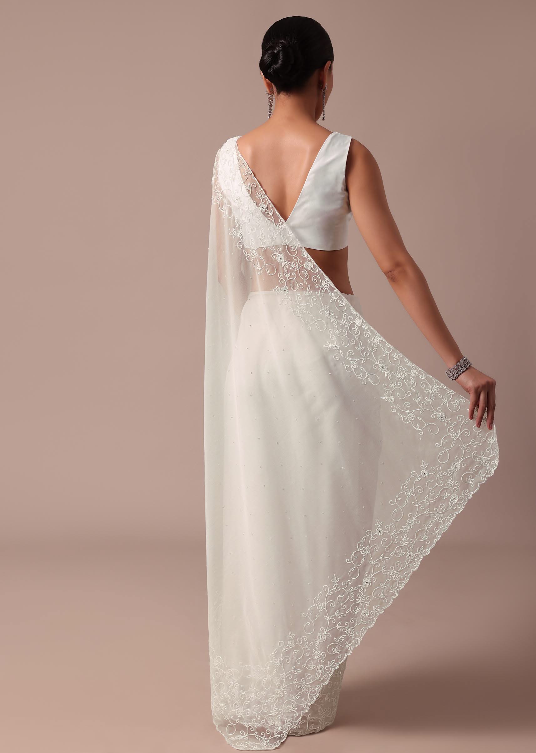 Embrace elegance with this white saree embellished with sequins and beadswork. This saree is crafted from organza fabric. The saree is teamed with an unstitched blouse. Dress up this look for the reception and wedding ceremony. Awarded as the Most Trusted Brand, we're delivering styles you love, just as promised.