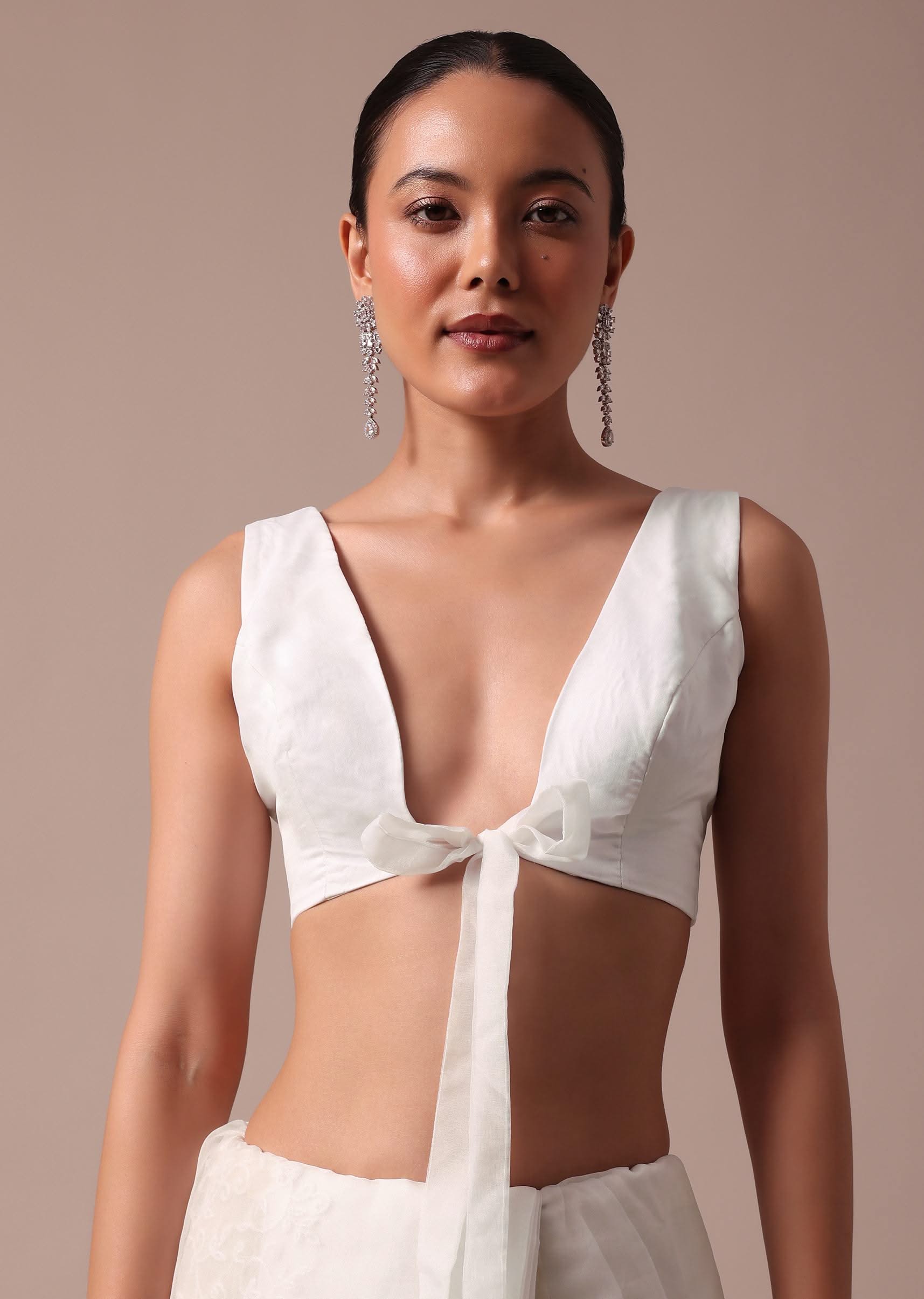 Opt for delicate silver or pearl jewelry to complement the ethereal look of the organza saree.