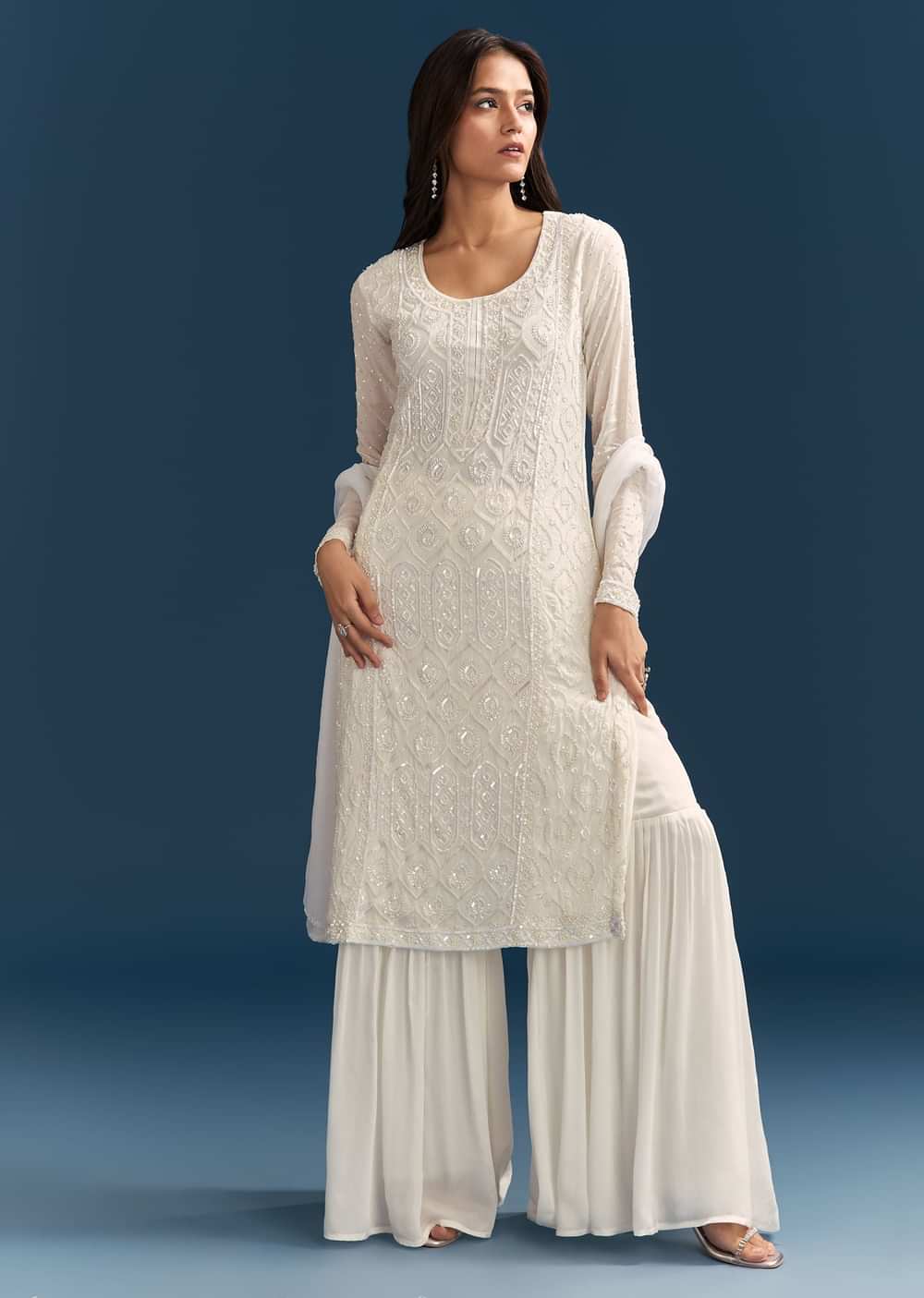 Serene and timeless, this all white Pakistani style sharara set is crafted in chinon fabric and detailed with sequins. The full sleeves and elegant dupatta make it a refined choice... More Product Details