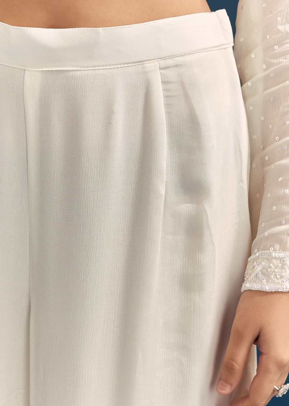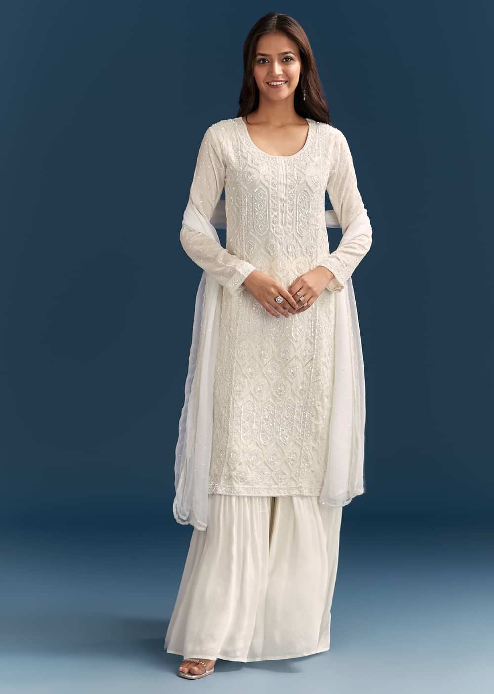 White Pakistani Sharara Suit With Sequin Details And Dupatta