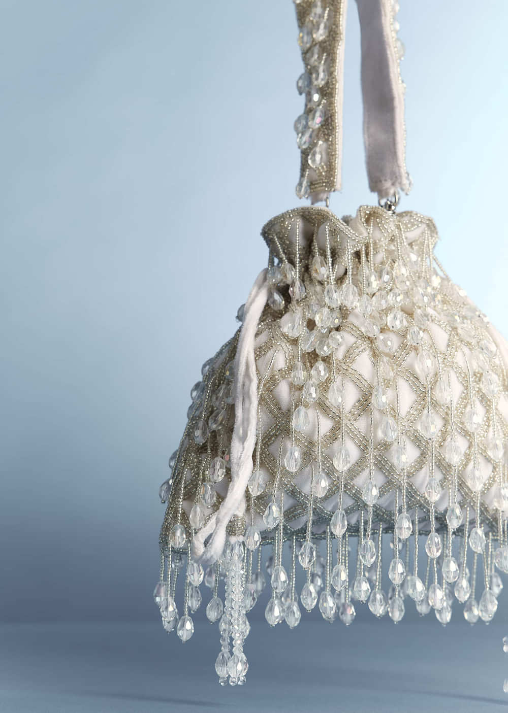 Quiet shine that works with every palette, this white potli scatters bead work across a soft base for a clean, dressed finish. The lining is smooth, the drawstring closes fast,... More Product Details