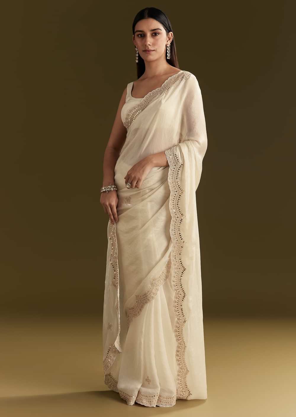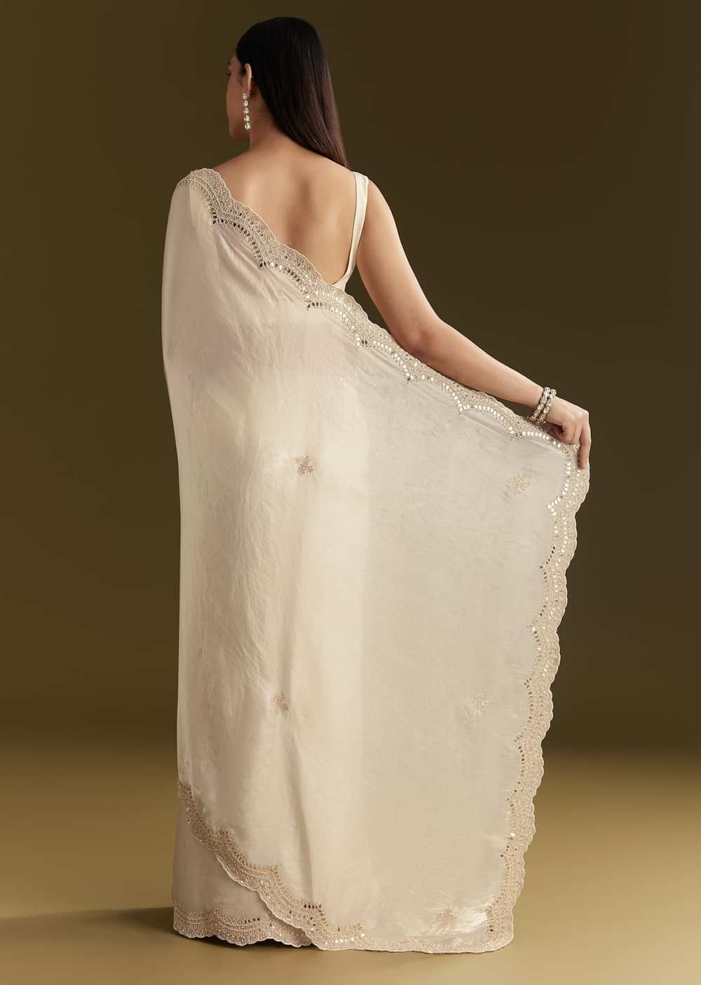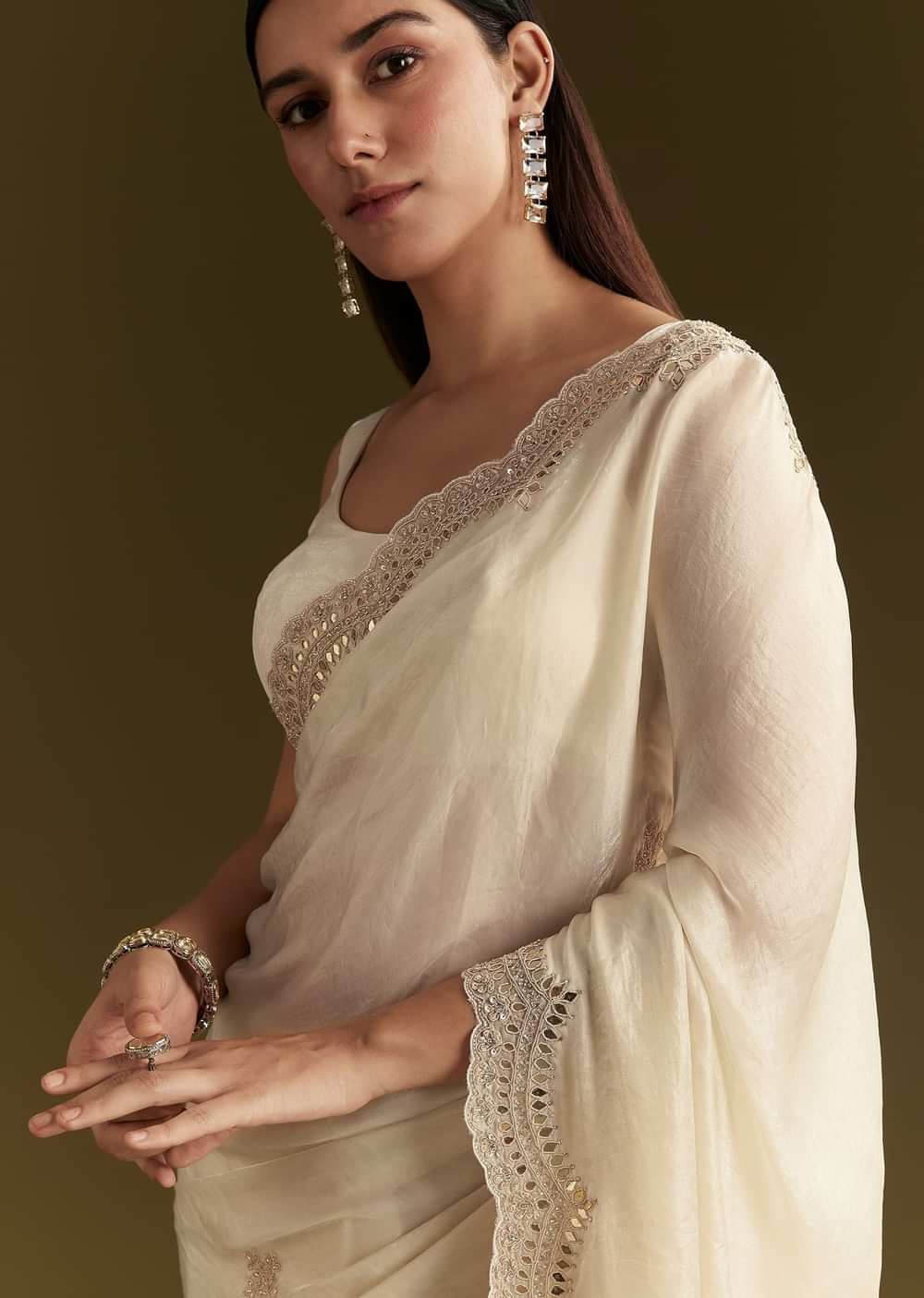 A tapestry of tradition and modern grace, this Off White satin saree is the epitome of refined luxury. Intricately detailed with gota patti, zardozi, stones, and cutdana embroidery, it blends heritage with contemporary sophistication. Awarded as the Most Trusted Brand, we're delivering styles you love, just as promised.