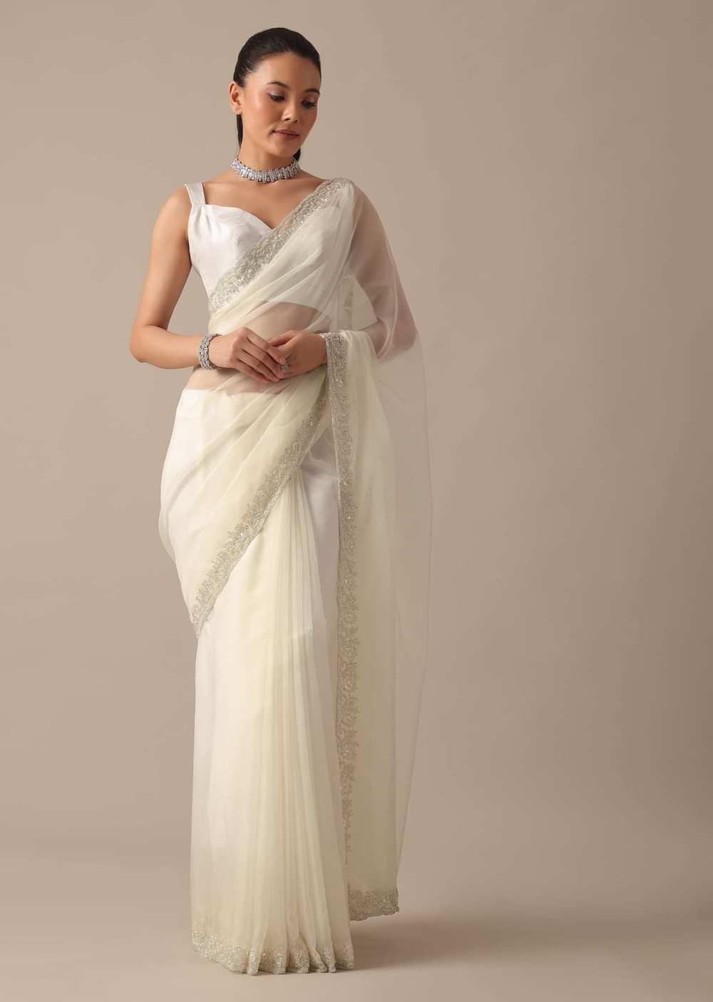 White Sheer Organza Saree With Scallop Cutwork And Unstitched Blouse Piece