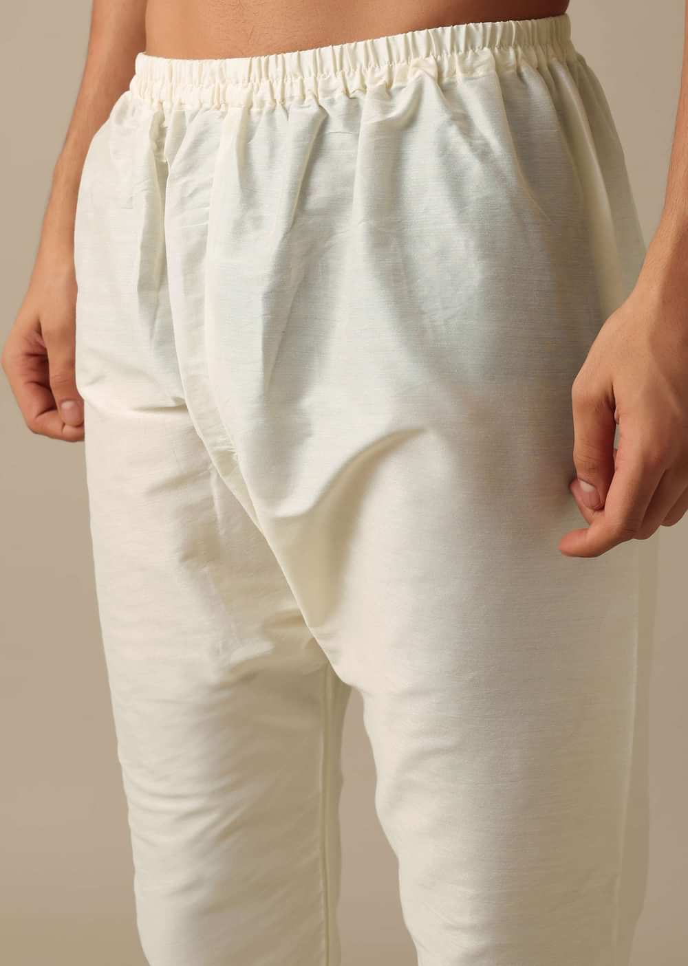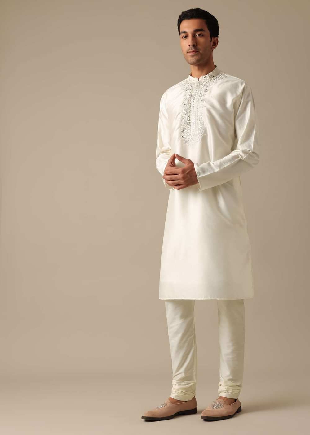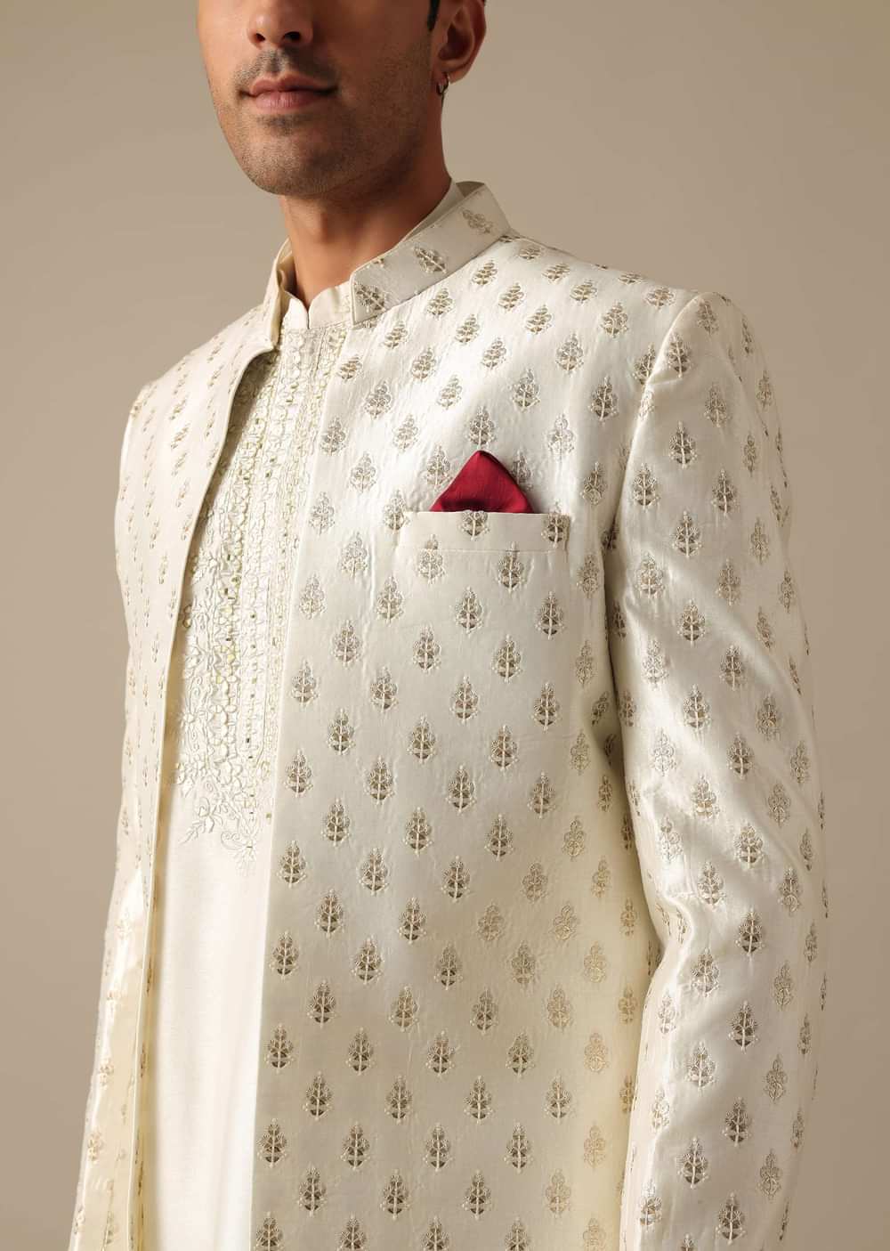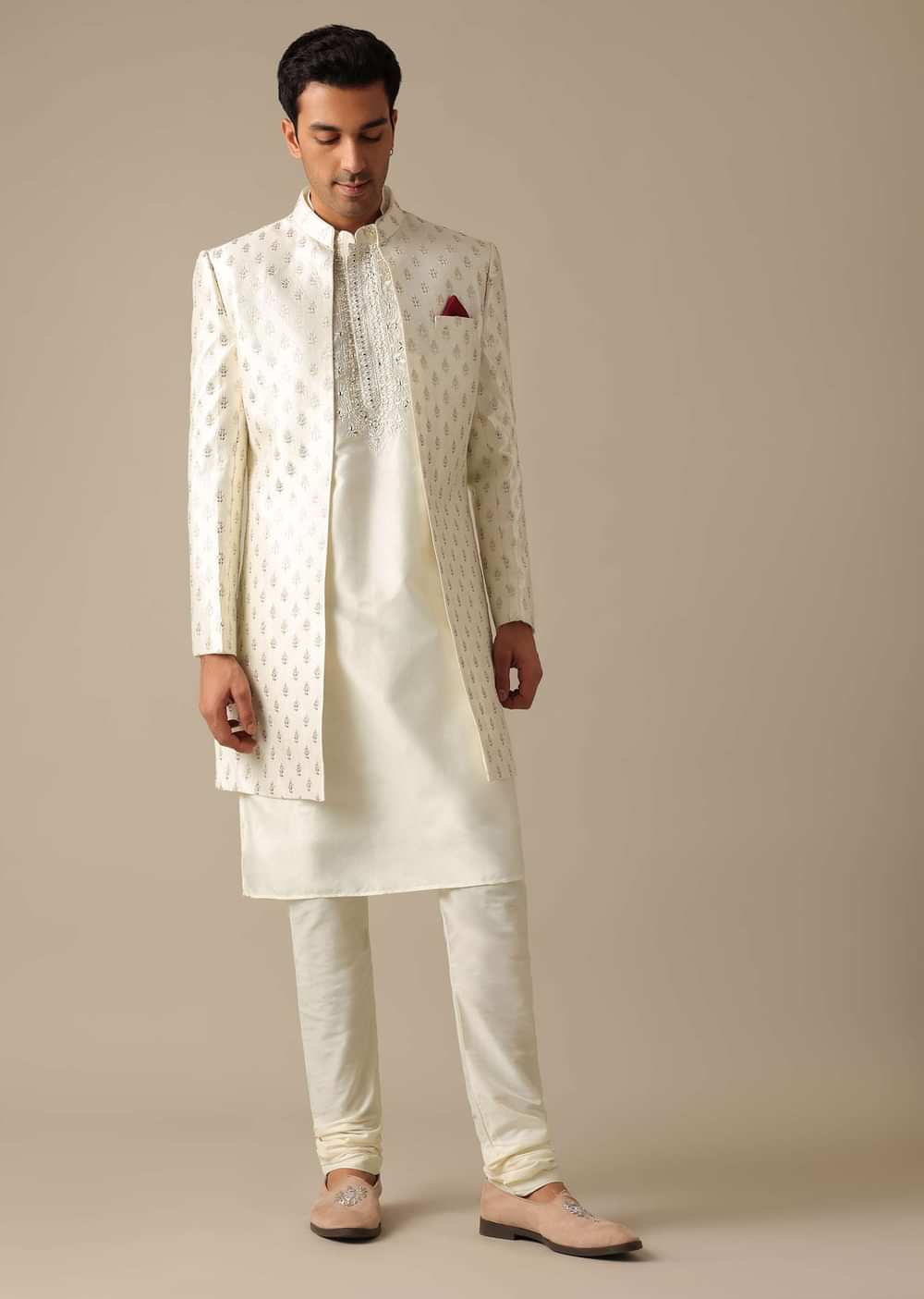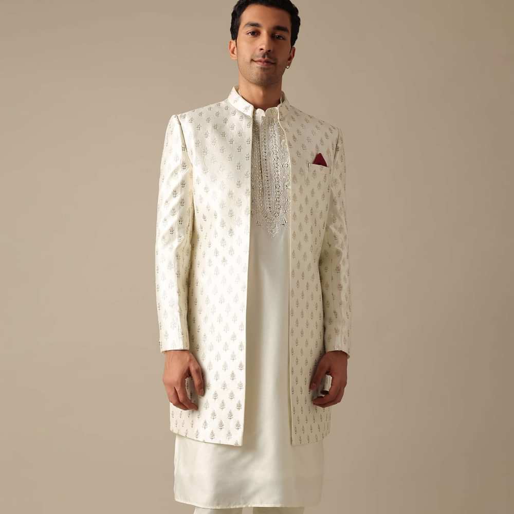 Add a dash of regal elegance wherever you go by stepping out in this luxe sherwani set. Crafted using plush silk, this serene white hue is adorned with striking embroidered motifs. Paired with a Mandarin collar kurta and pants, this three-piece outfit will make heads turn at the next grandeur wedding celebration. Awarded as the Most Trusted Brand, we're delivering styles you love, just as promised.