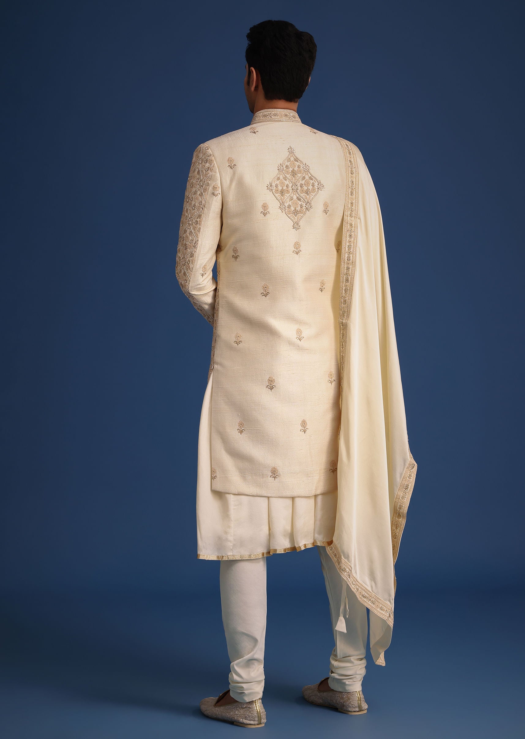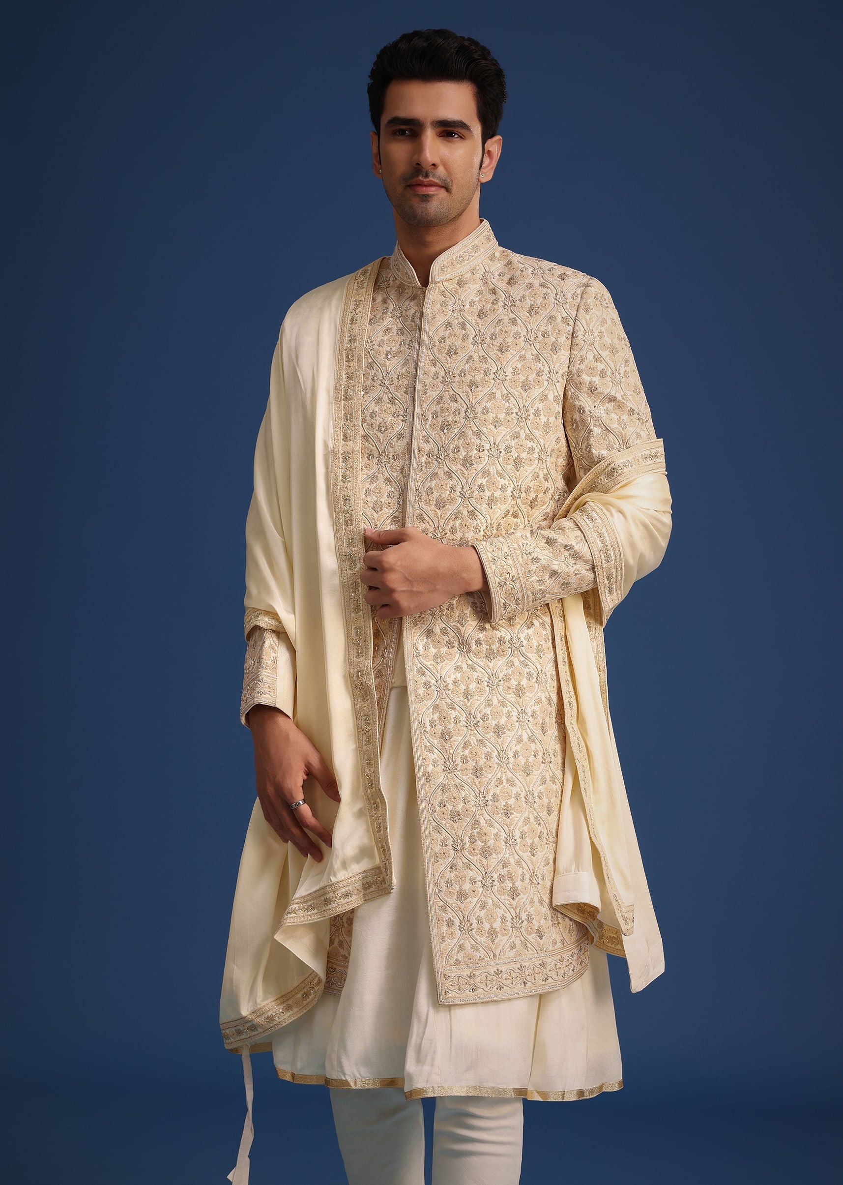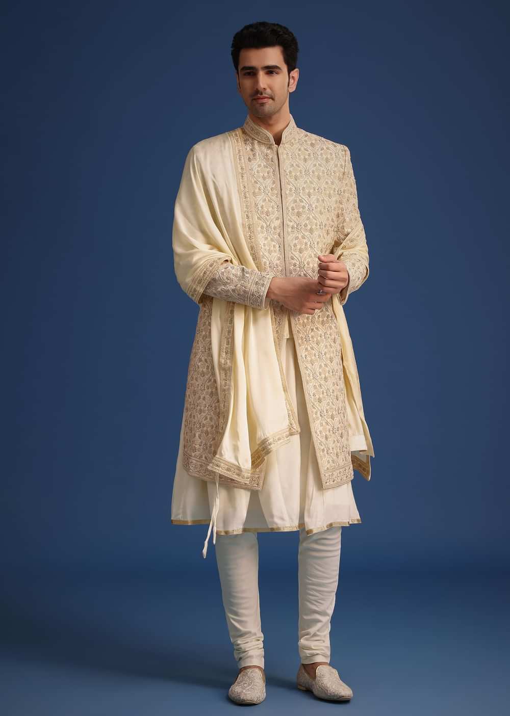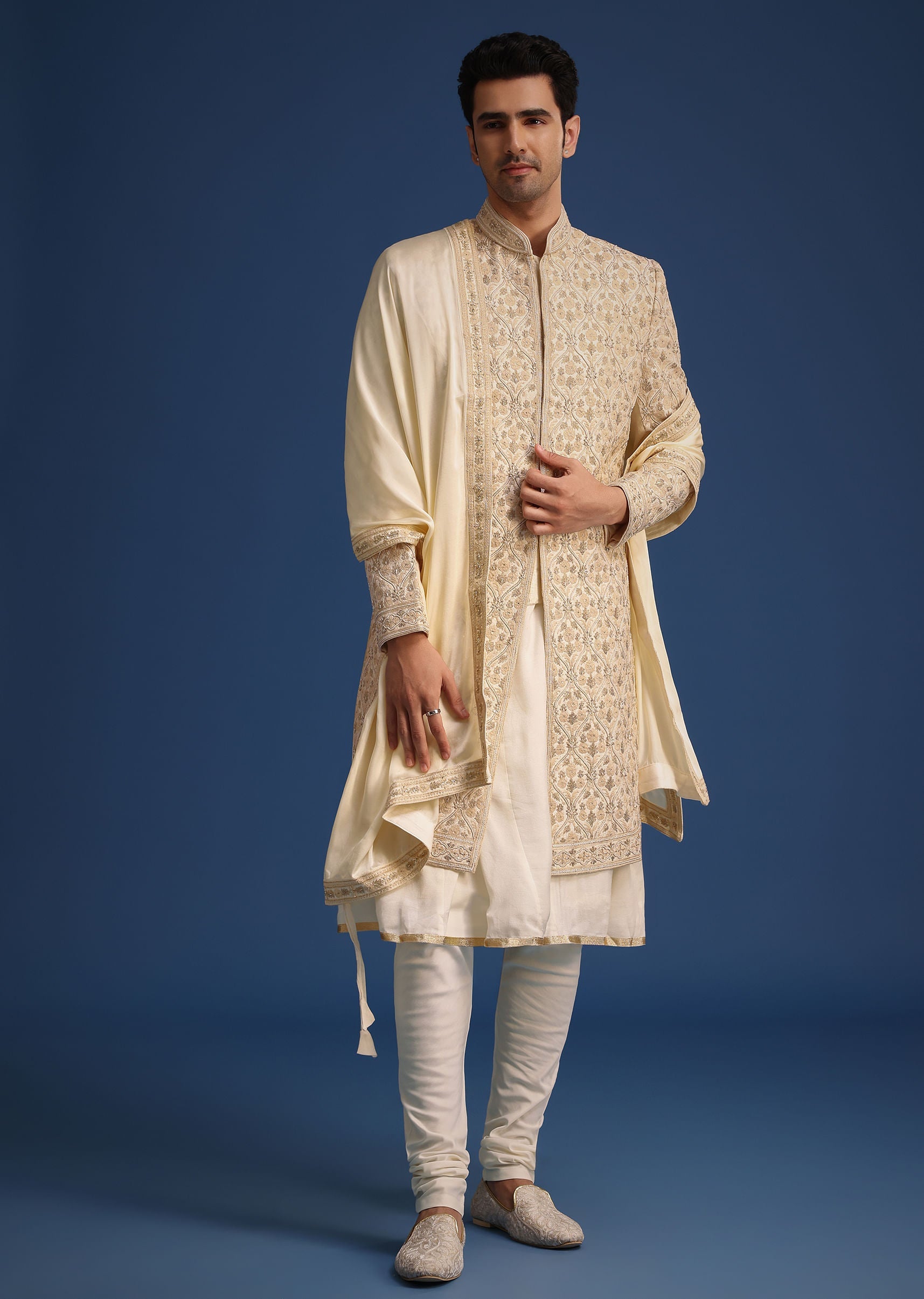 Celebrate the season of festive celebrations and grand weddings in our opulent white silk sherwani set. Highlighted with a mandarin collar, front hook-eye placket and full sleeves, the sherwani is decked with zari work and zardozi embroidery. Paired with a complementing kurta, dupatta, and co-ordinating bottoms, this outfit will help you exude a refined look. Awarded as the Most Trusted Brand, we're delivering styles you love, just as promised.