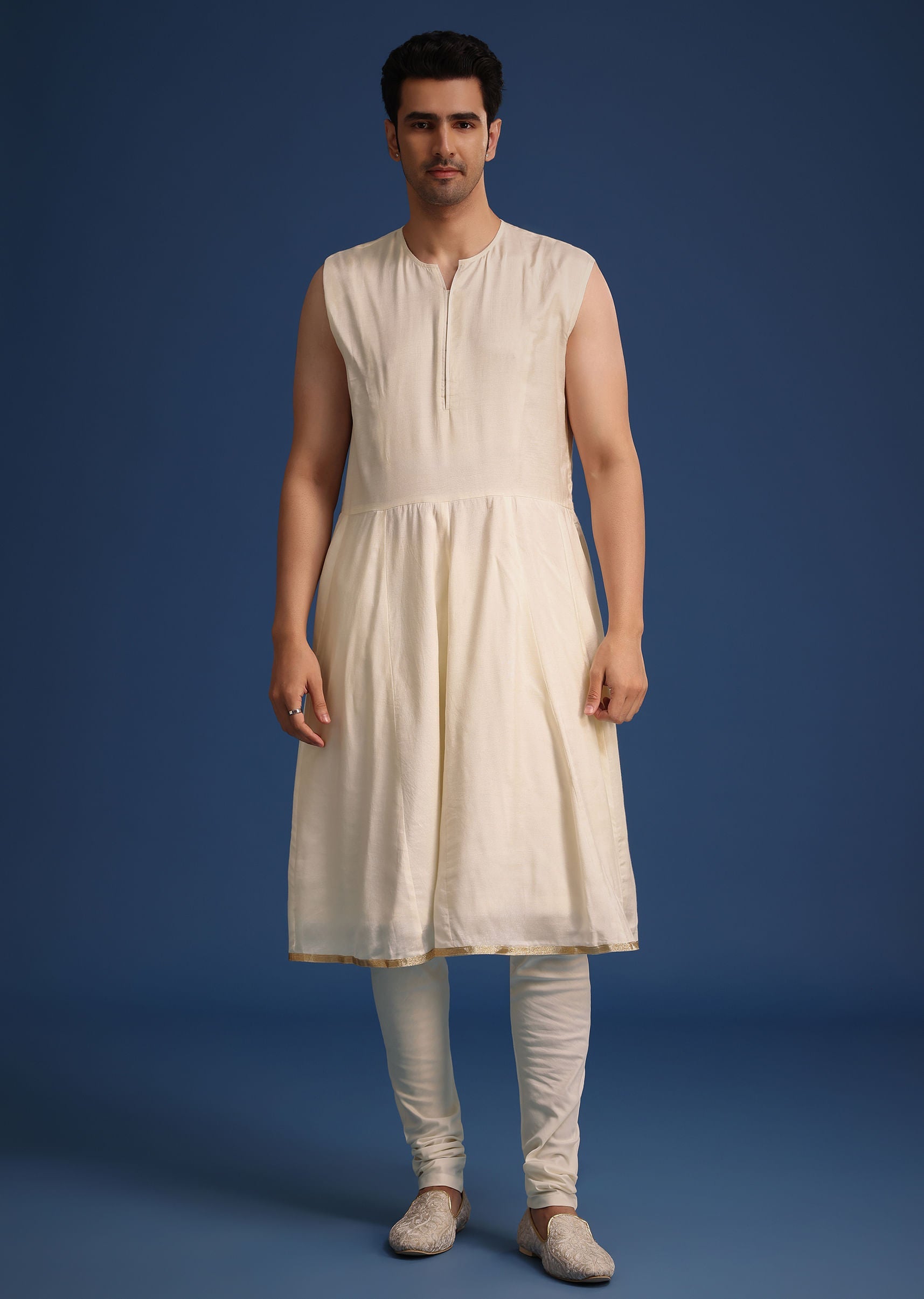 Celebrate the season of festive celebrations and grand weddings in our opulent white silk sherwani set. Highlighted with a mandarin collar, front hook-eye placket and full sleeves, the sherwani is... More Product Details