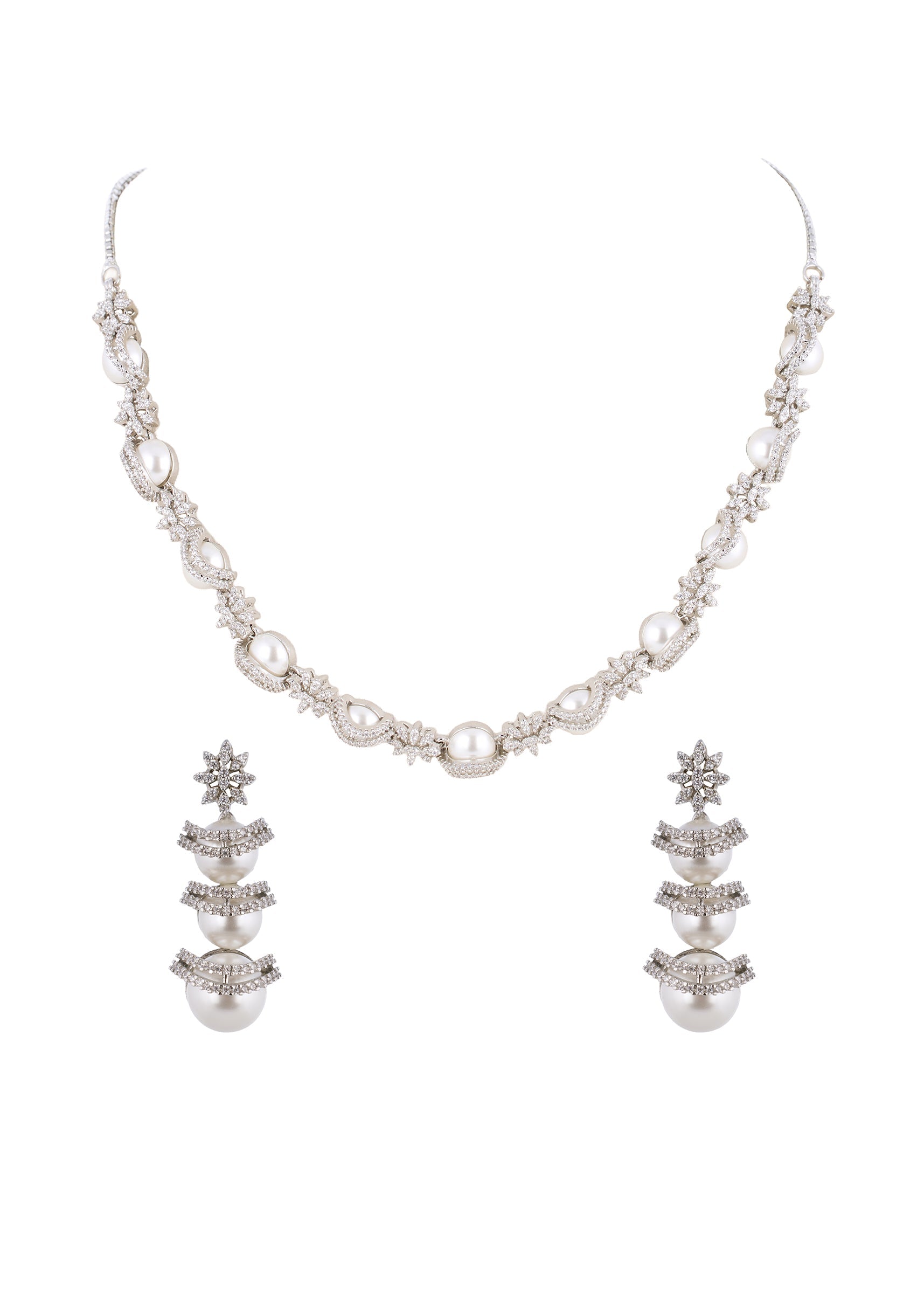 This white silver necklace set features delicate diamond craftsmanship that adds a subtle sparkle and polished charm to your look. The intricately designed necklace paired with matching earrings enhances the neckline while adding an elegant and sophisticated touch to your ensemble. Lightweight and perfectly balanced, it pairs beautifully with lehengas, sarees, and indo western outfits, making it a versatile accessory for party and cocktail occasions. Awarded as the Most Trusted Brand, we're delivering styles you love, just as promised.