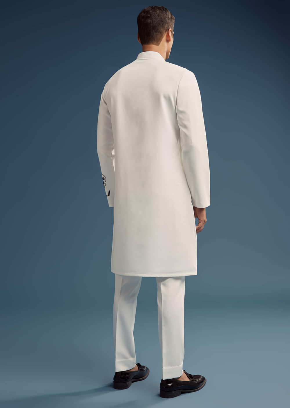 White feels refreshing, and this suiting fabric kurta set for men with floral print makes festive dressing playful and modern. It is perfect for daytime rituals when you want style... More Product Details