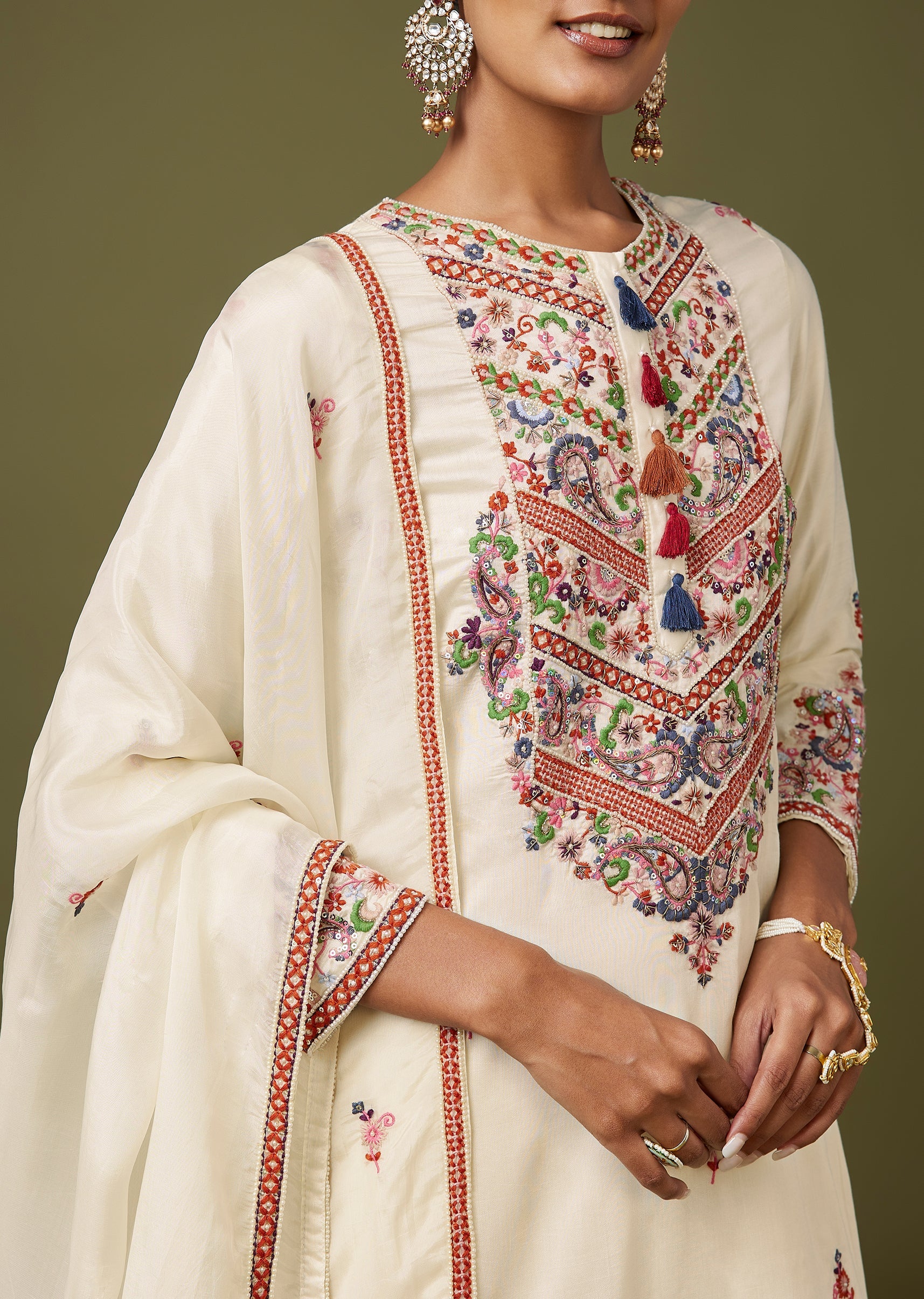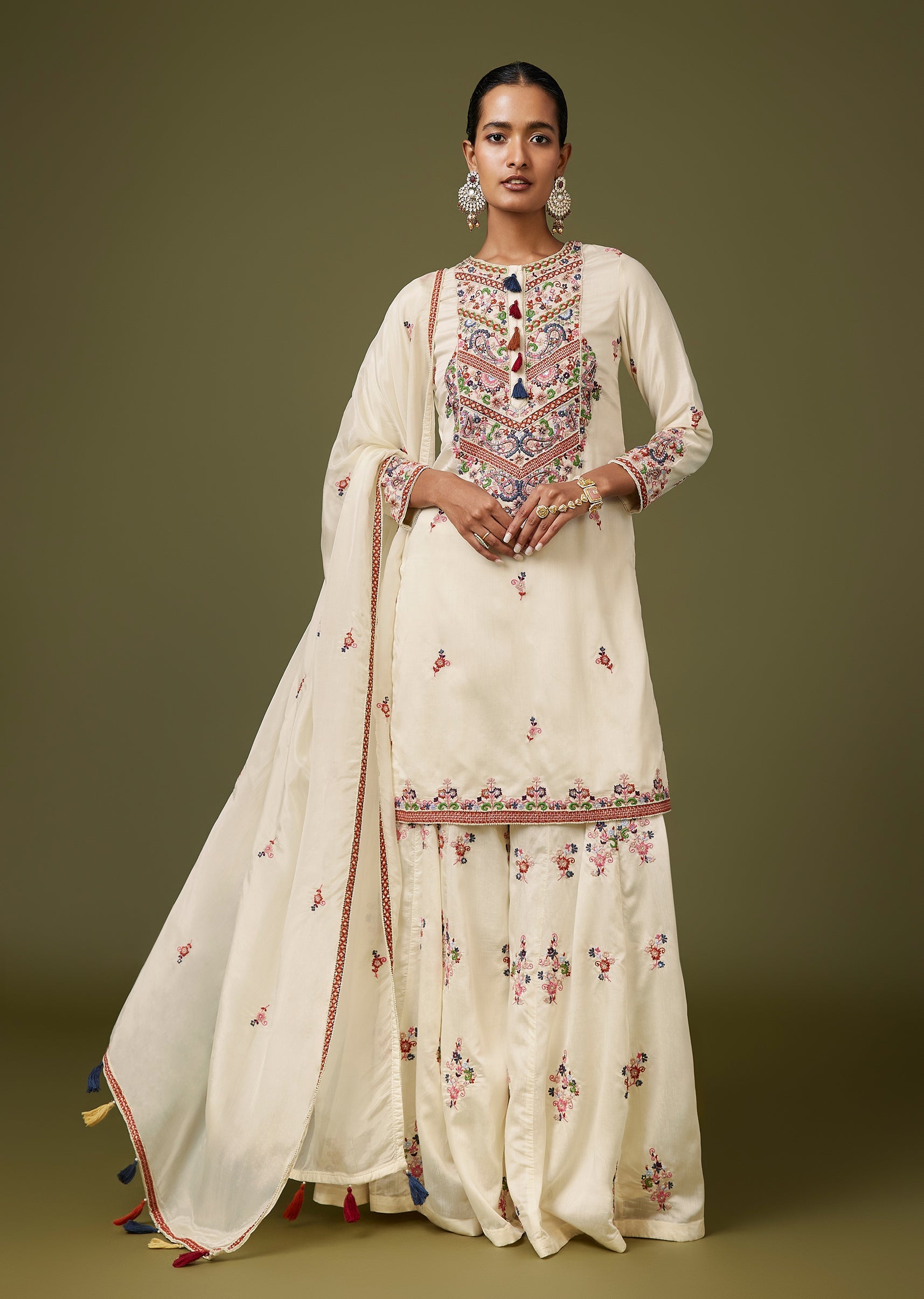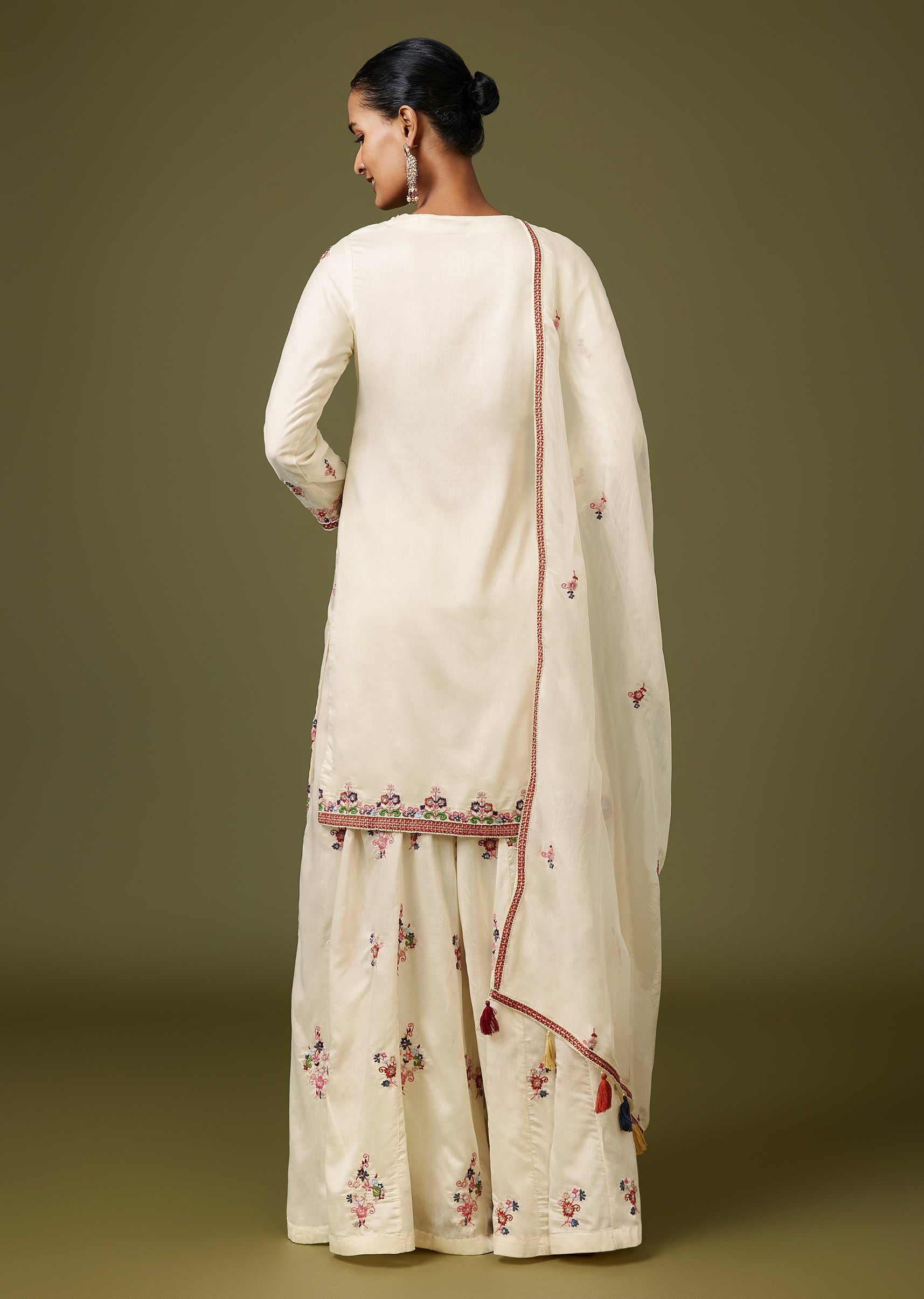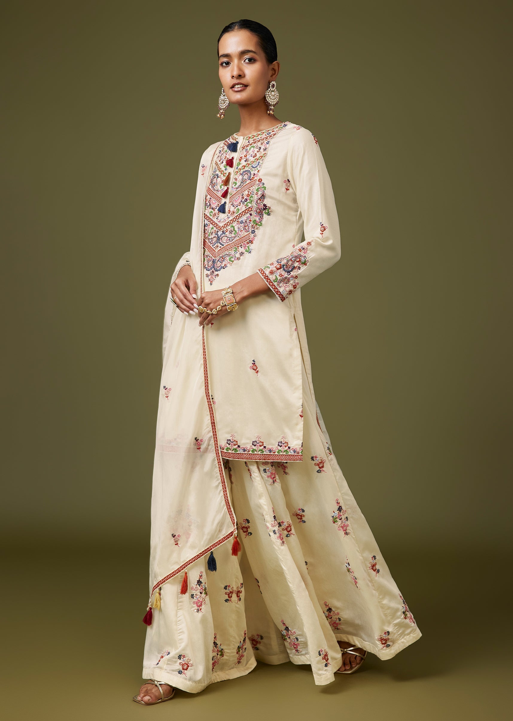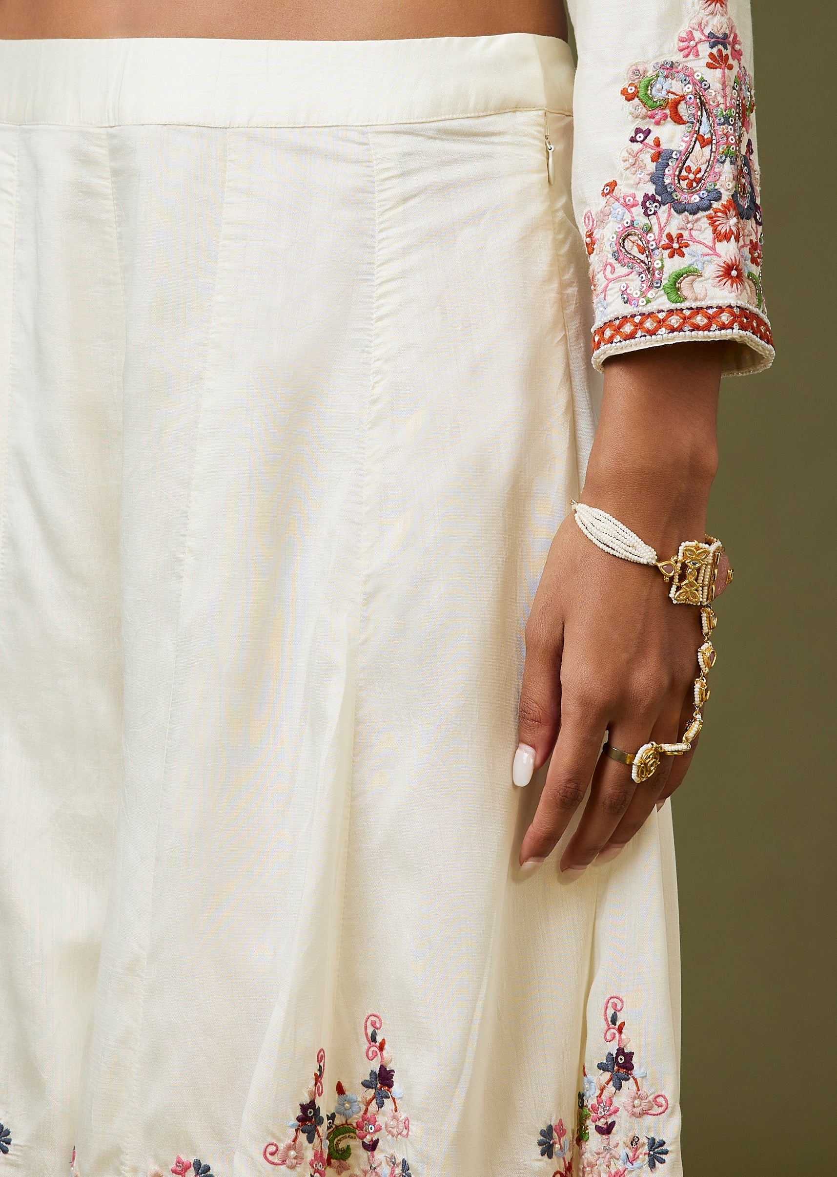 Fresh and festive, this white silk palazzo set features thread and moti work for a rich, Pakistani-style finish. The straight kurta with full sleeves and a round neckline is paired... More Product Details