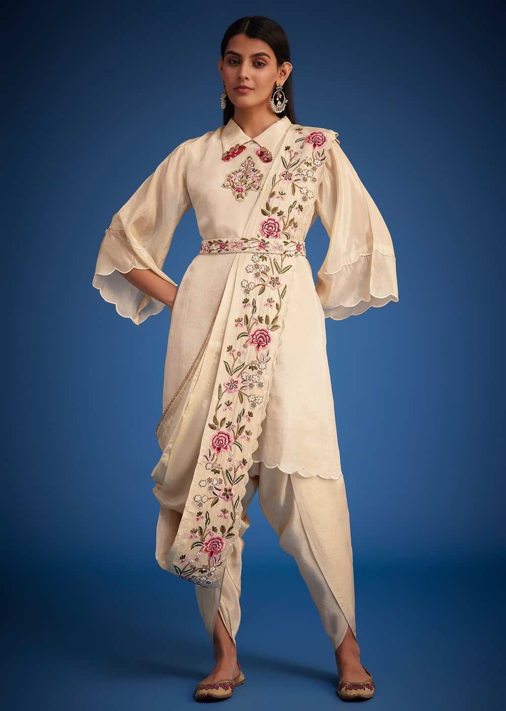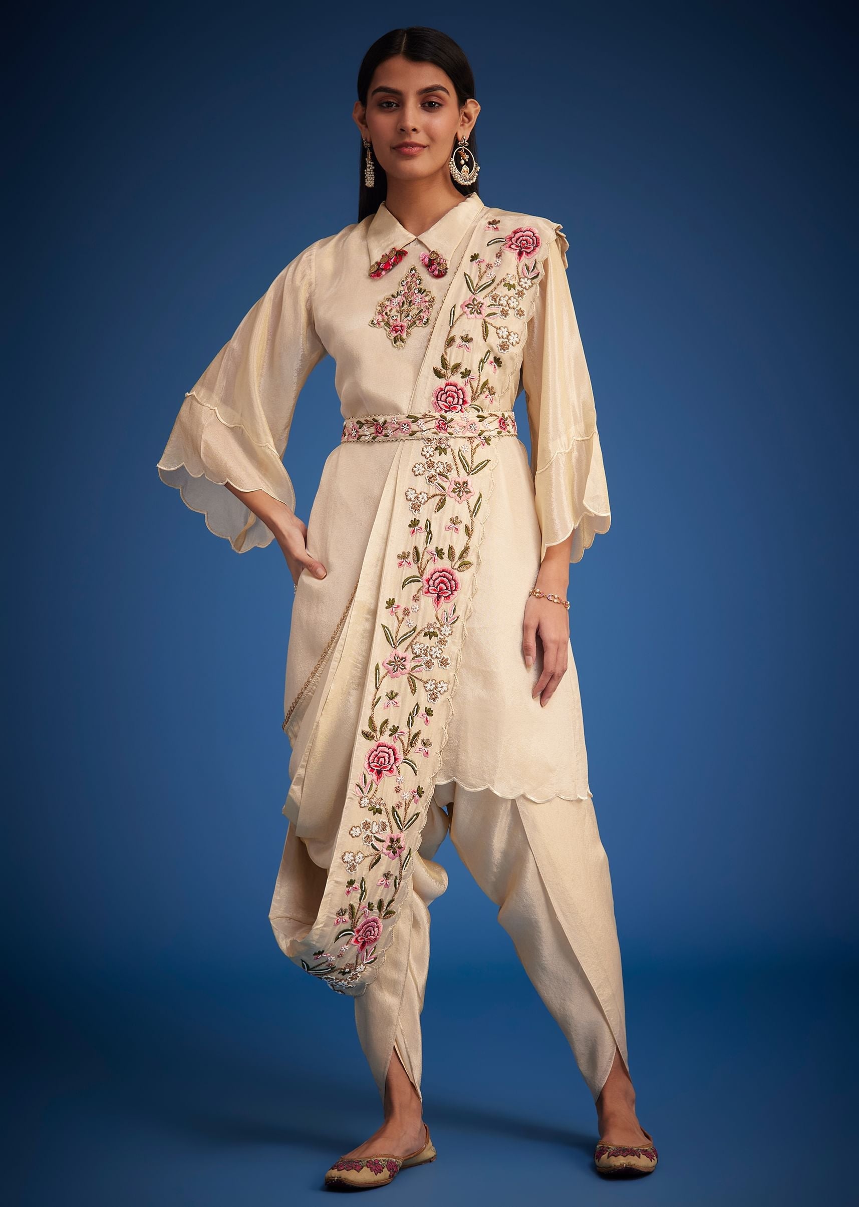 - Embrace contemporary elegance with this White Tissue Dhoti Set, adorned with intricate Cut Dana, Resham, Moti, and Bead embroidery.