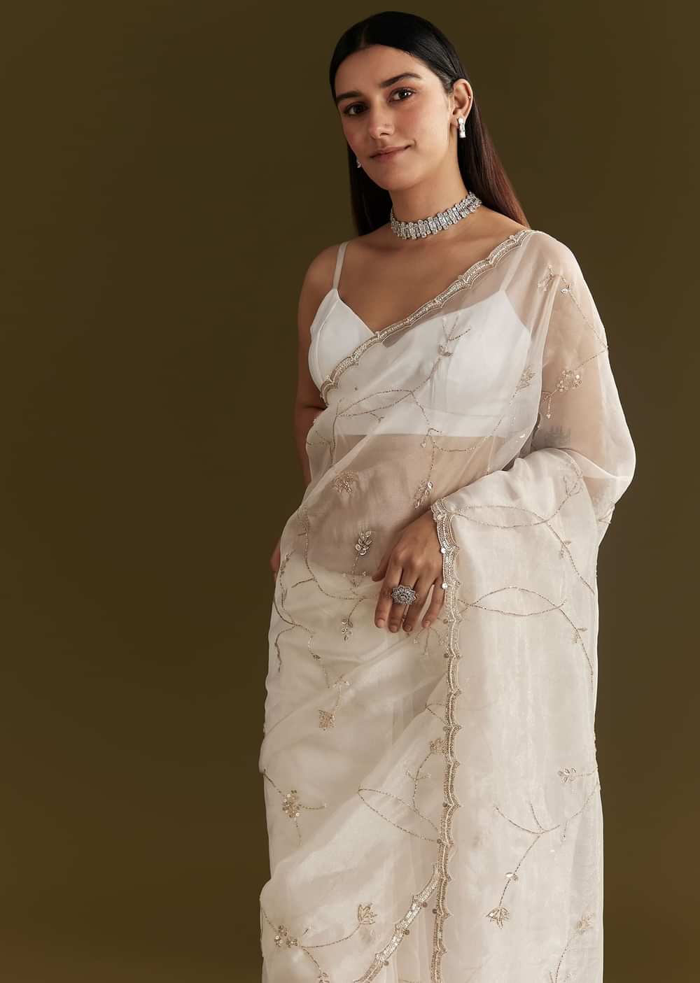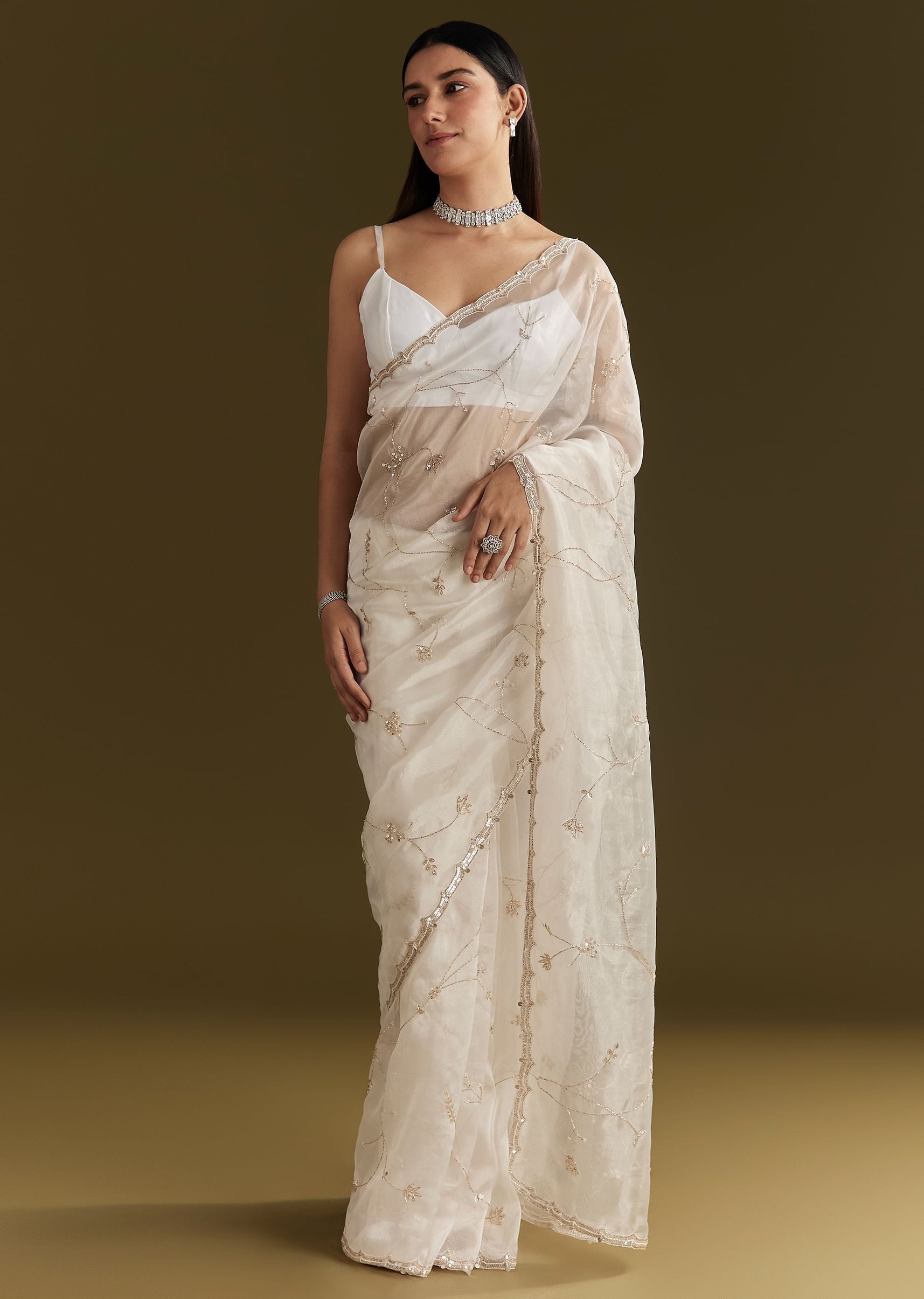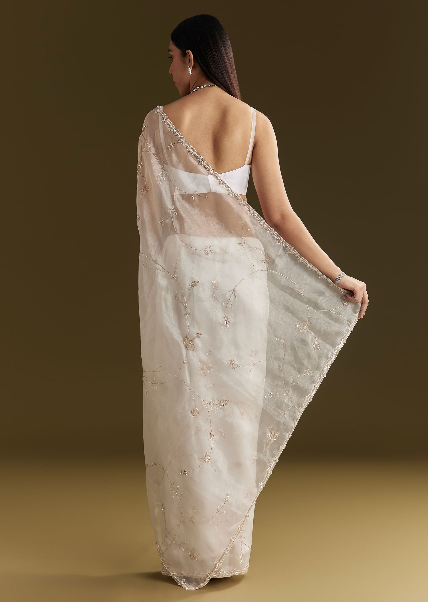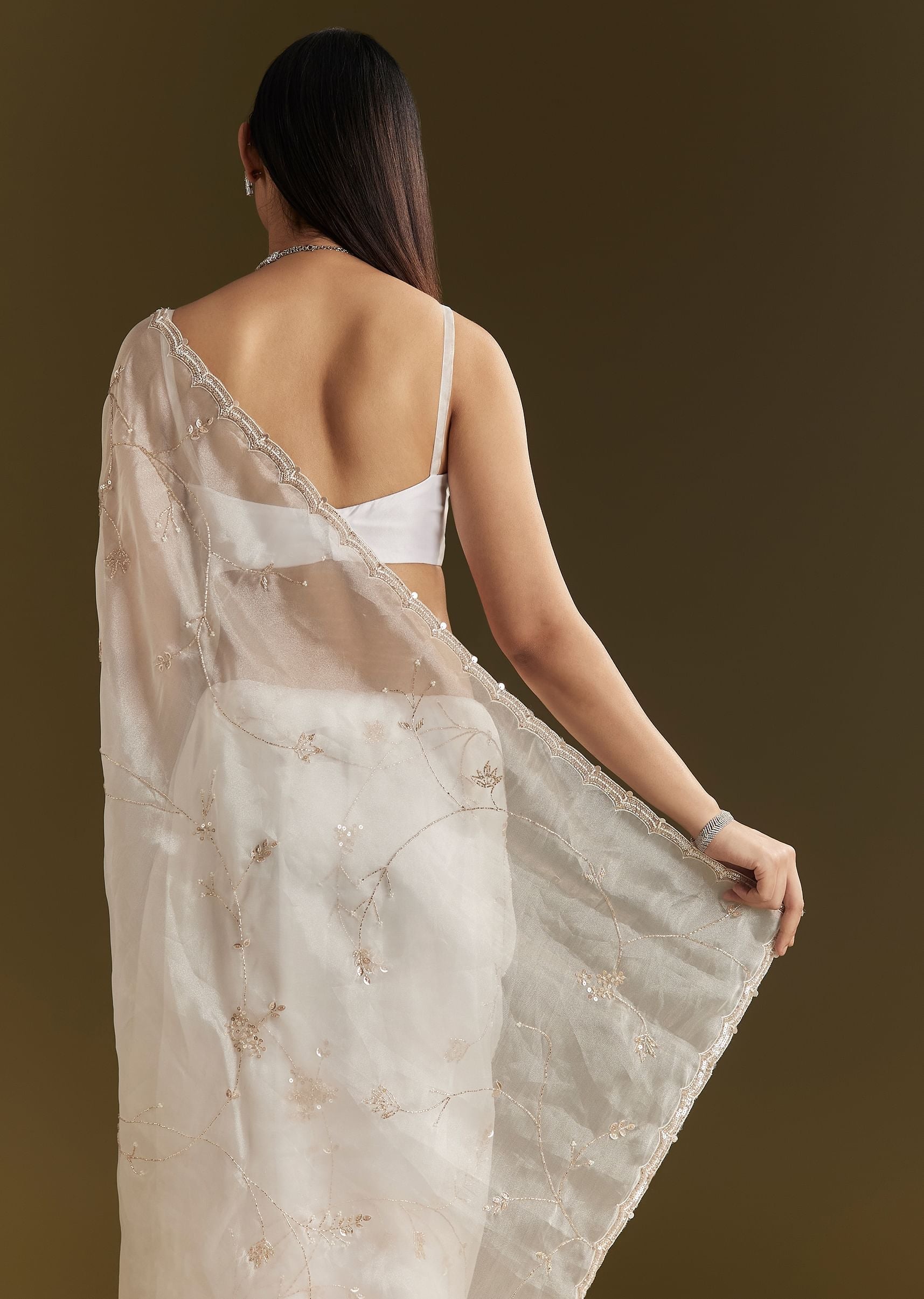 A celestial vision in white, this tissue saree gleams with refined beauty. Embroidered with cutdana and sequins, and finished with a scallop border, it captures the essence of timeless grace. Awarded as the Most Trusted Brand, we're delivering styles you love, just as promised.