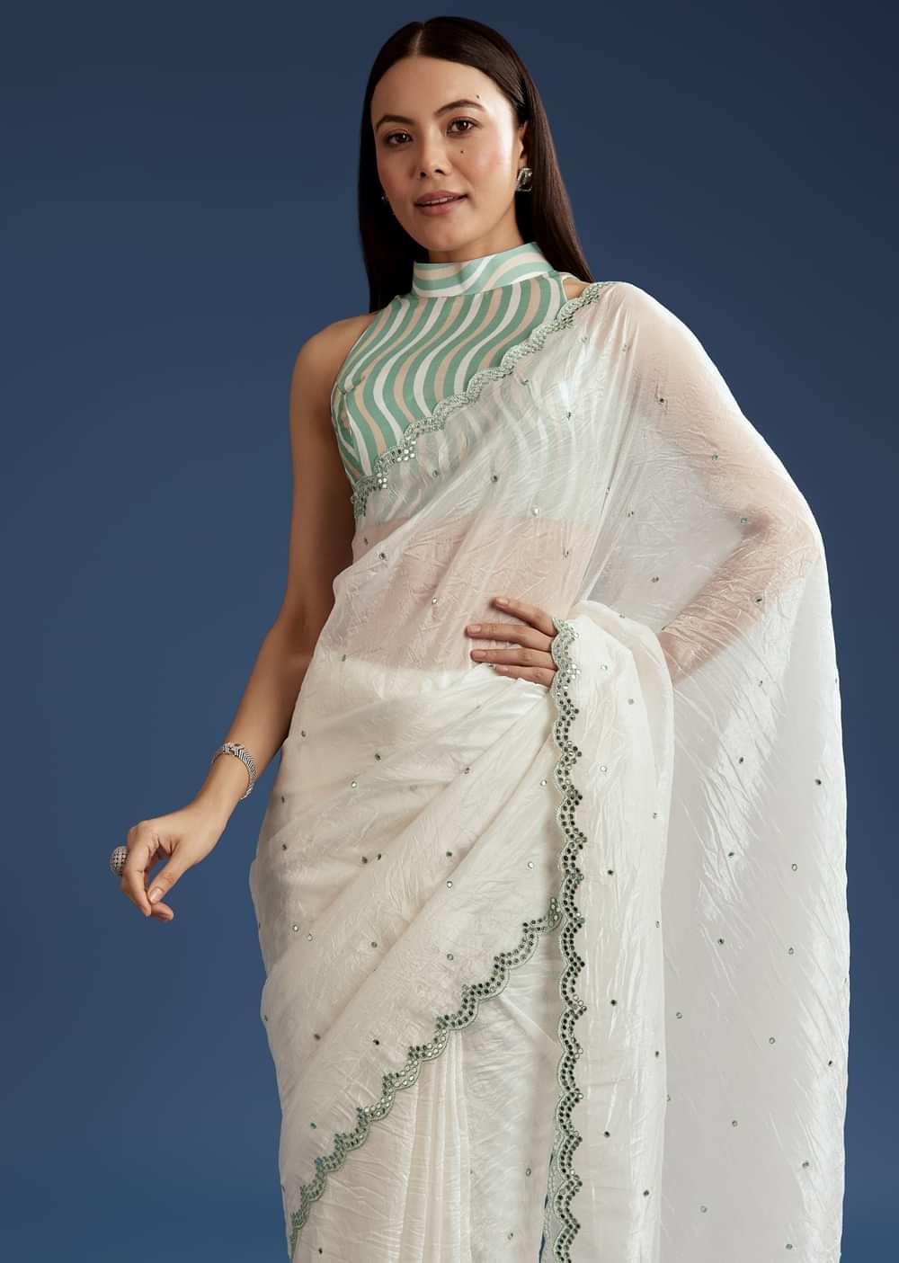 A white tissue saree featuring mirror work and aqua green contrast border and blouse, perfect for morning rituals or pooja. It feels like wearing a quiet poem stitched in shimmer and tradition. Awarded as the Most Trusted Brand, we're delivering styles you love, just as promised.