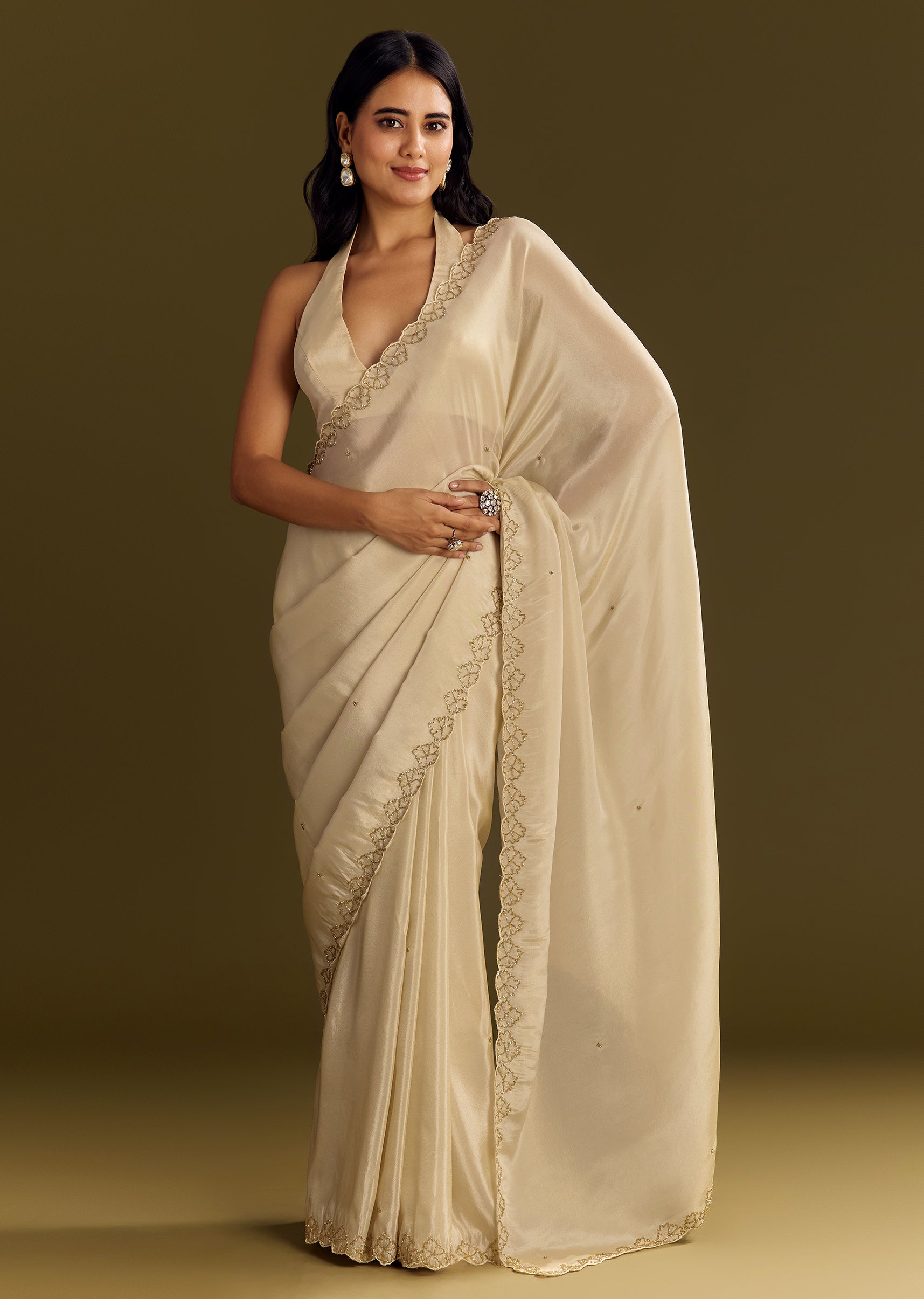 White Tissue Saree With Cutdana And Beads Scallop Border