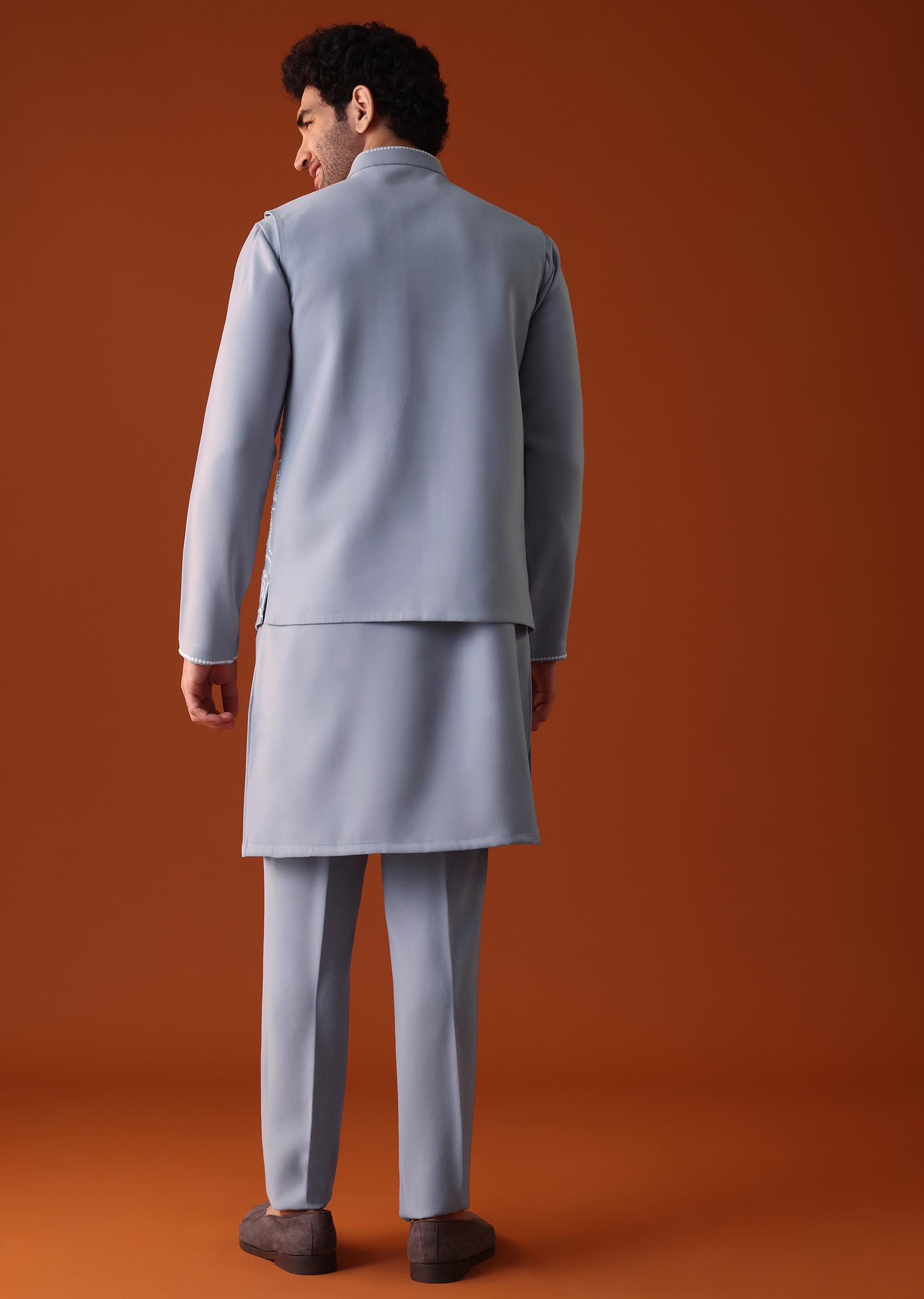 Wind chime grey bandi jacket in polyster fabric in thread embroidery. The jacket is paired with a matching kurta. The jacket is crafted with a mandarin collar with cut sleeves, and a front button-hook closure having threadwork. The matching kurta comes in suiting fabric with full sleeves in a mandarin collar style and front button closure till yoke and side pockets. The set has matching pants. Awarded as the Most Trusted Brand, we're delivering styles you love, just as promised.