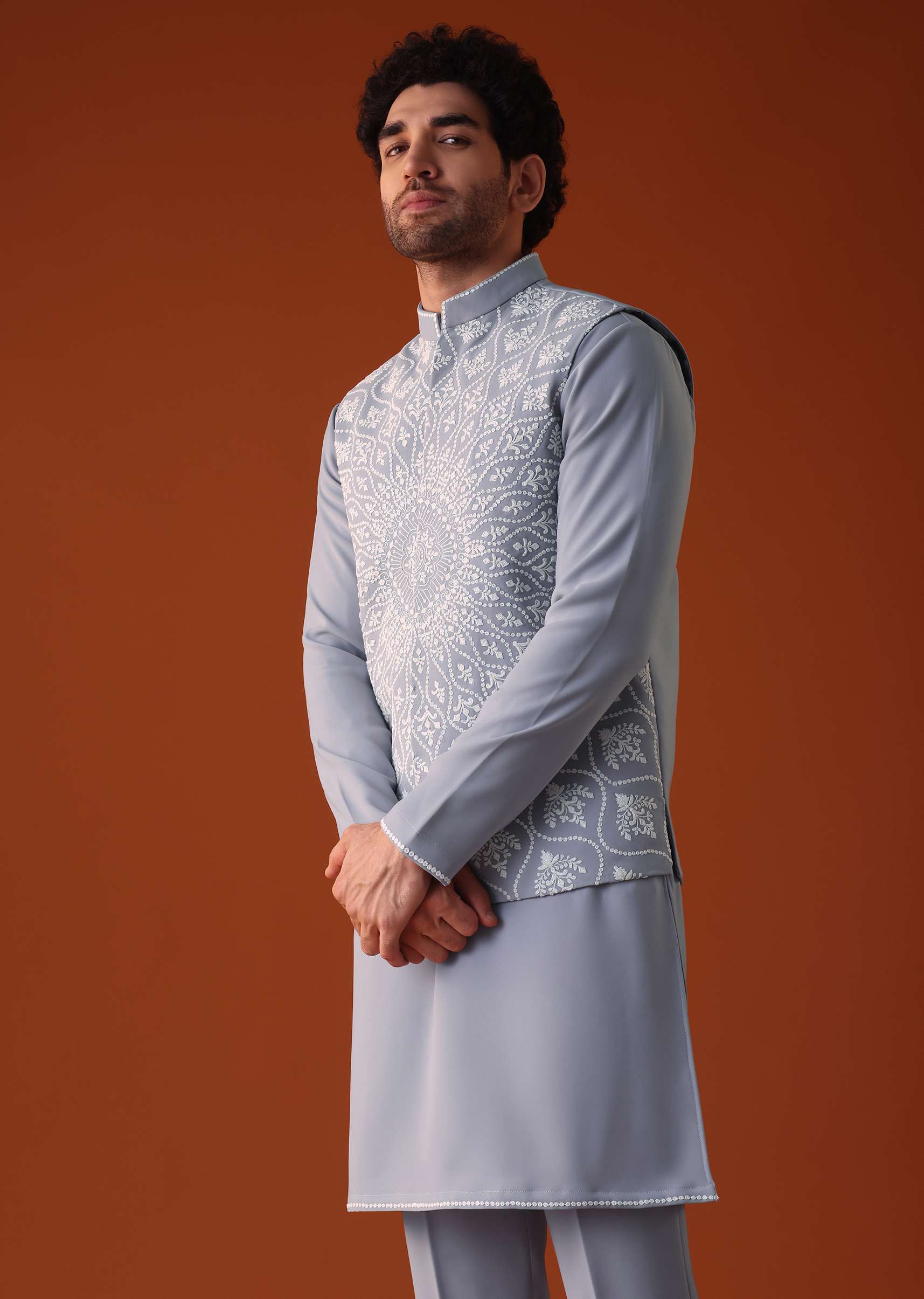 Wind chime grey bandi jacket in polyster fabric in thread embroidery. The jacket is paired with a matching kurta. The jacket is crafted with a mandarin collar with cut sleeves,... More Product Details
