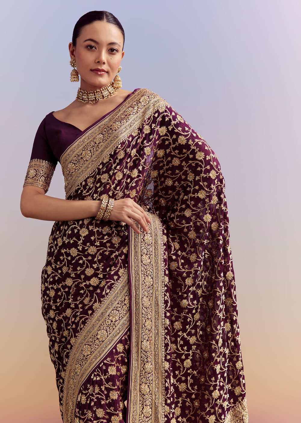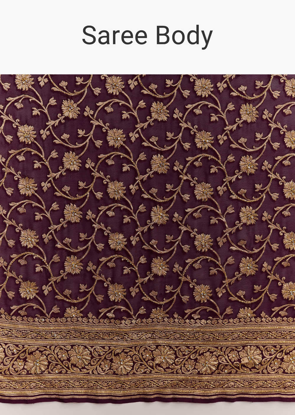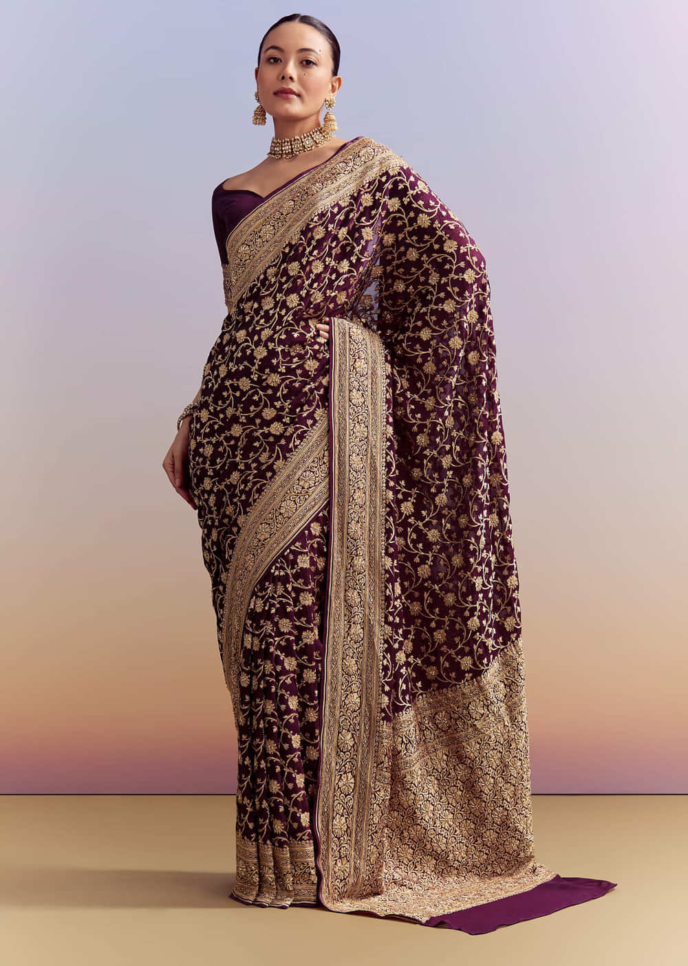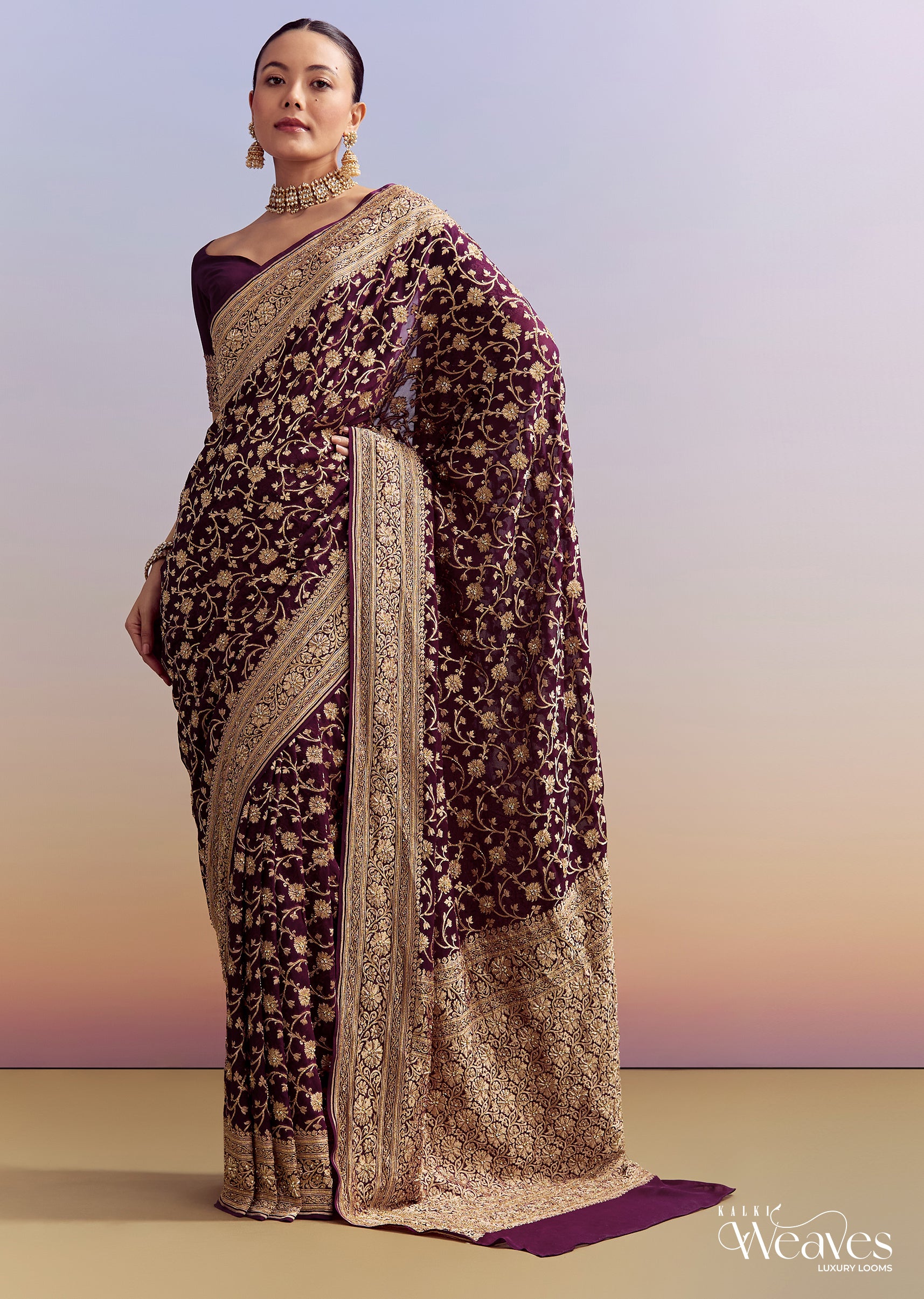 Wine Banarasi Silk Saree With Heavy Zari And Jaal Work