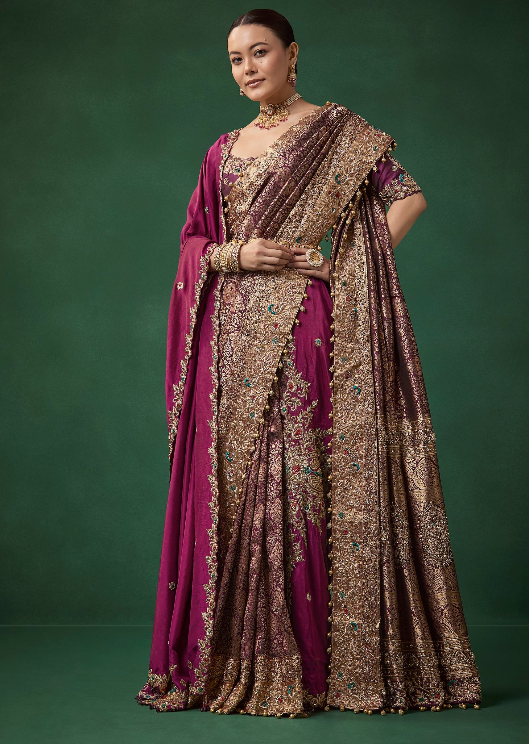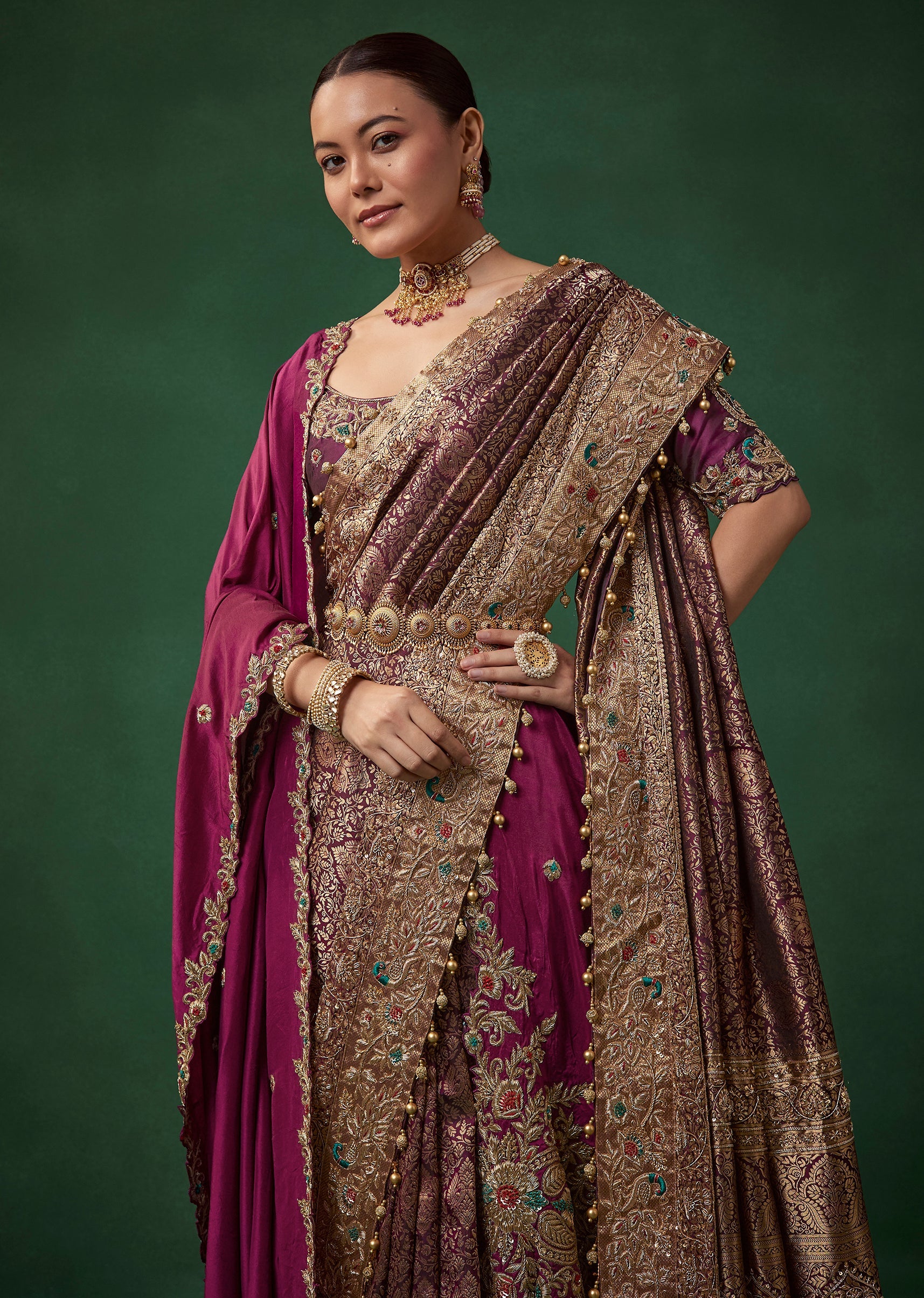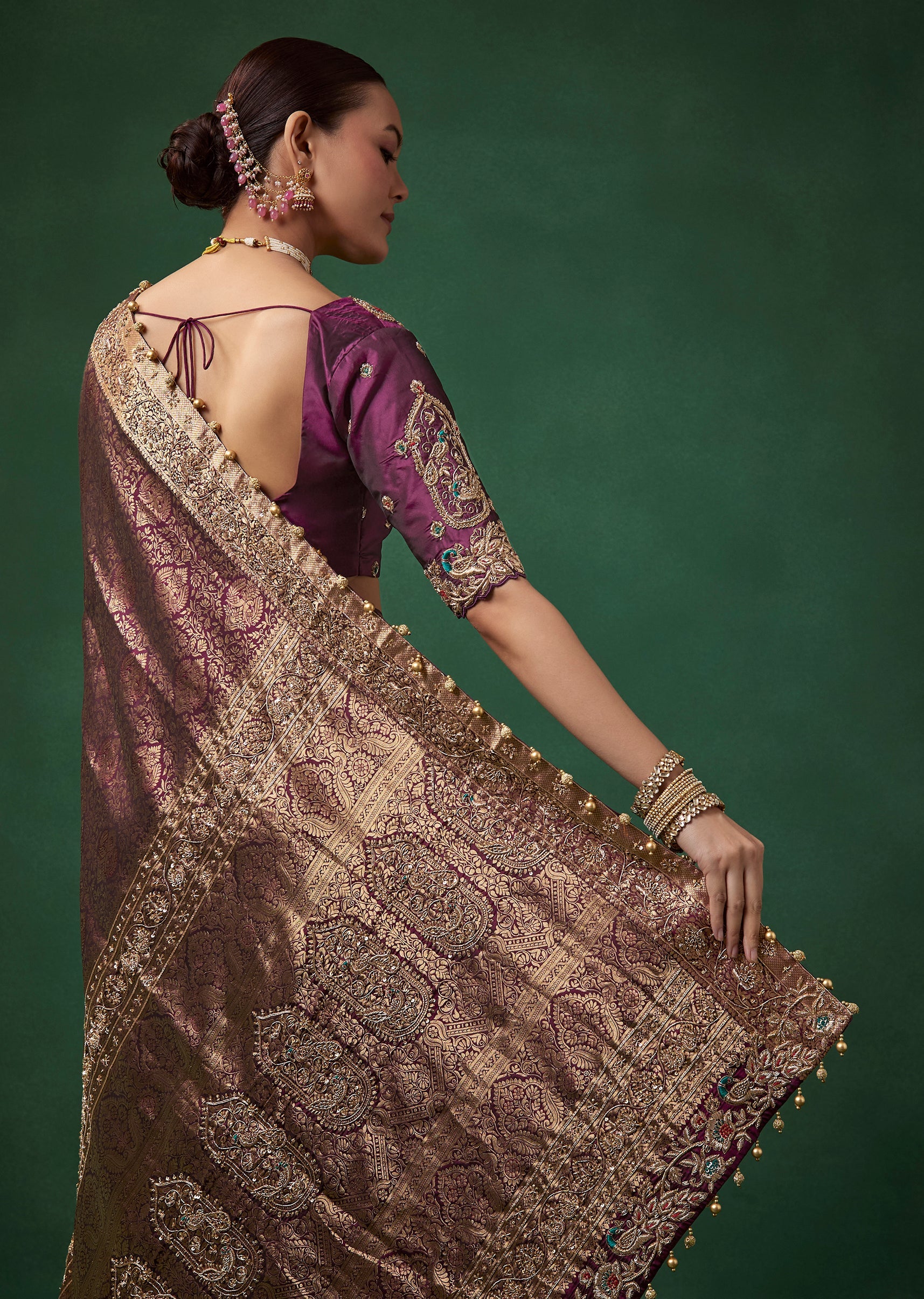 Complement its deep wine tone with antique gold or kundan jewelry, a sleek bun adorned with flowers, and bold glamorous makeup.
