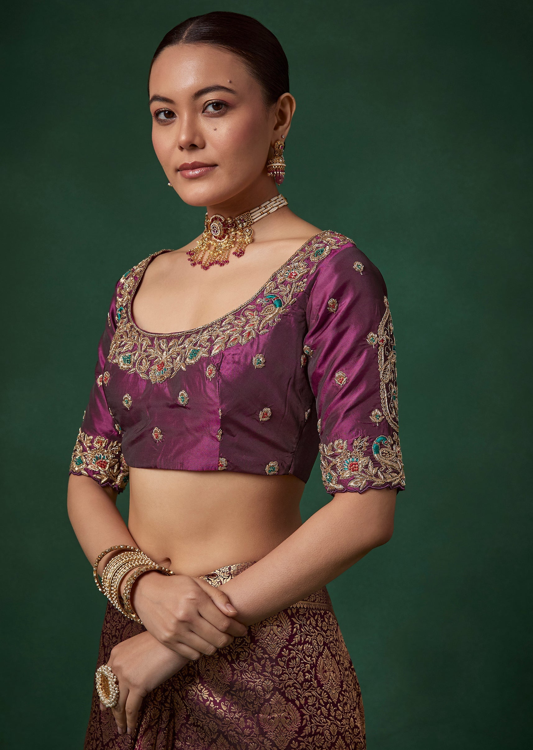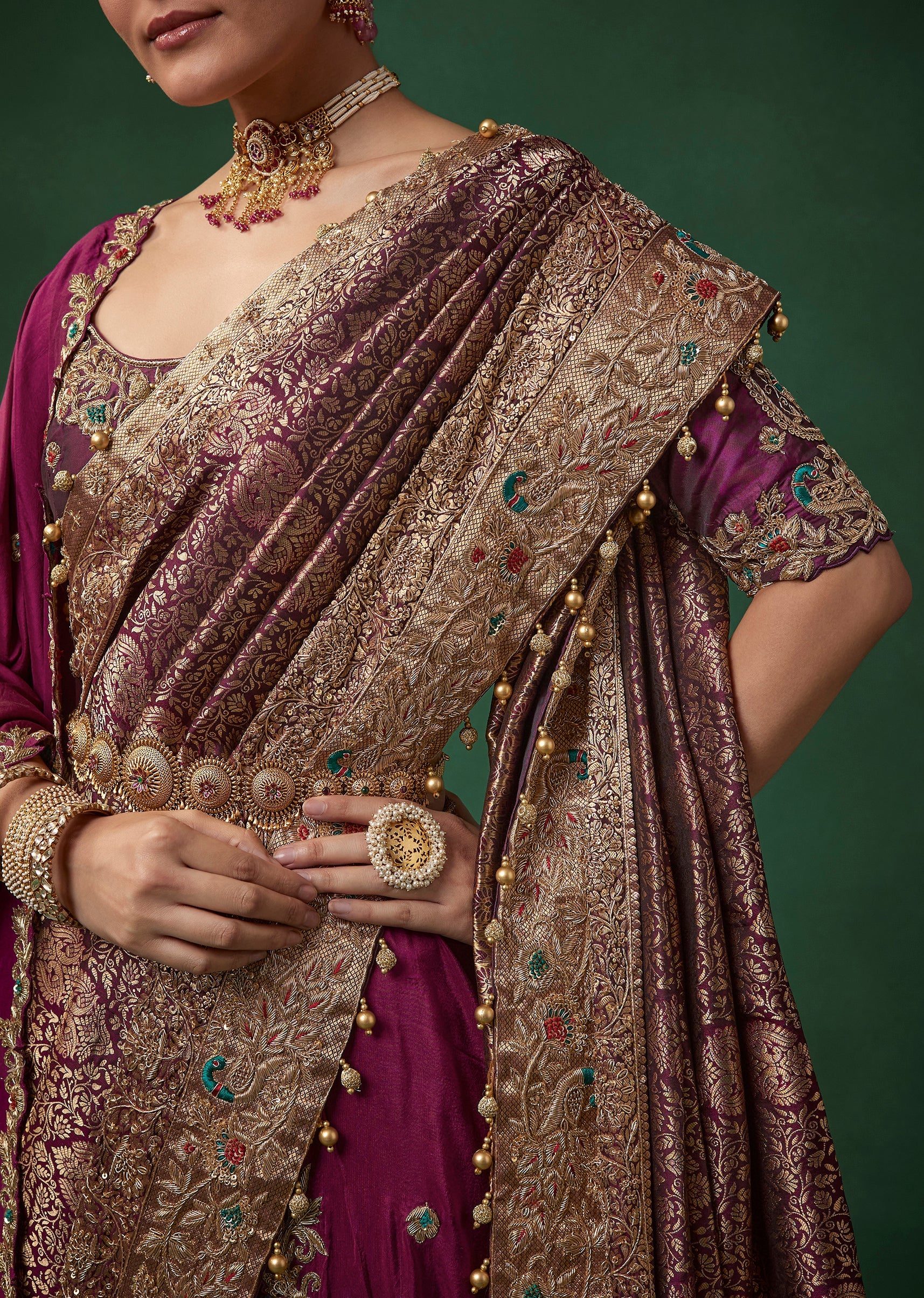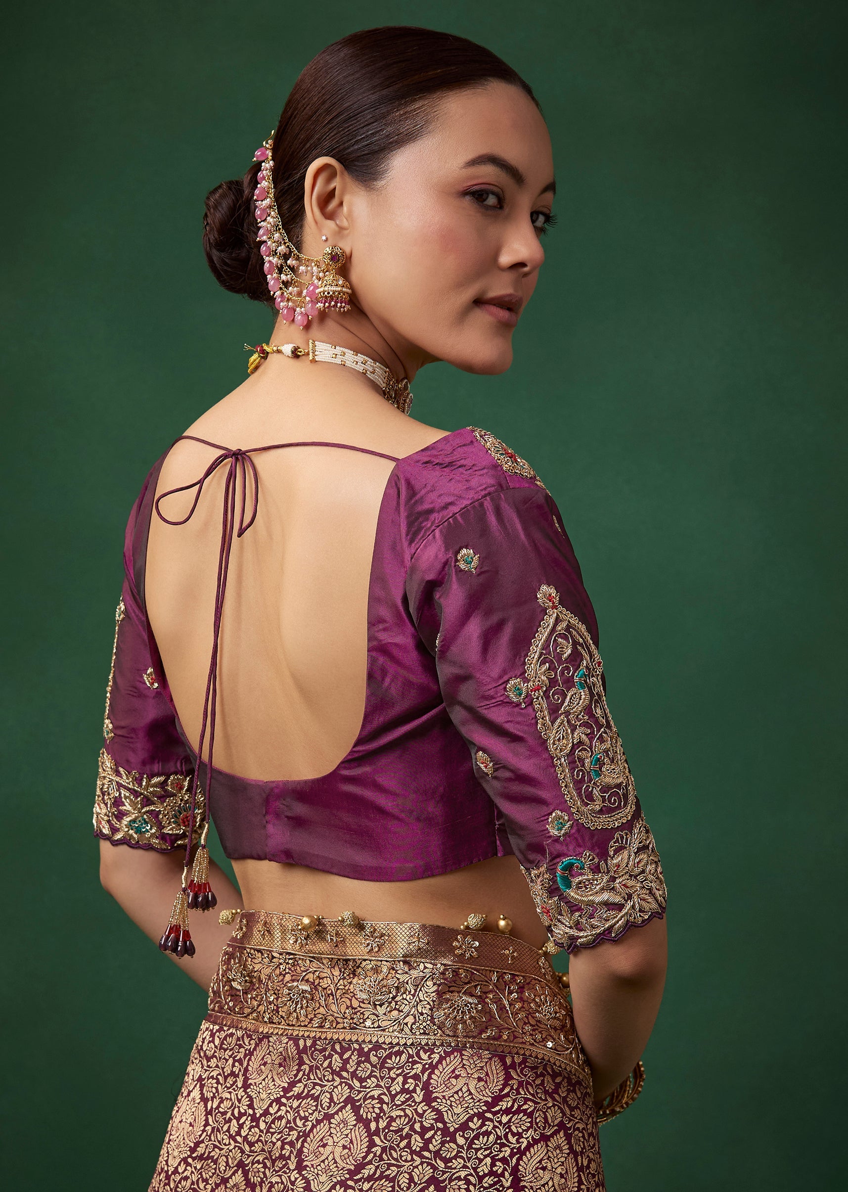 Complement its deep wine tone with antique gold or kundan jewelry, a sleek bun adorned with flowers, and bold glamorous makeup.