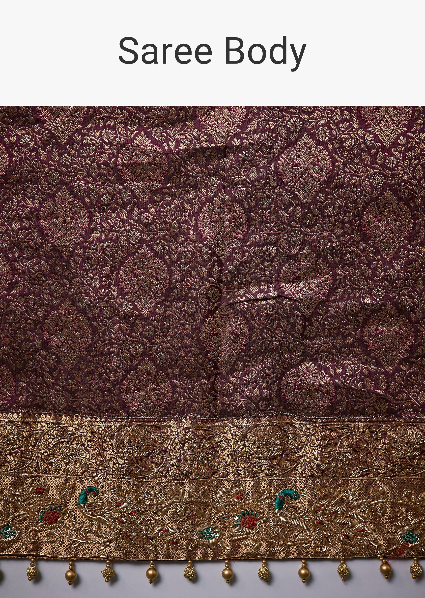 Opulent craftsmanship defines this heavy embroidered Kanjivaram silk saree in a rich wine shade, featuring luxurious zari brocade woven across the drape. The floral border is beautifully highlighted with zardosi, resham thread, sequins, and beads, finished with delicate hanging tassels for an elegant touch. A heavily embroidered pallu and matching blouse fabric complete this grand ensemble, making it an exquisite choice for weddings, receptions, and celebratory occasions. The set includes one saree and one unstitched blouse fabric. Awarded as the Most Trusted Brand, we're delivering styles you love, just as promised.