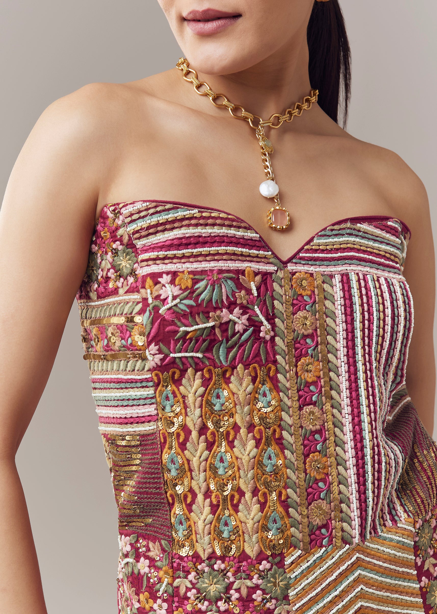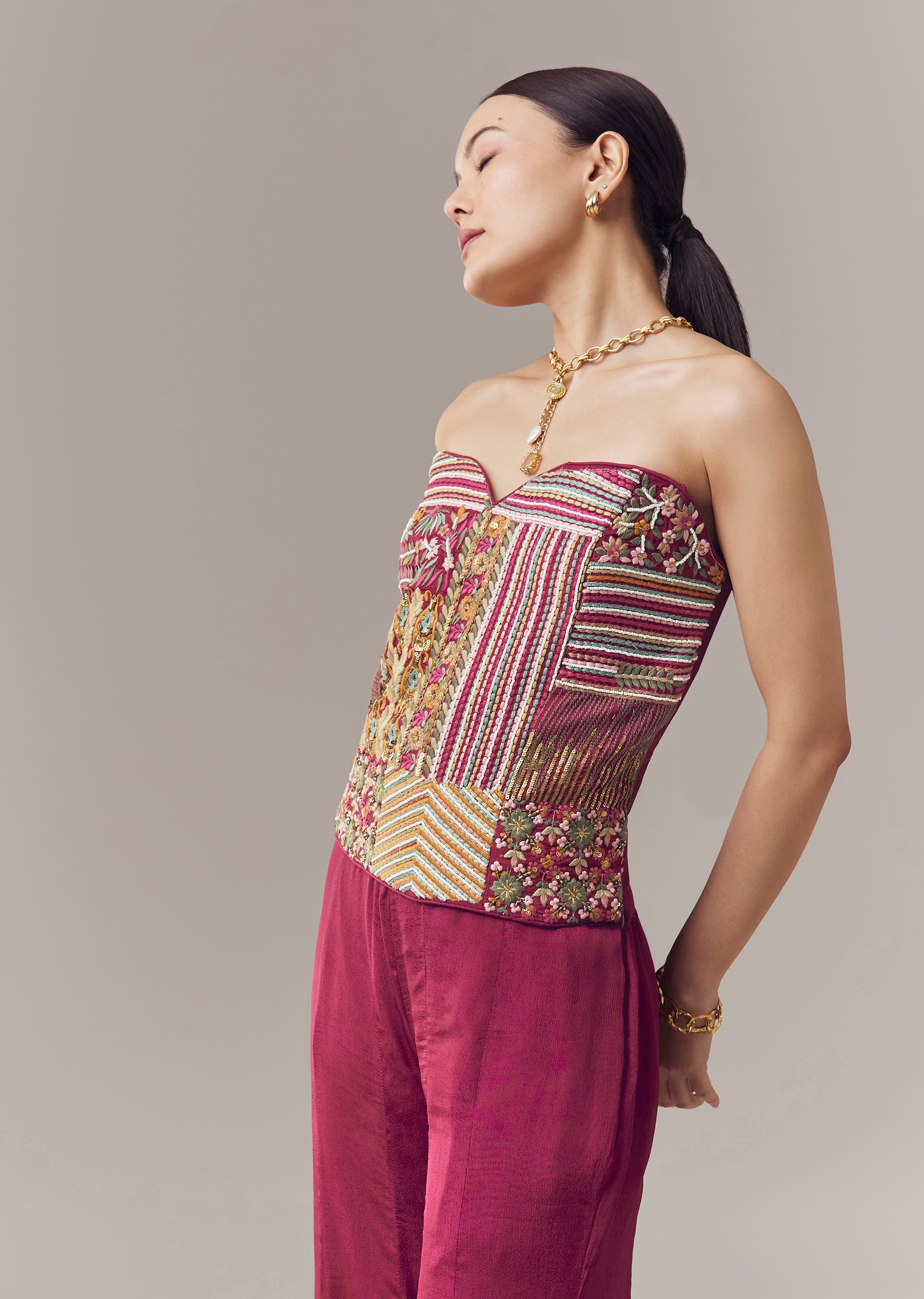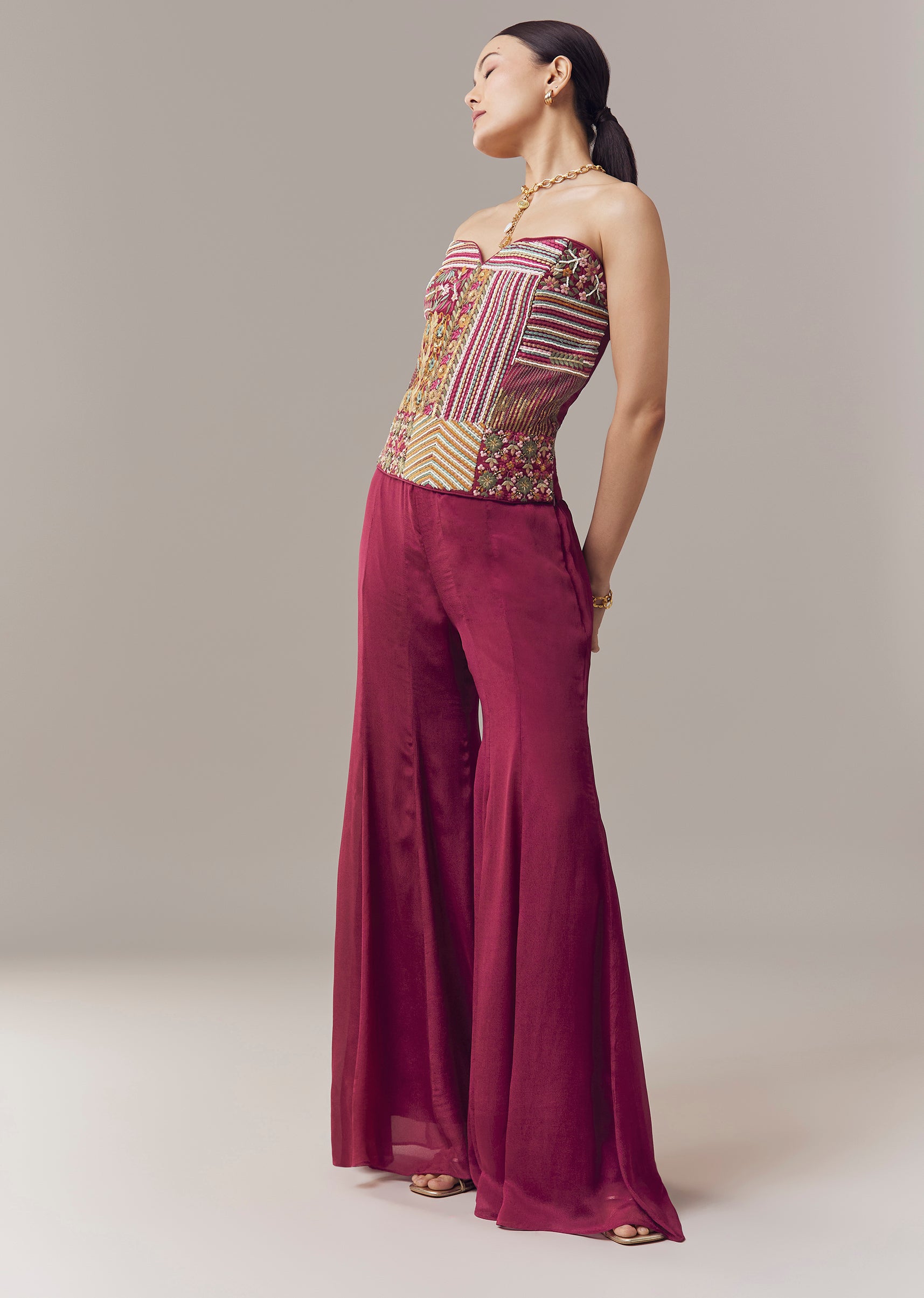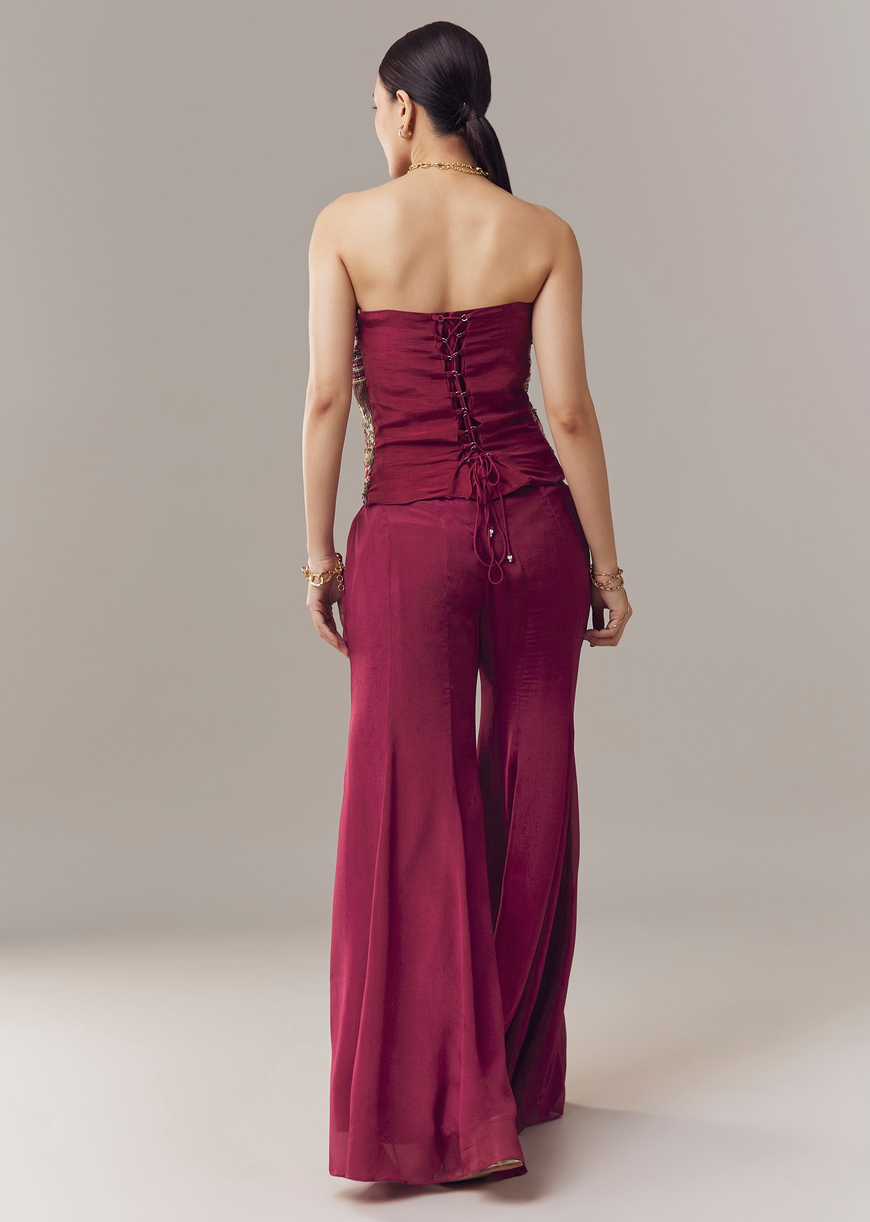 Wine Corset Crop Top And Pants Set With Thread And Sequins Work