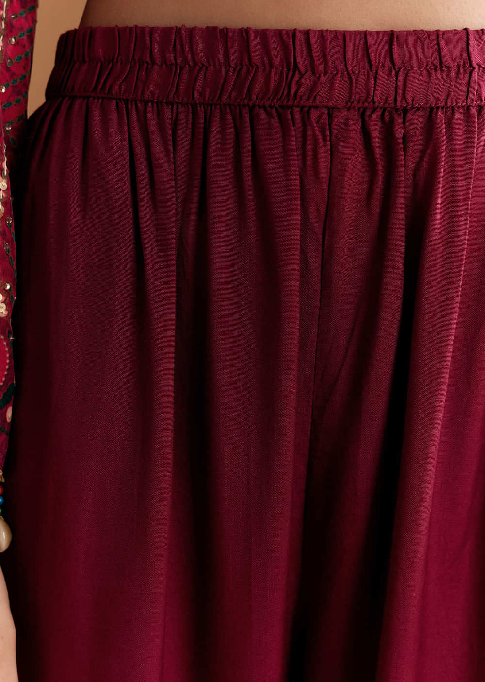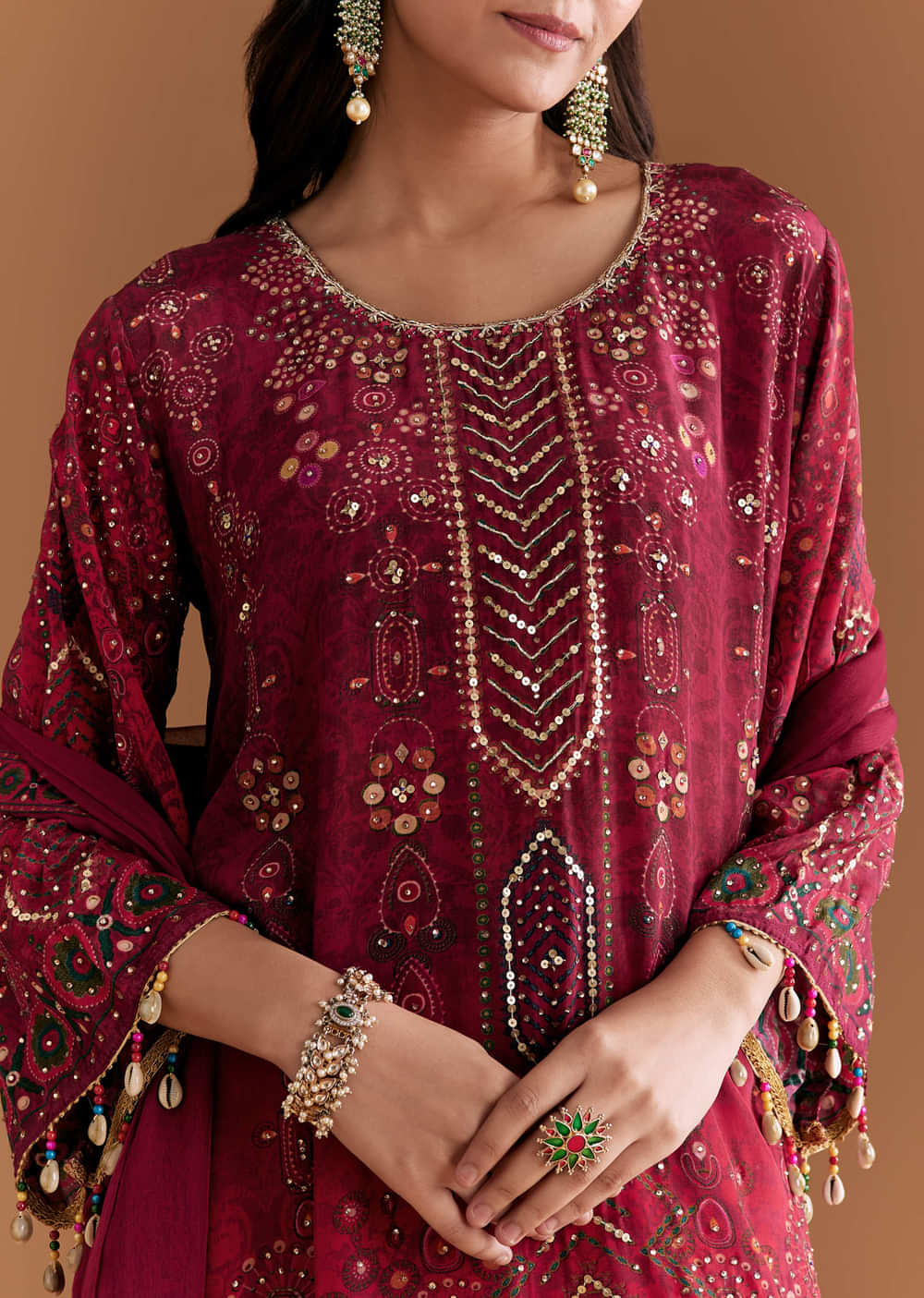 Clean lines lead the look while this wine crepe printed kurta set uses precise stone work to lift the print without crowding it. The crepe feels light and falls straight,... More Product Details