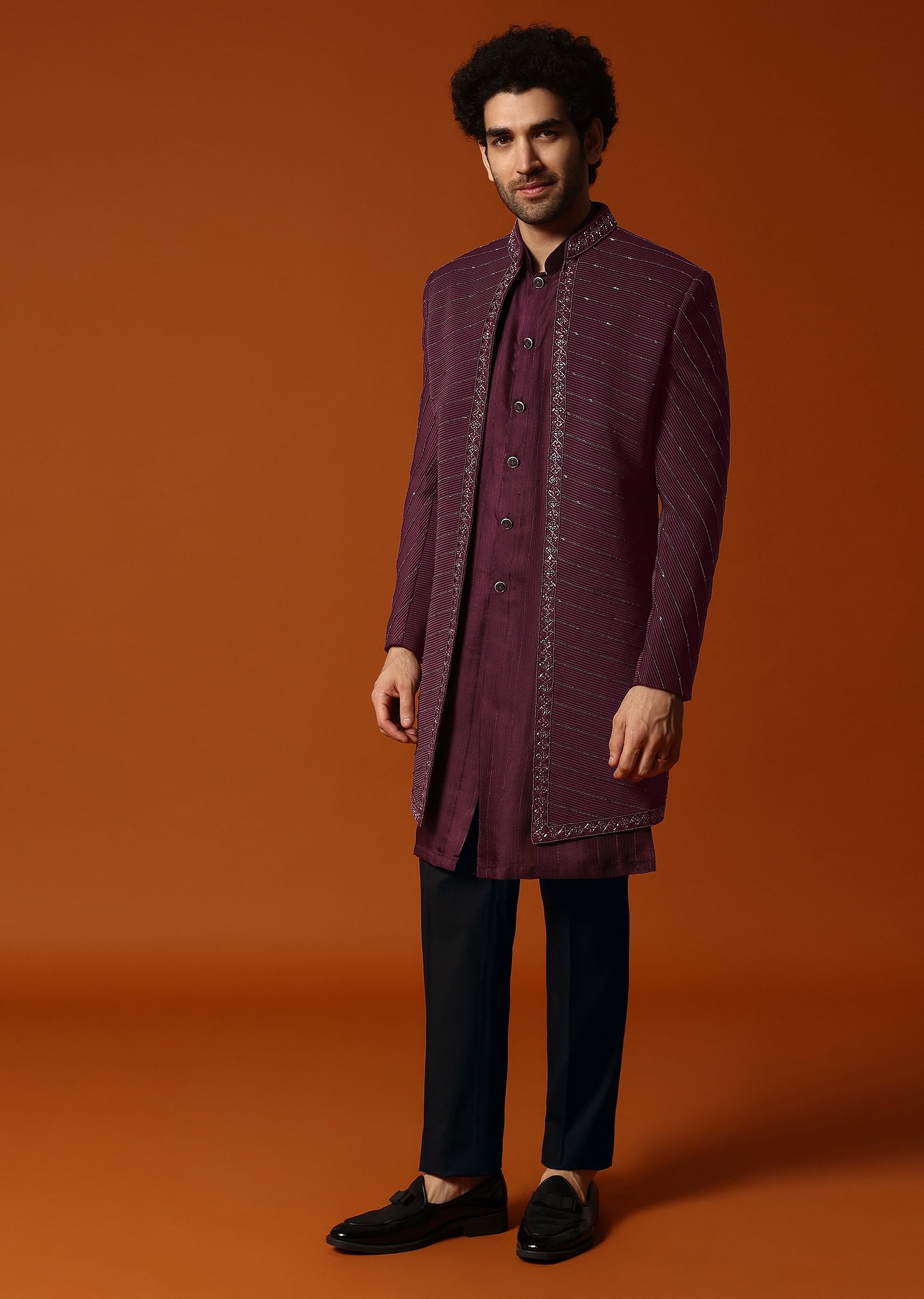 Shine brilliantly in the limelight with our wine sherwani set, specifically crafted for sangeet and wedding functions. This set is made from terry rayon fabric and embellished with cutdana embroidery. The sherwani comes paired with a kurta and a bottom for a complete ensemble. Awarded as the Most Trusted Brand, we're delivering styles you love, just as promised.