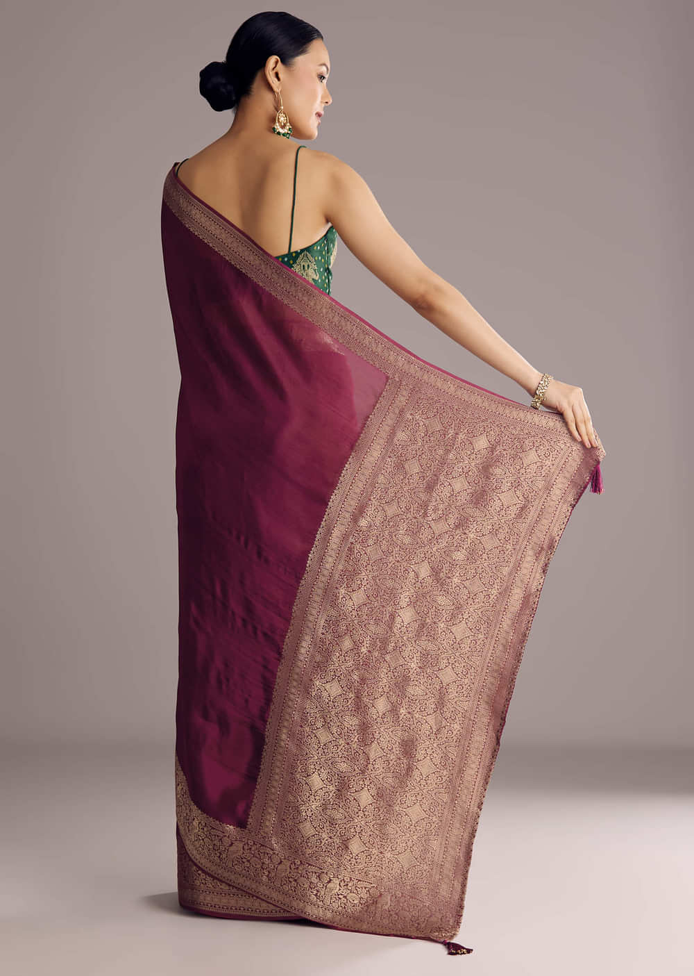 Rich and refined, this wine-colored Dola silk saree is woven to perfection with a subtle yet intricate border and pallu. Its deep hue and elegant drape make it ideal for... More Product Details