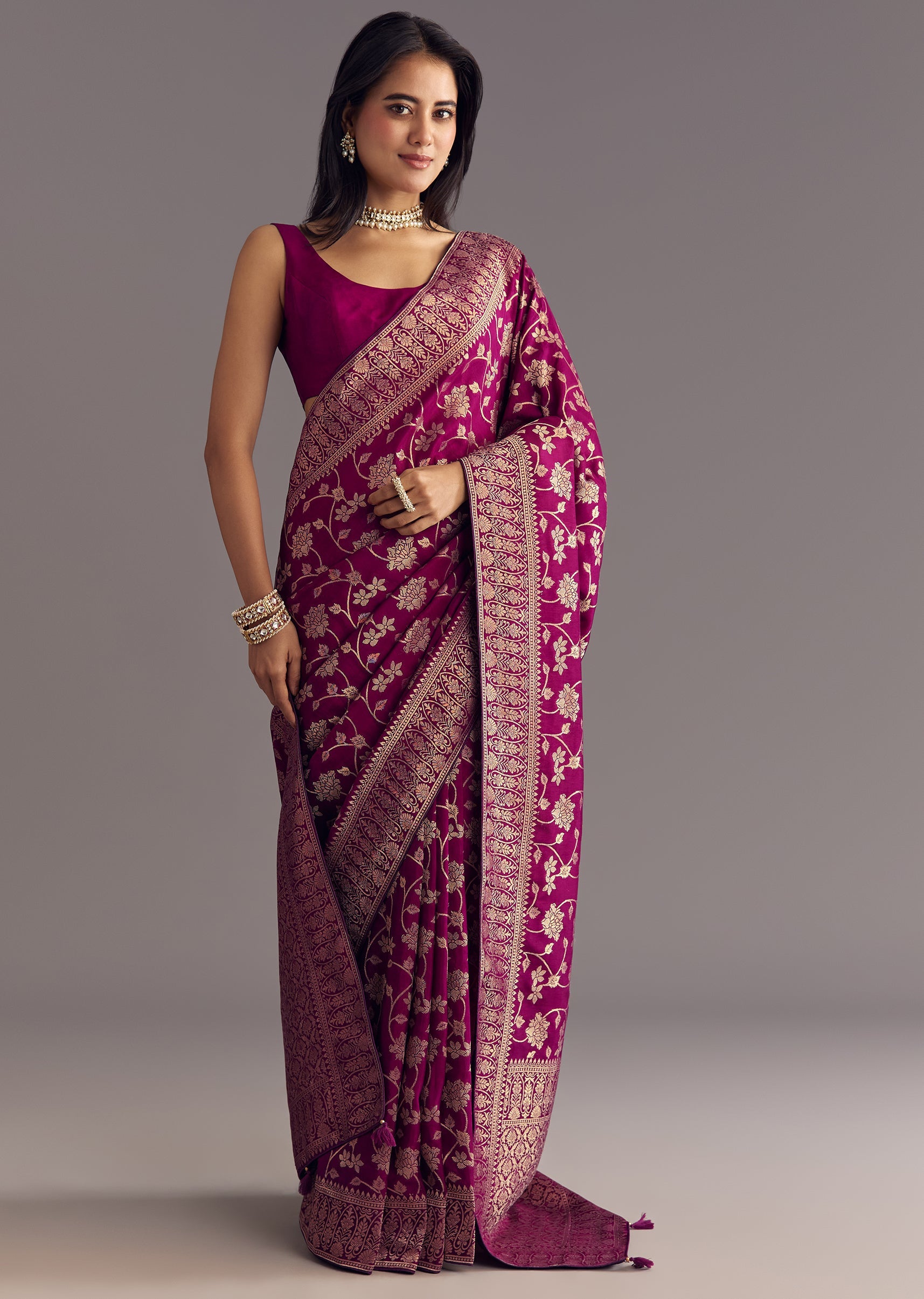 Fit Tips:Heavy zari works best with structured pleats.