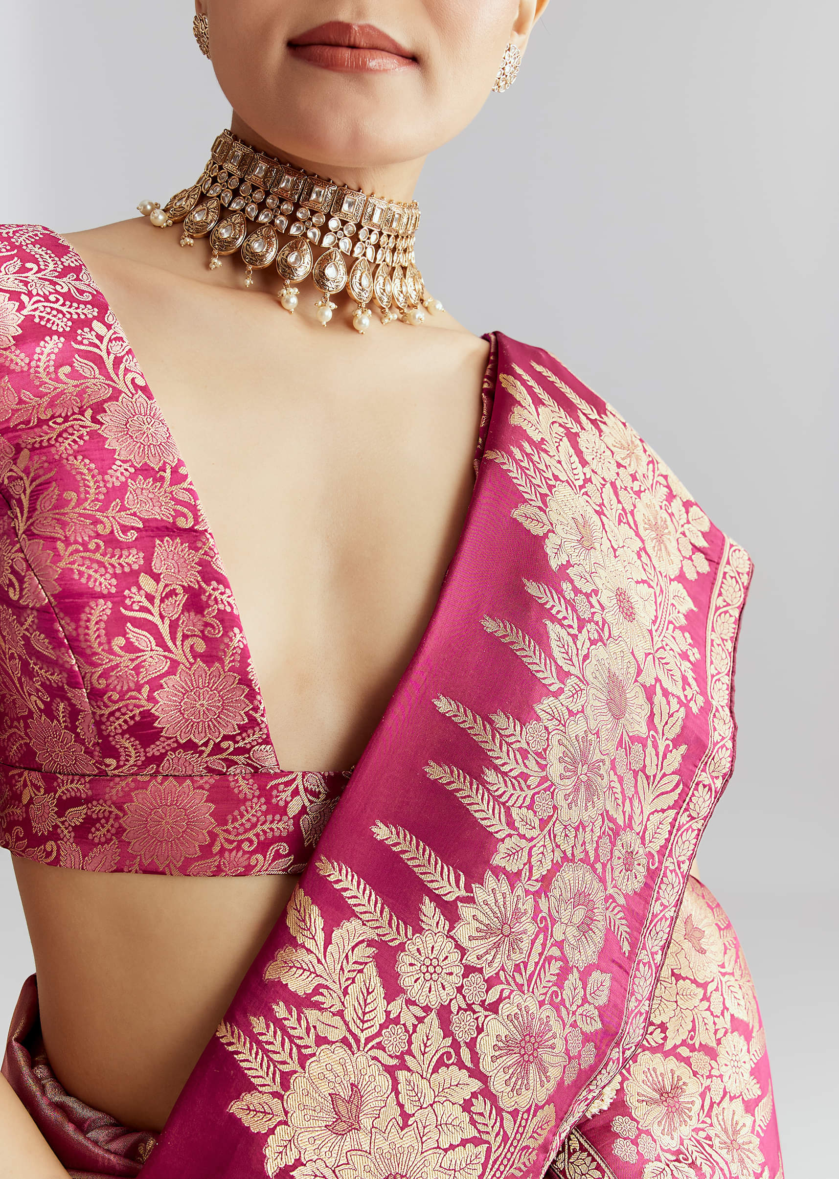 In layered wine tones, this wine dola silk woven saree shifts from a soft base into a deeper floral border for a mellow evening glow. Zari butti scatter the body... More Product Details