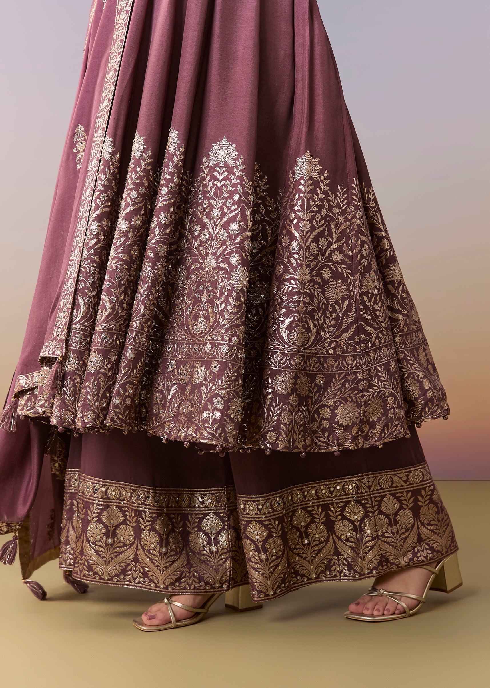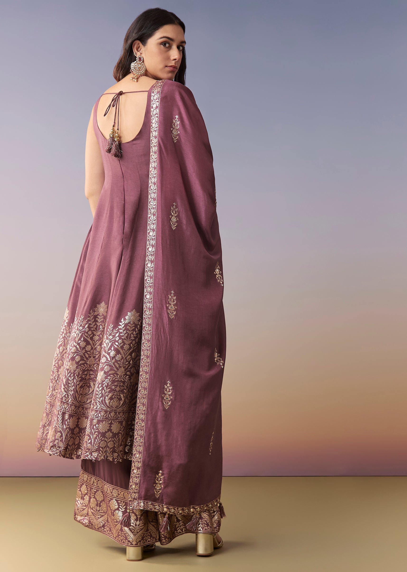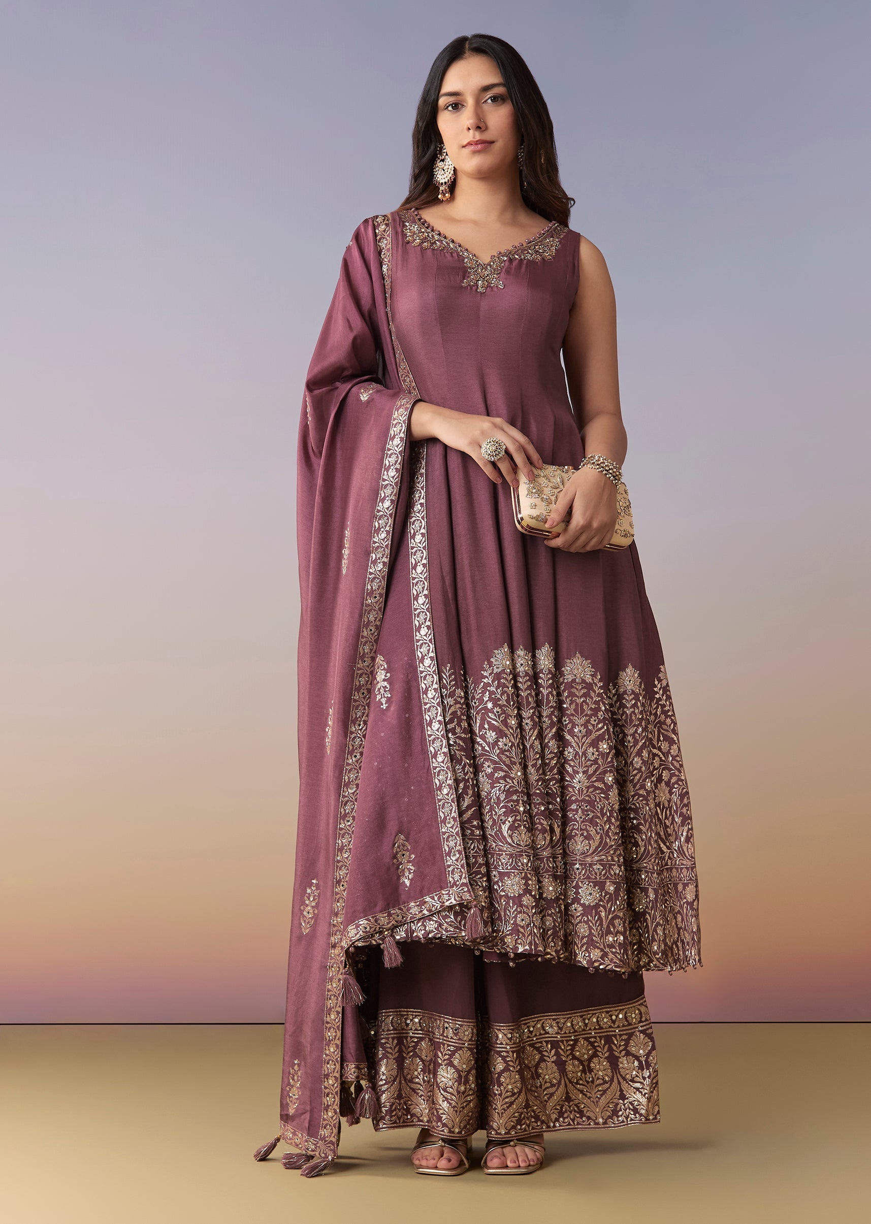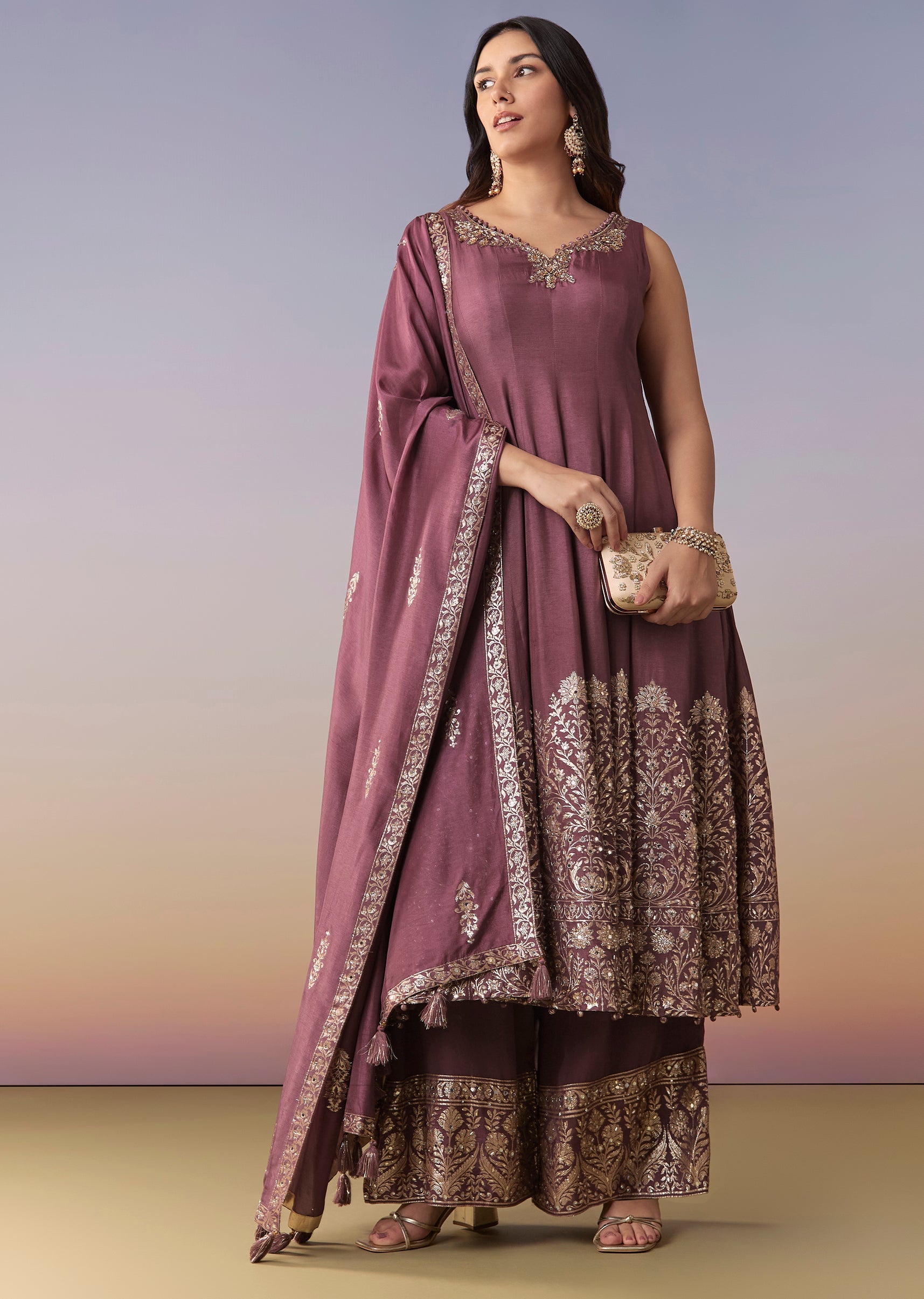 Wine Embellished Anarkali Suit Set With Pant And Dupatta