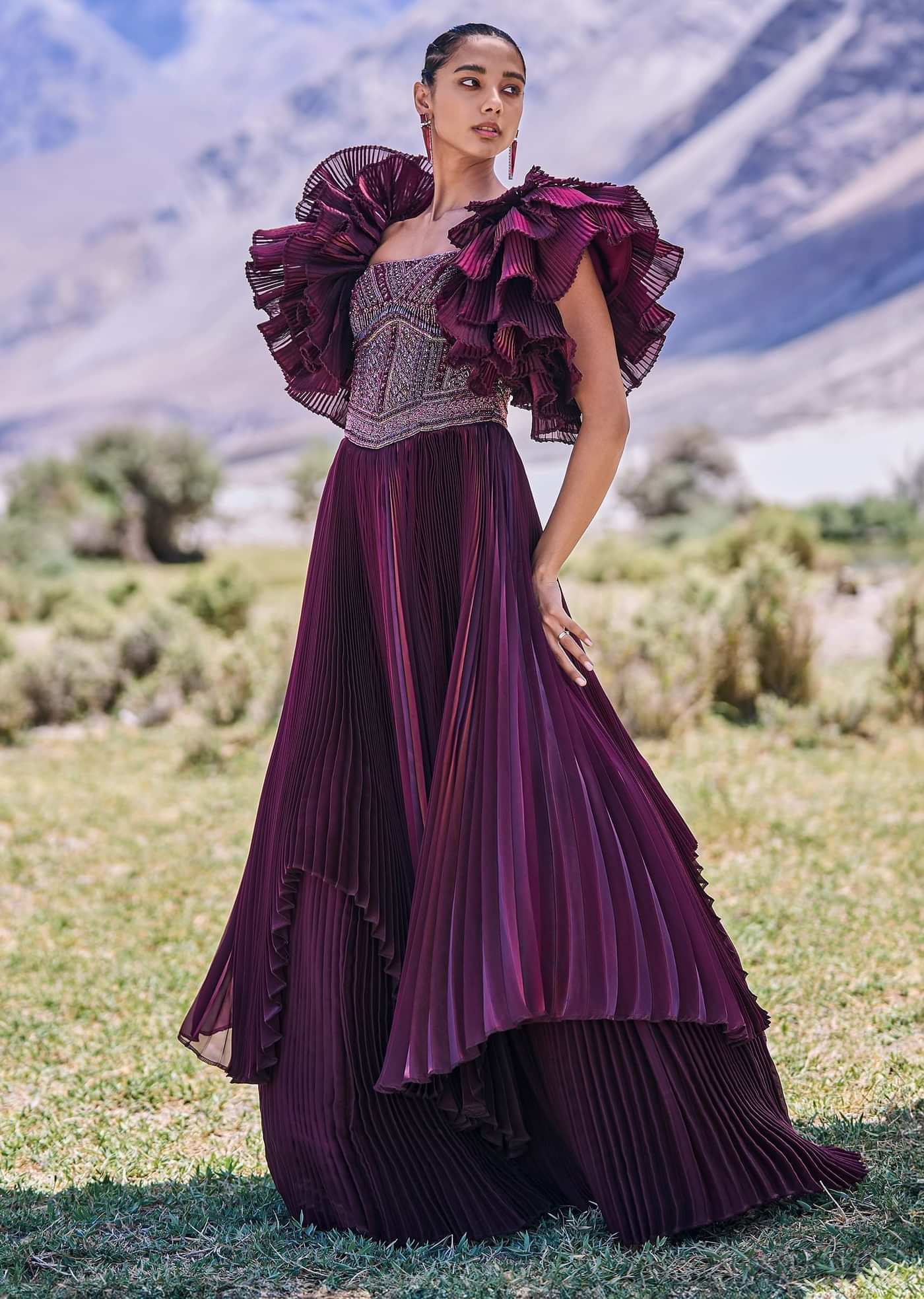 Wine Embroidered Flared Pleated Gown With Ruffle Sleeves