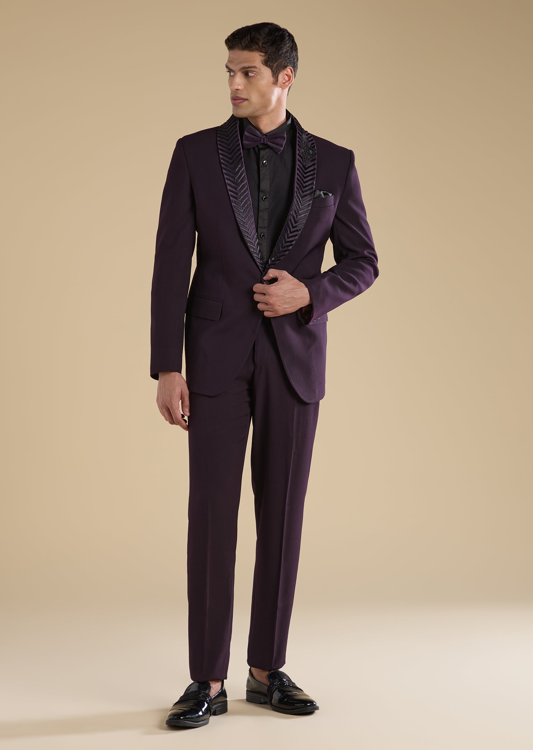 Wine Embroidered Tuxedo Set With Bow Shirt And Trousers