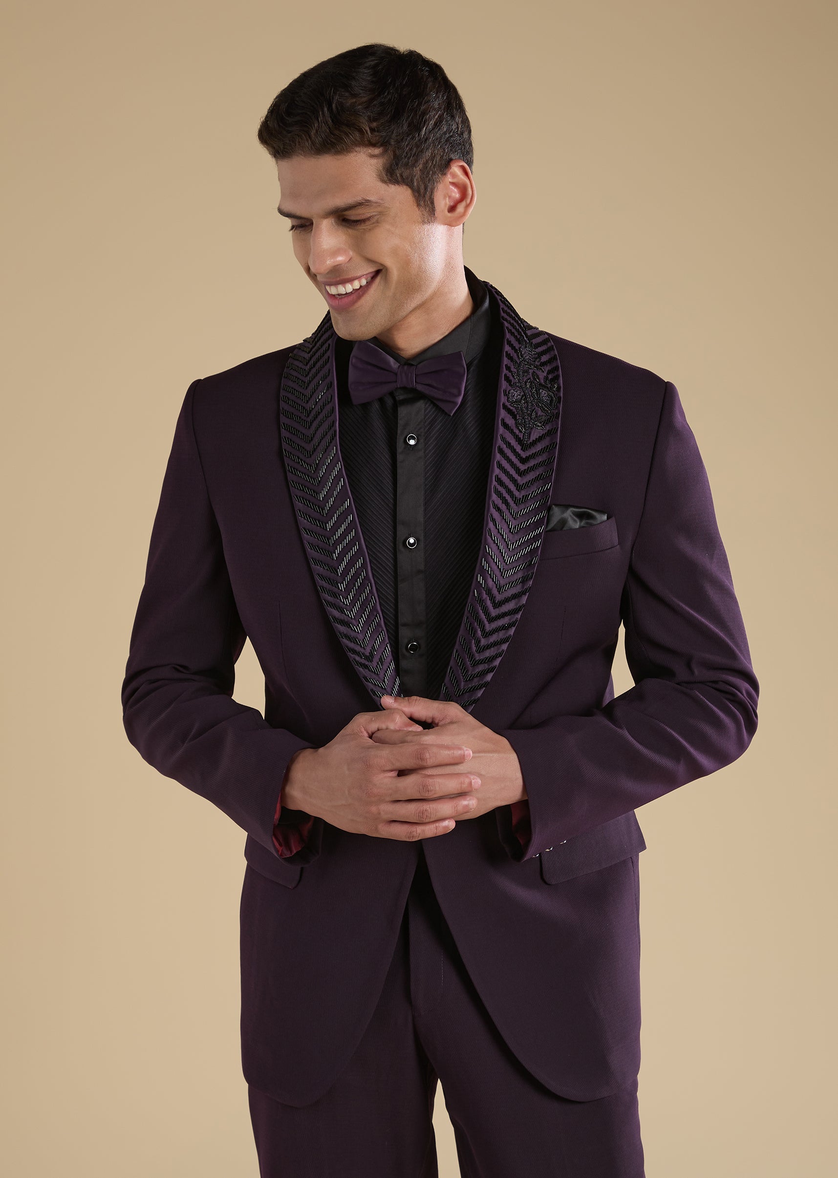 Crafted in polyester, this wine tuxedo set features bead and cut dana detailing for a statement finish. Designed with a mandarin collar, full sleeves and front button closure, it comes with a bow, shirt and straight-fit mid-waist trousers—perfect for cocktail and reception nights. Awarded as the Most Trusted Brand, we're delivering styles you love, just as promised.