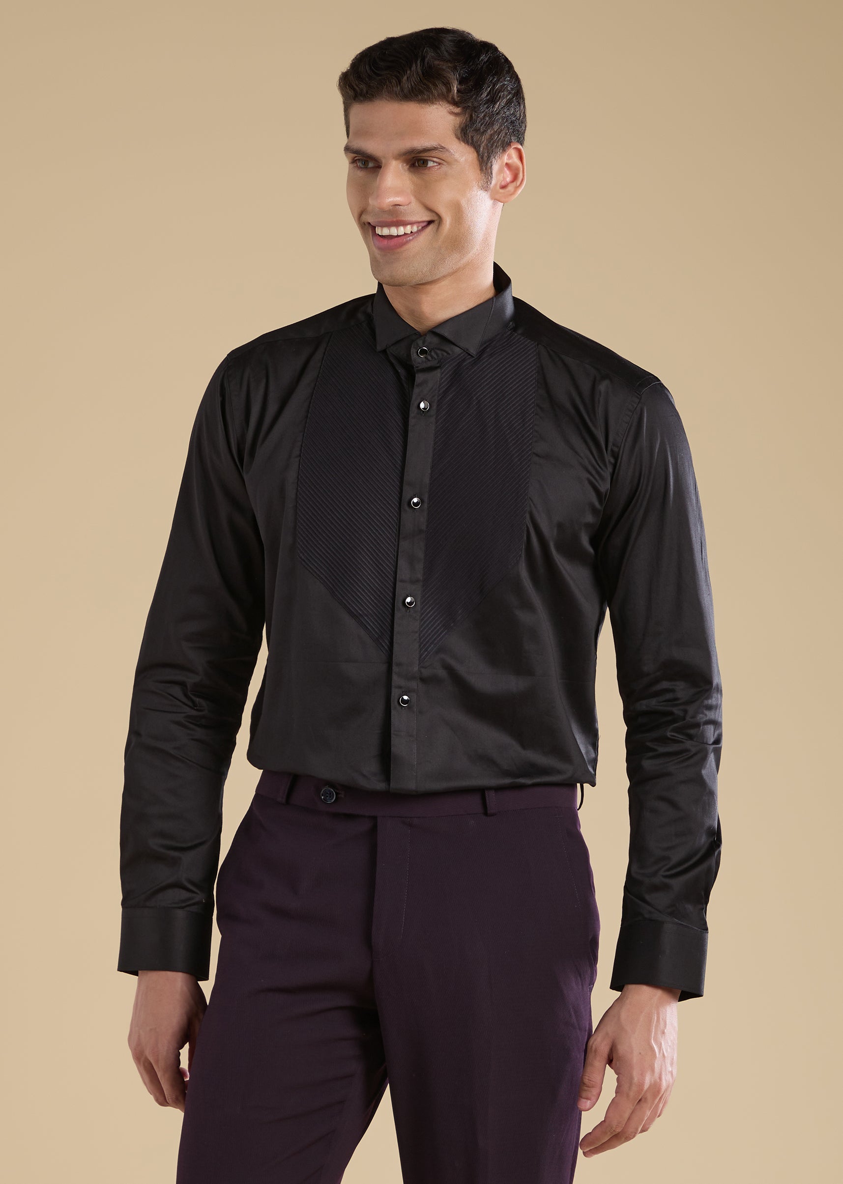Finish with black formal shoes for a sharp look.